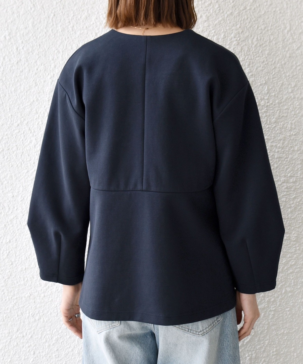 すっきりとしたVネックと、切替位置が高いペプラムでスタイルアップ見えが叶うアイテムです。