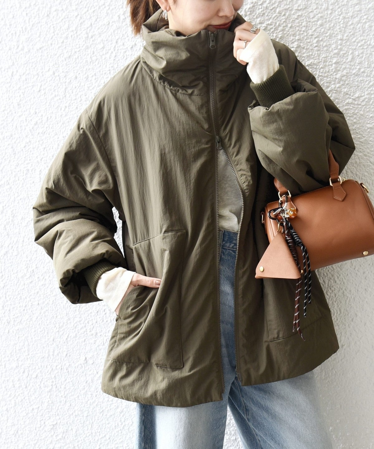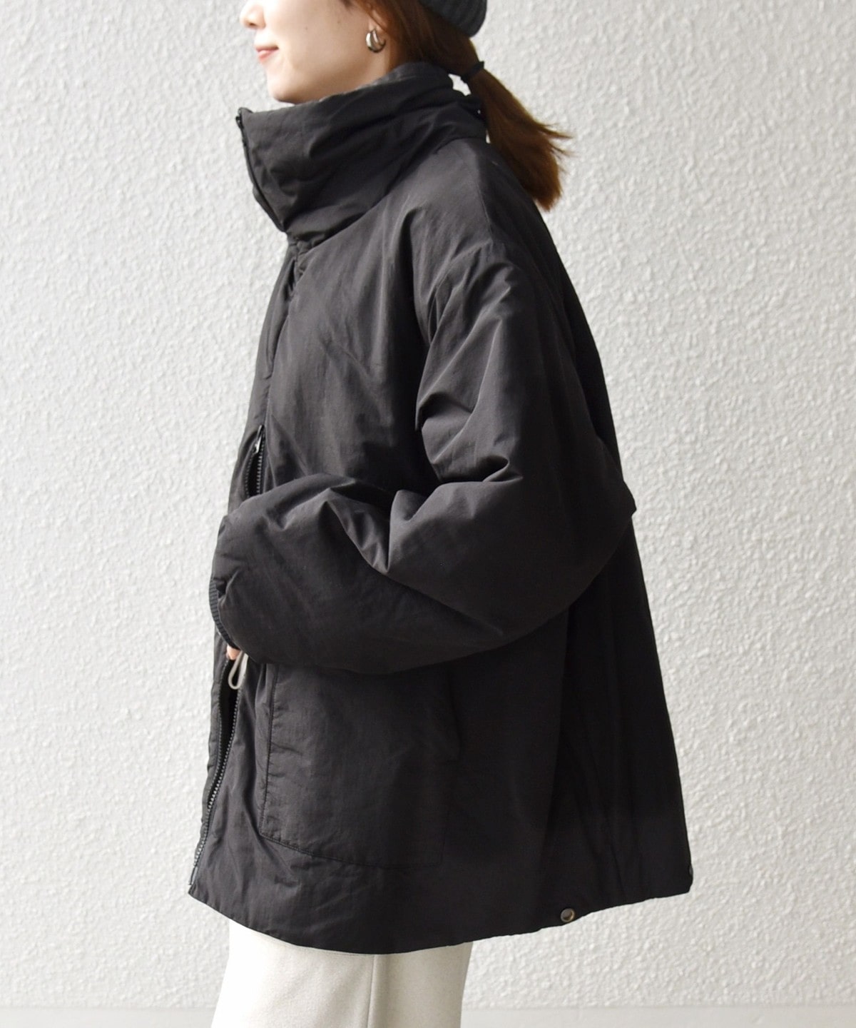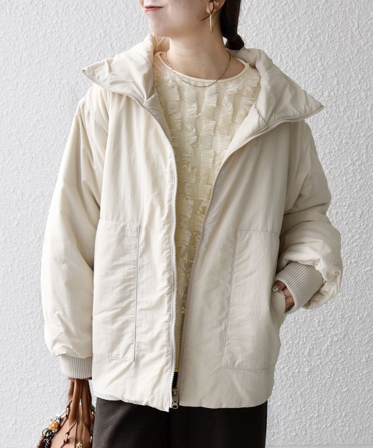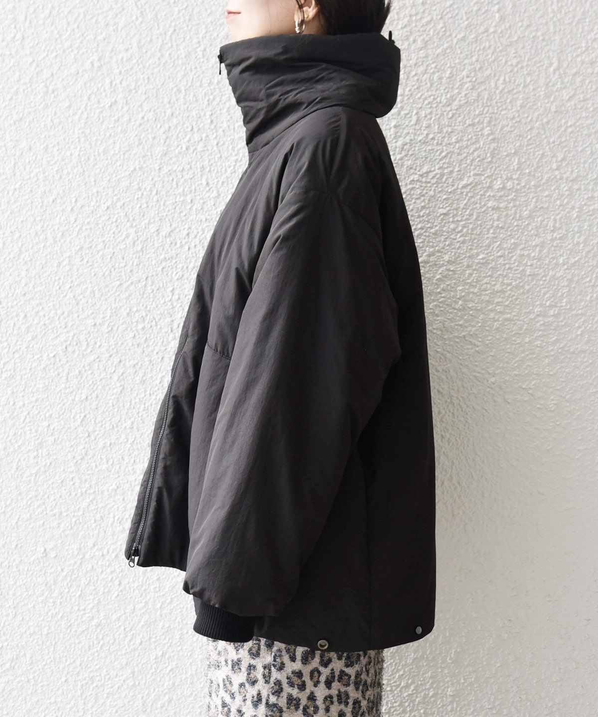 ボリュームのある高めのスタンドネックがポイントの中綿ブルゾン。