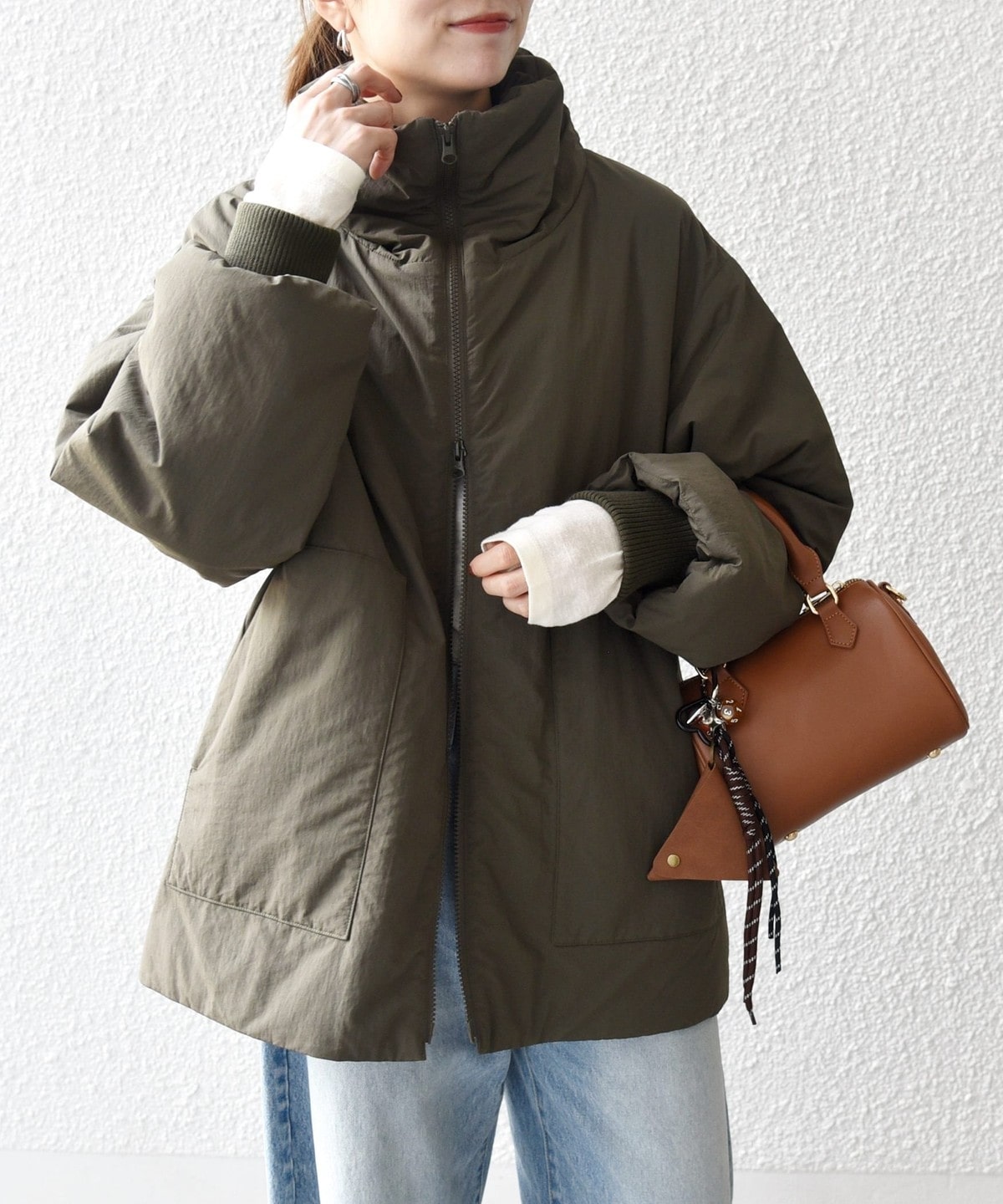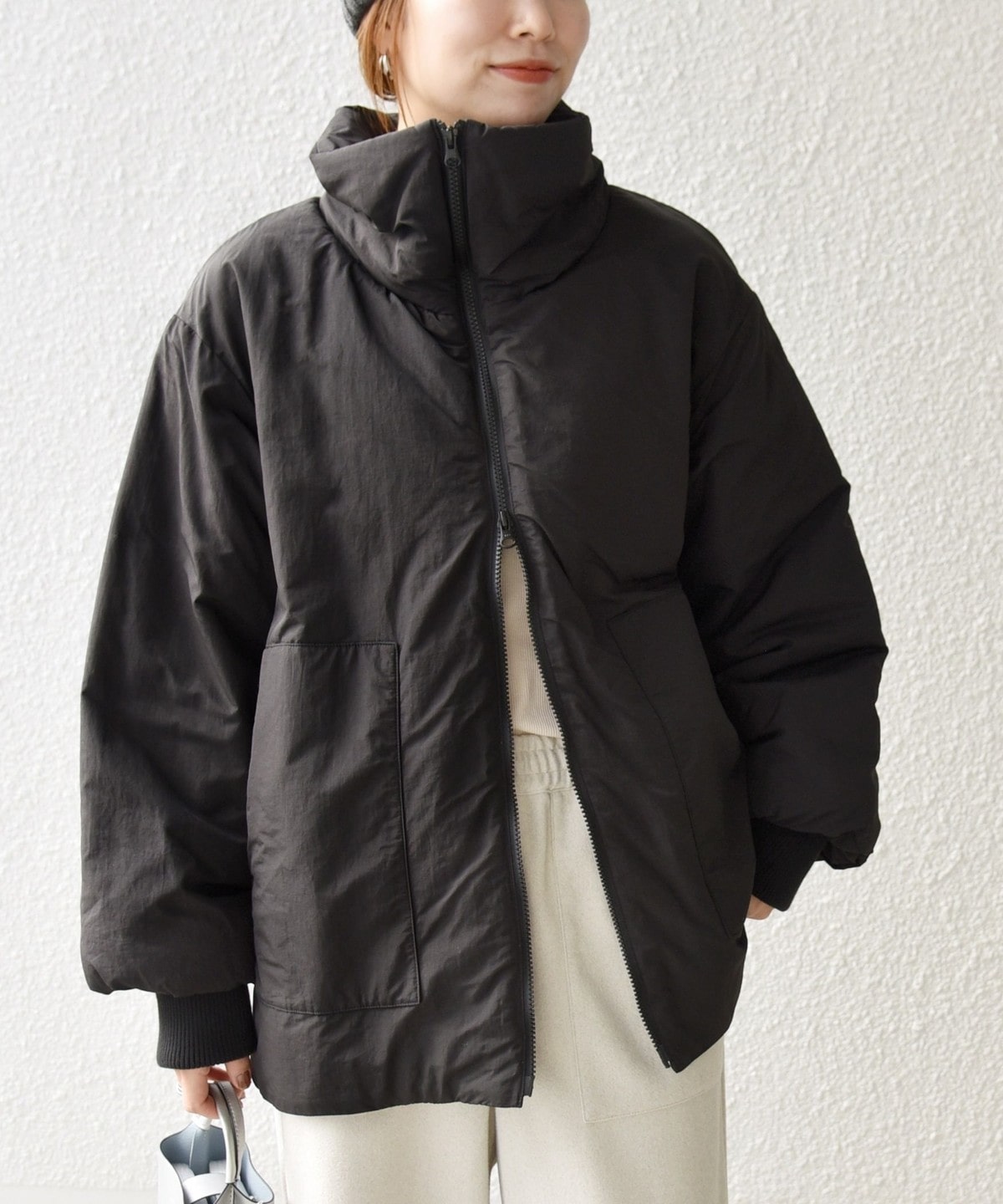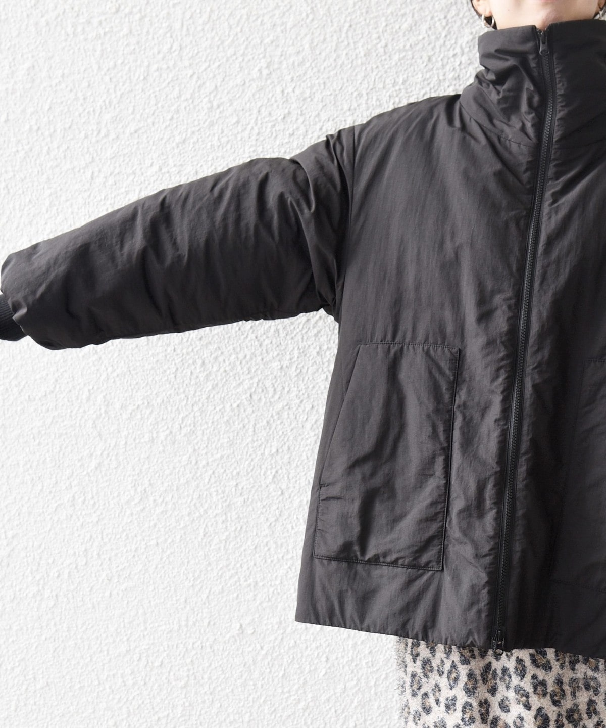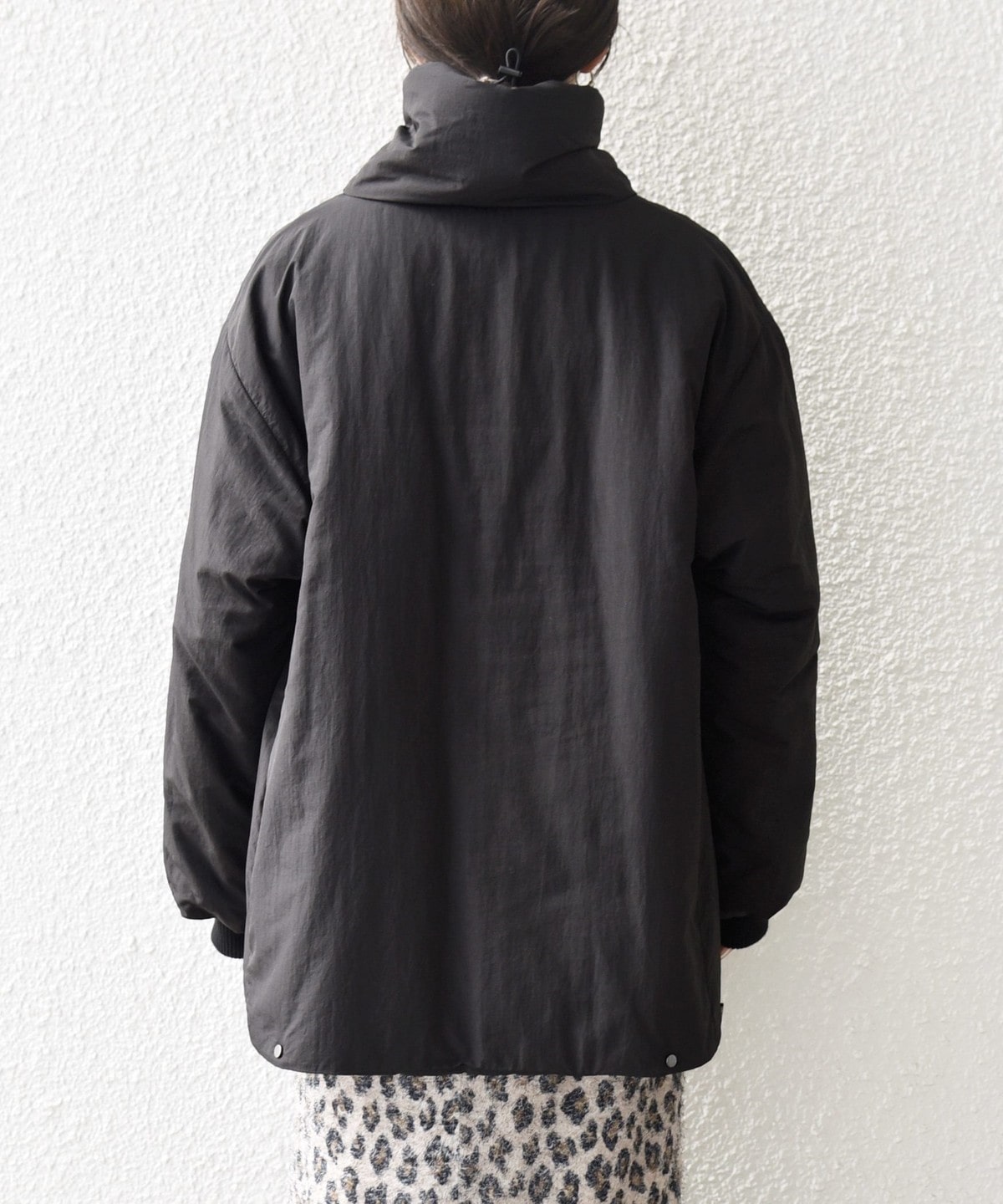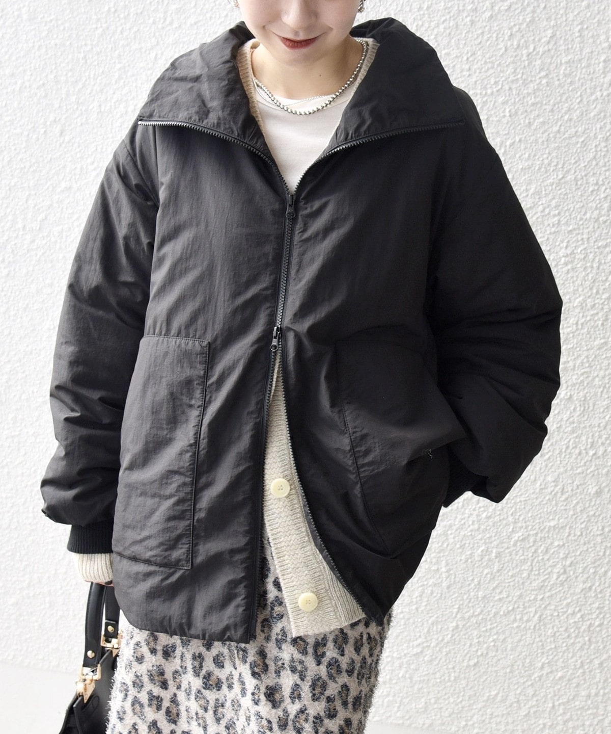 ボリュームのある高めのスタンドネックがポイントの中綿ブルゾン。