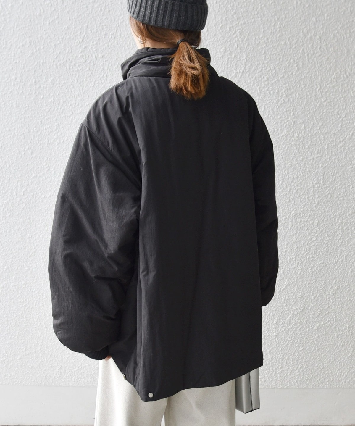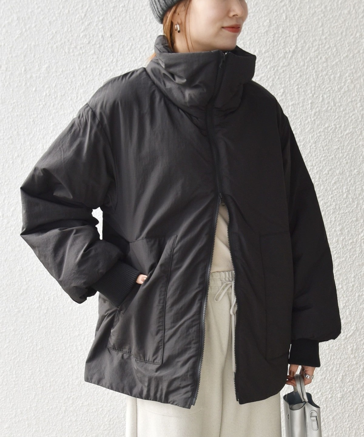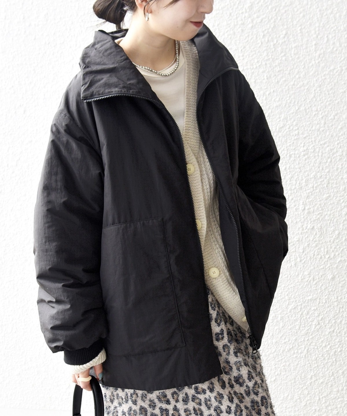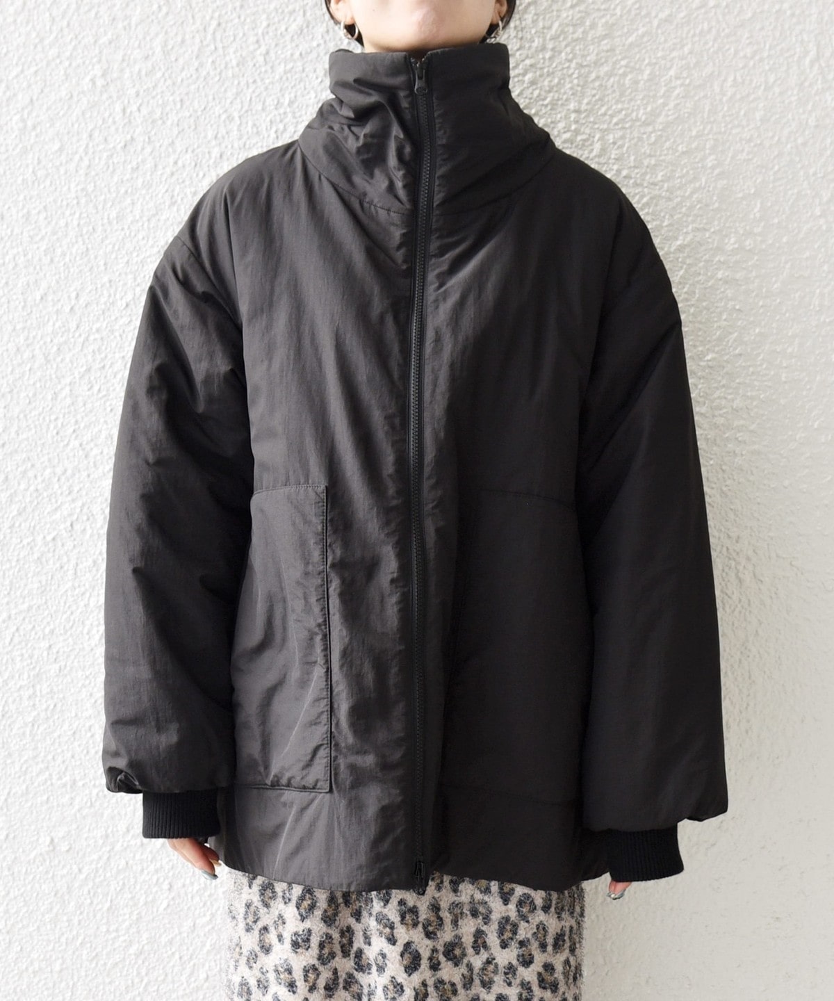 ボリュームのある高めのスタンドネックがポイントの中綿ブルゾン。