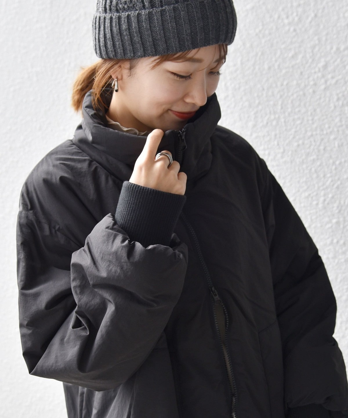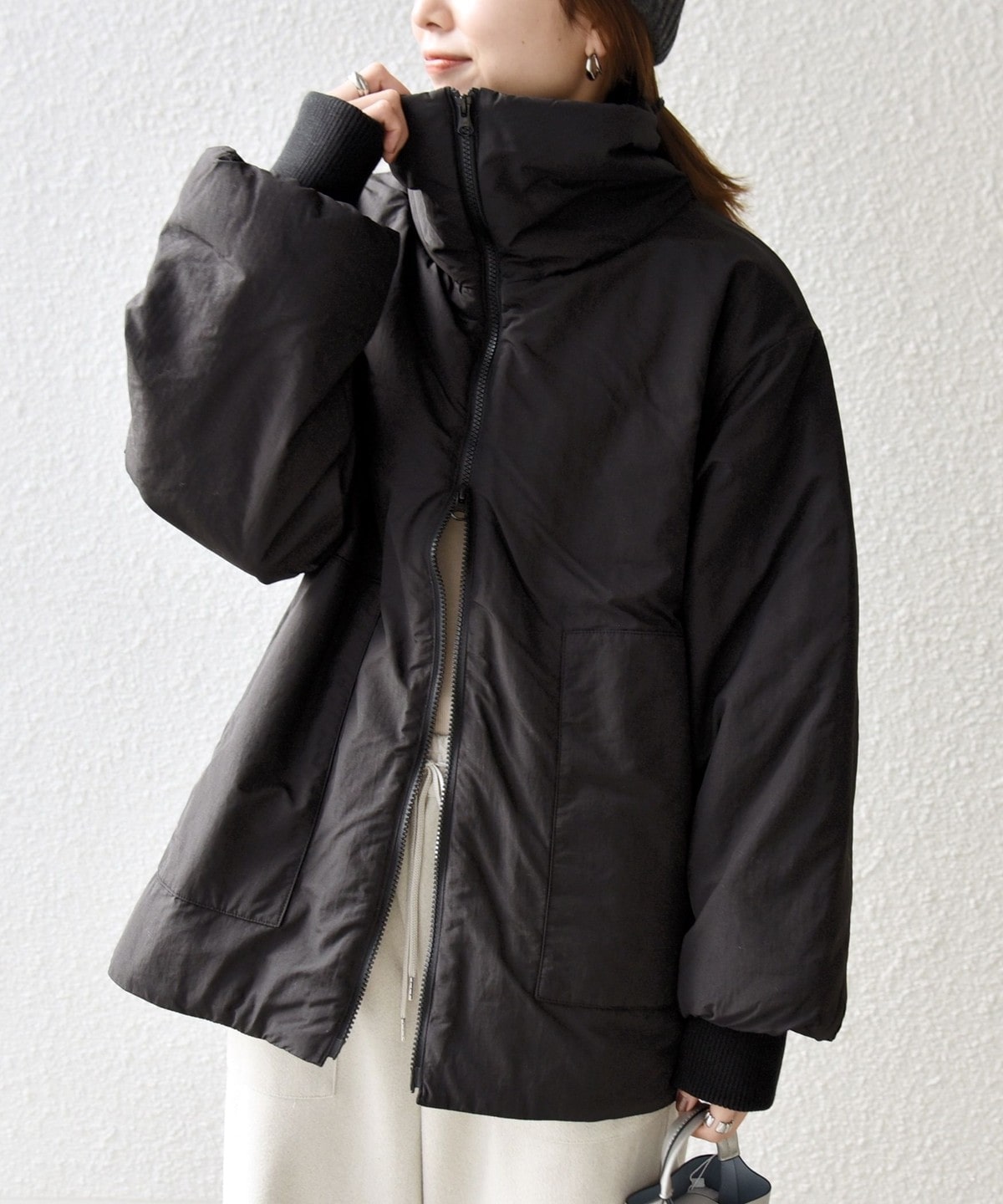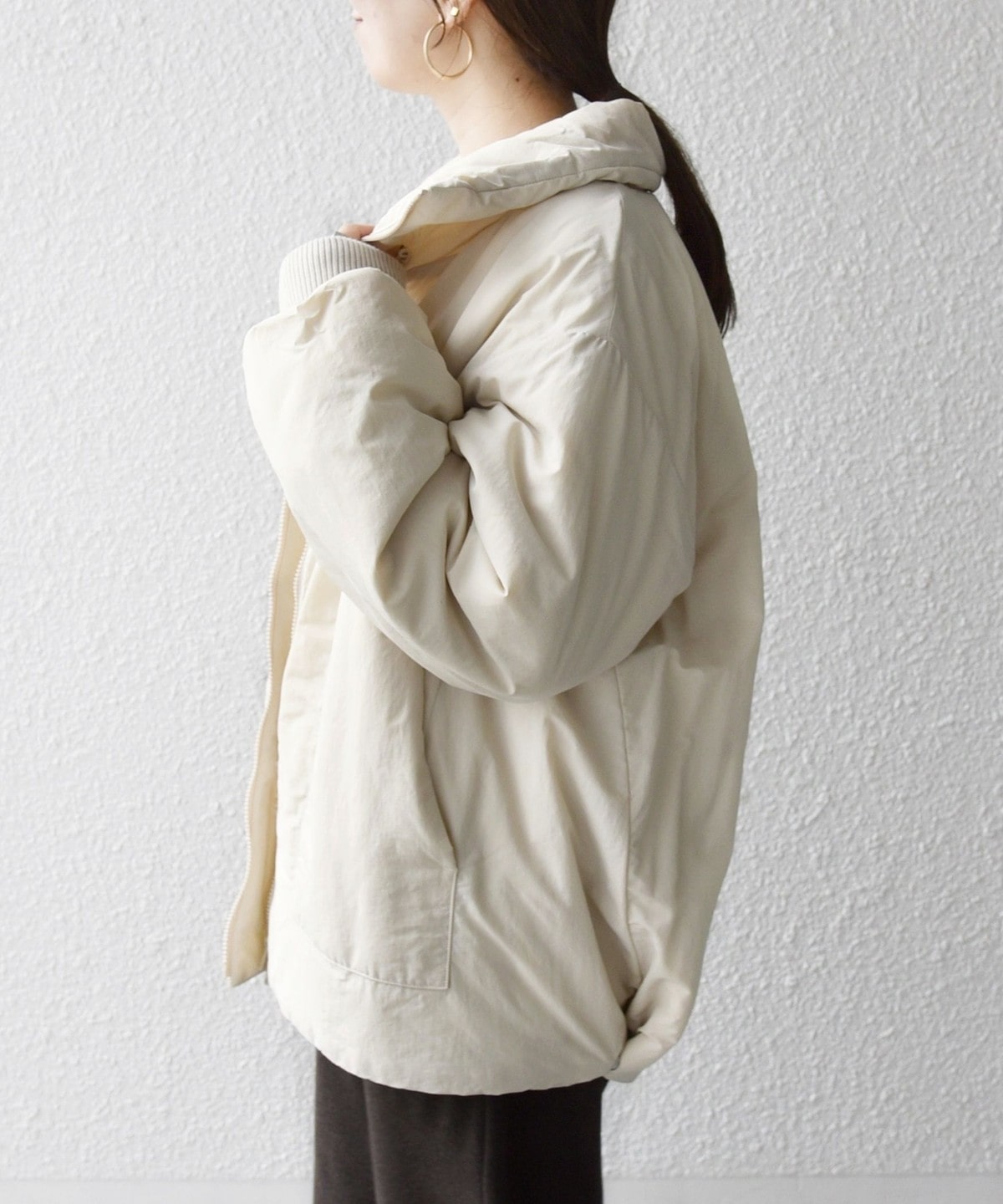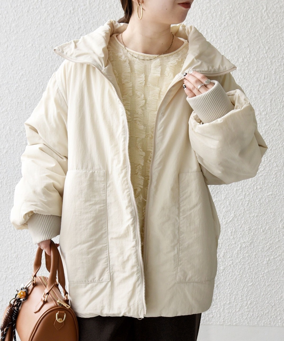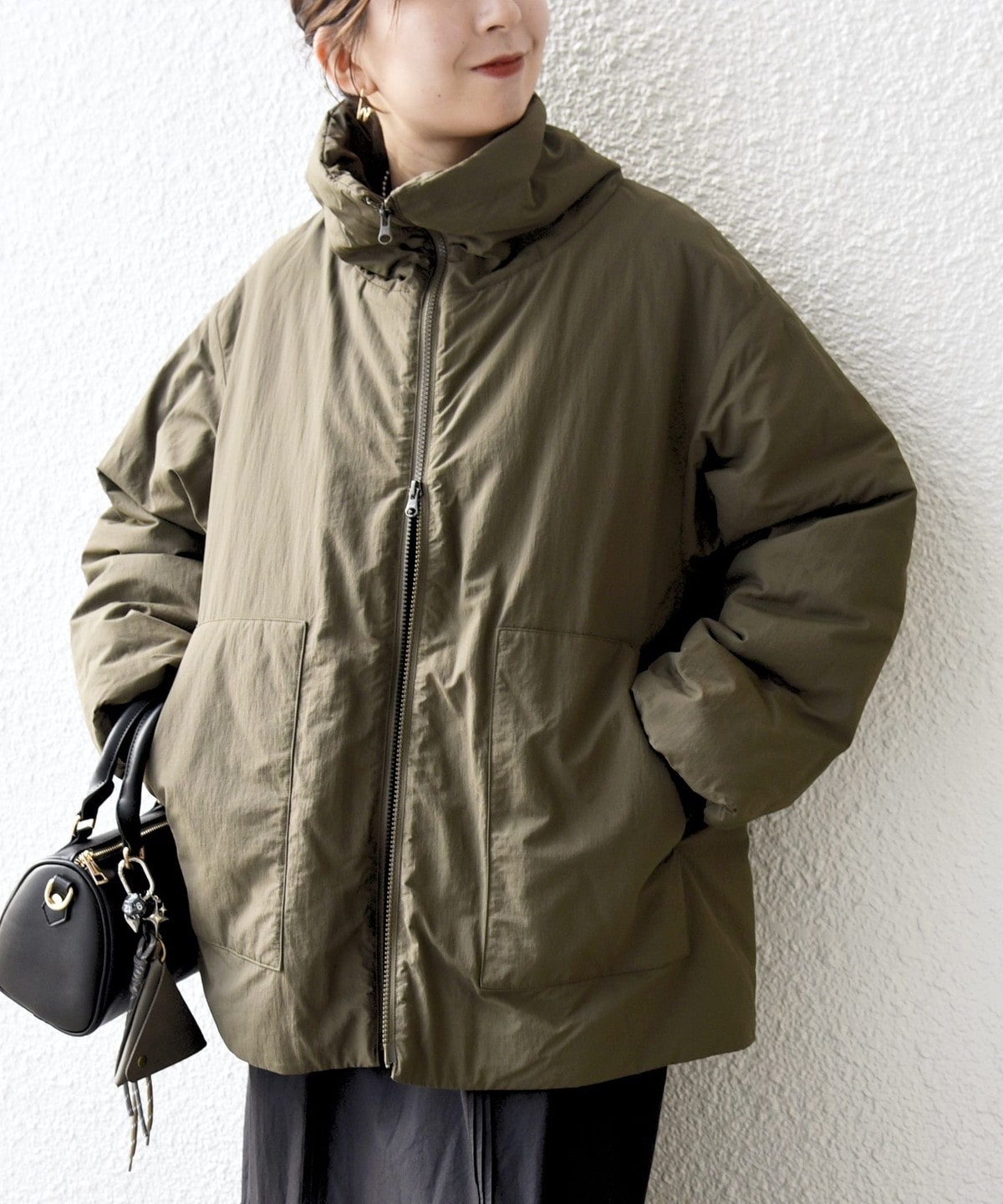 ボリュームのある高めのスタンドネックがポイントの中綿ブルゾン。