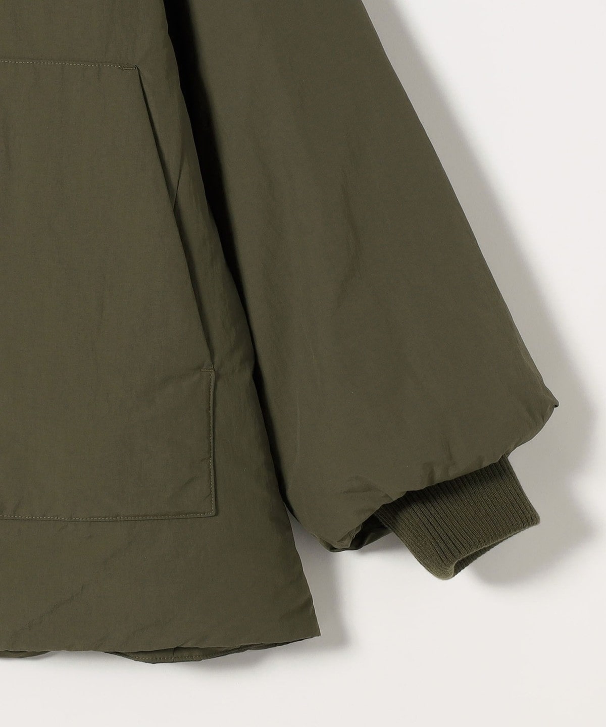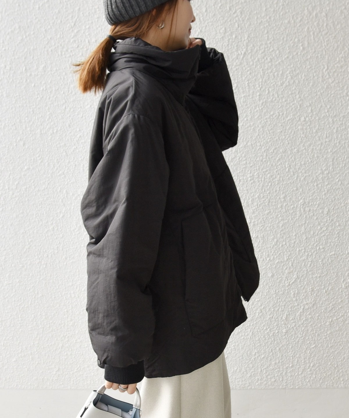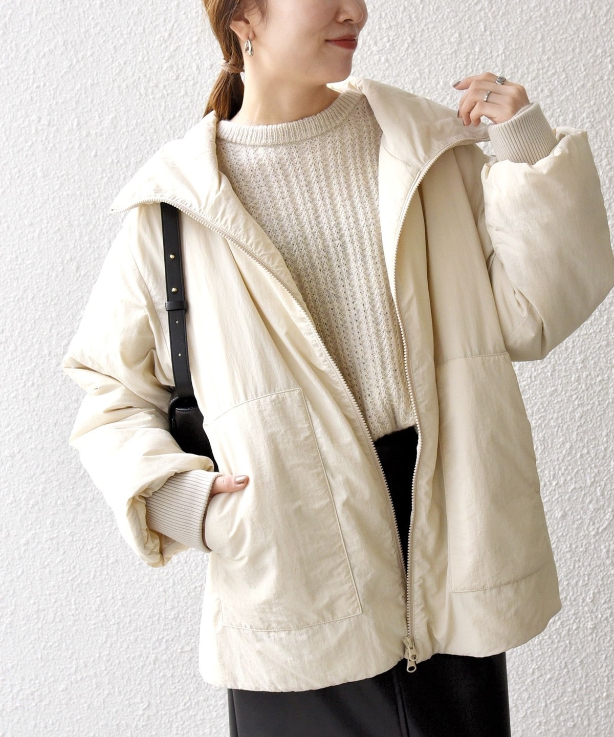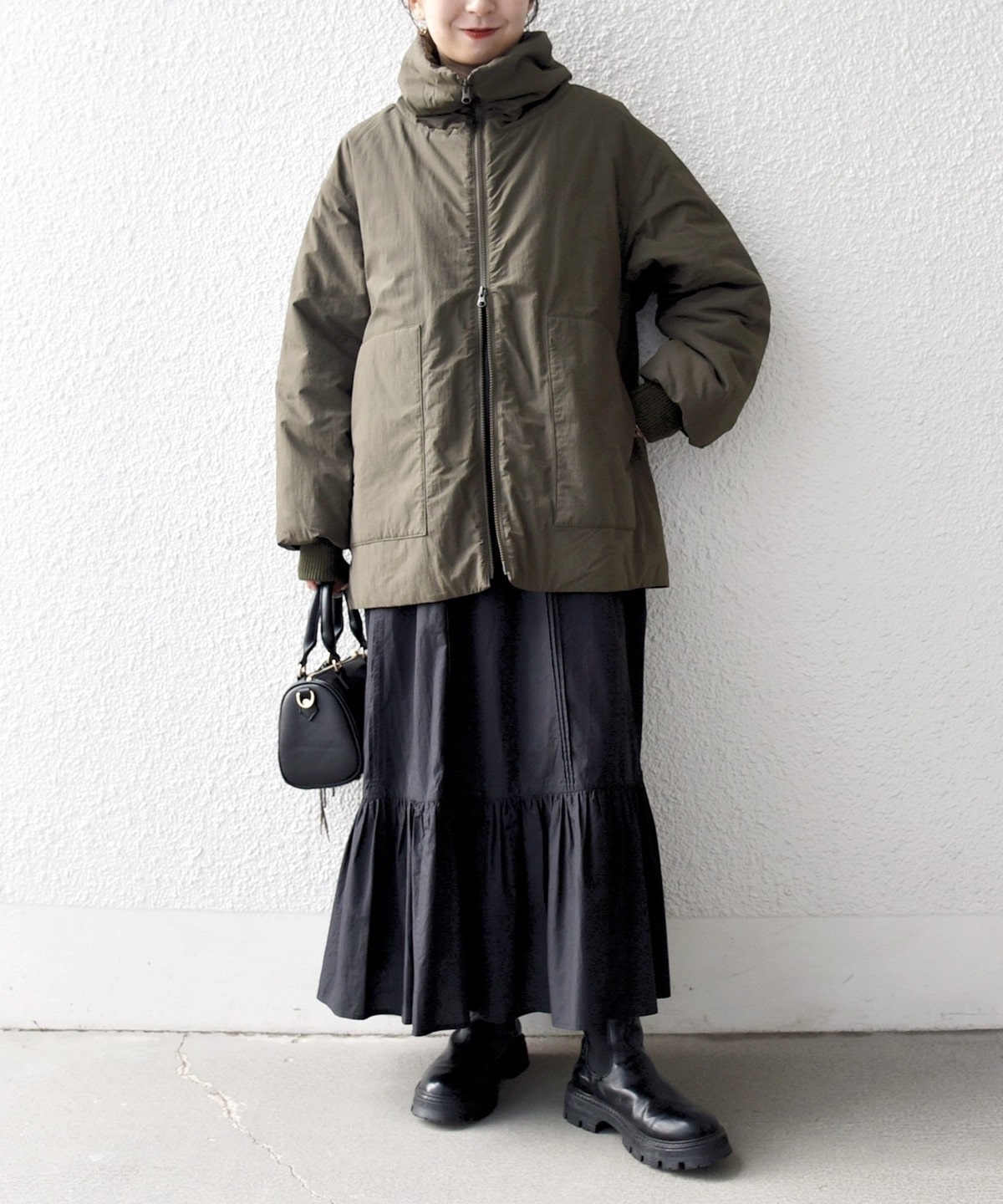 ボリュームのある高めのスタンドネックがポイントの中綿ブルゾン。