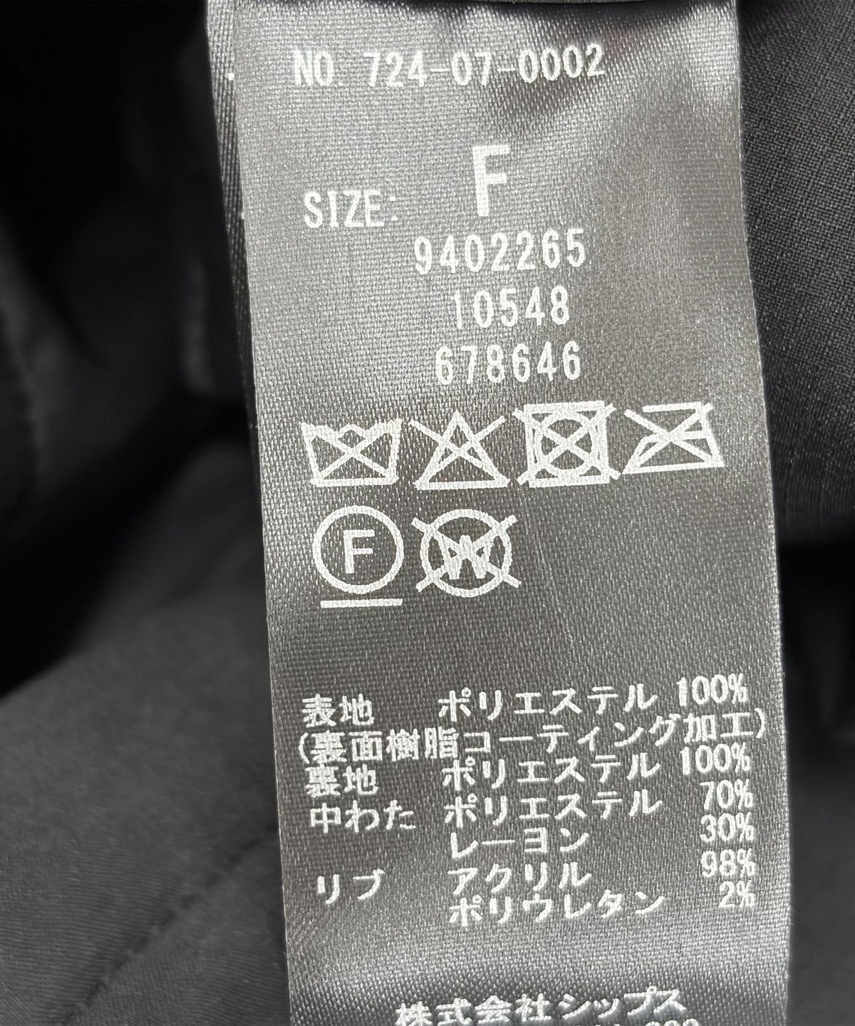 素材:表地: ポリエステル100%(裏面樹脂コーティング加工), 裏地: ポリエステル100%, 中わた: ポリエステル70%, レーヨン30%, リブ: アクリル98%, ポリウレタン2%