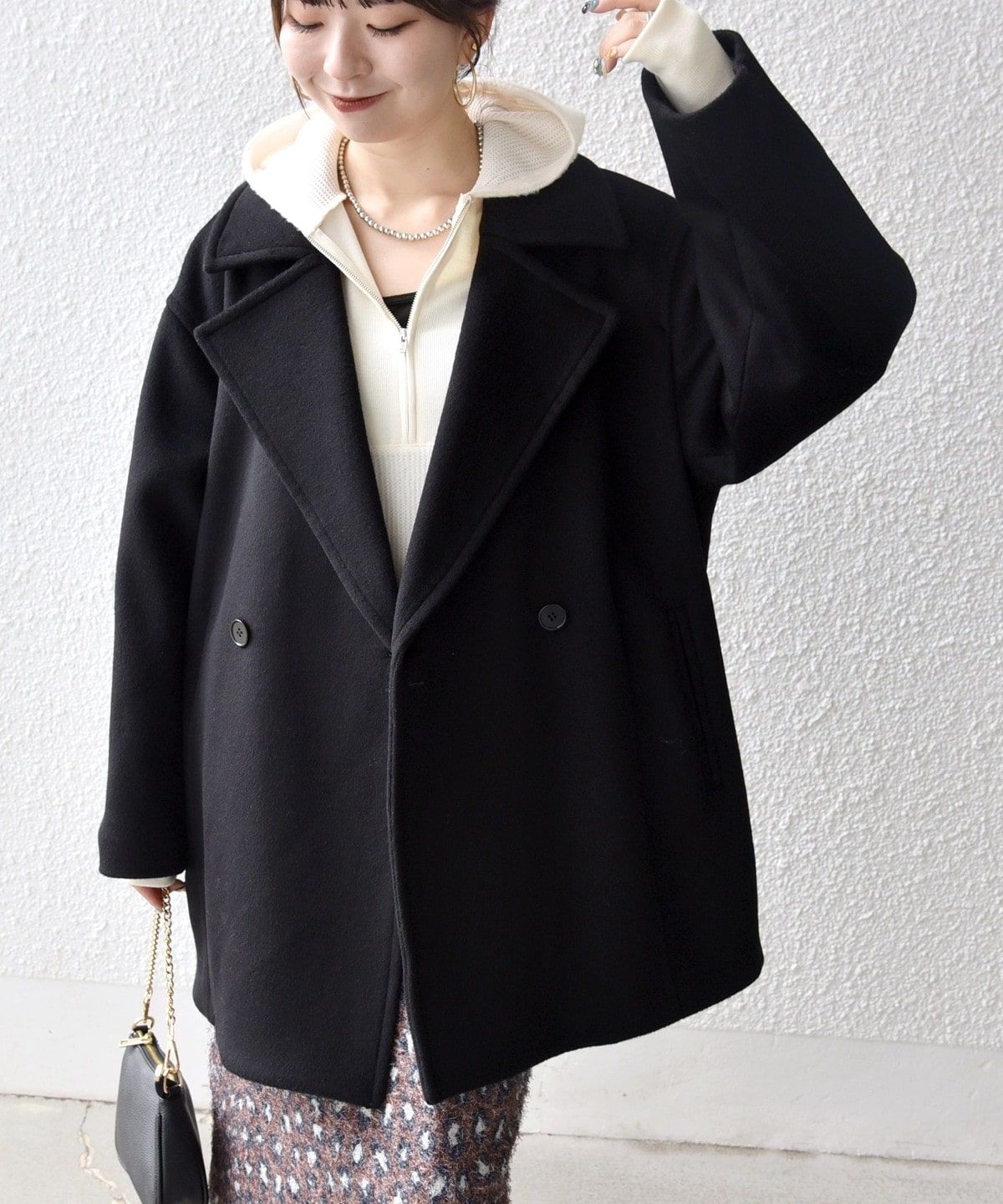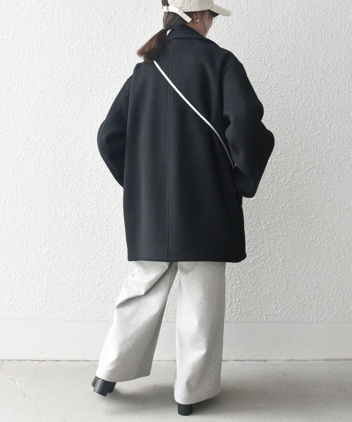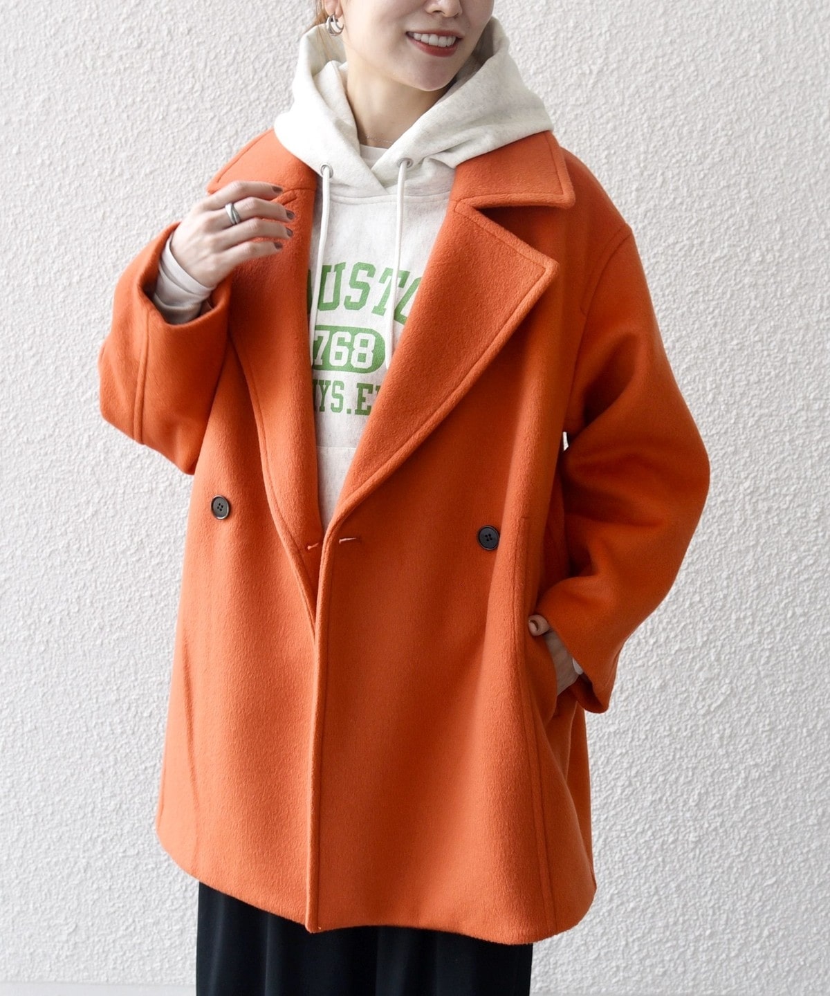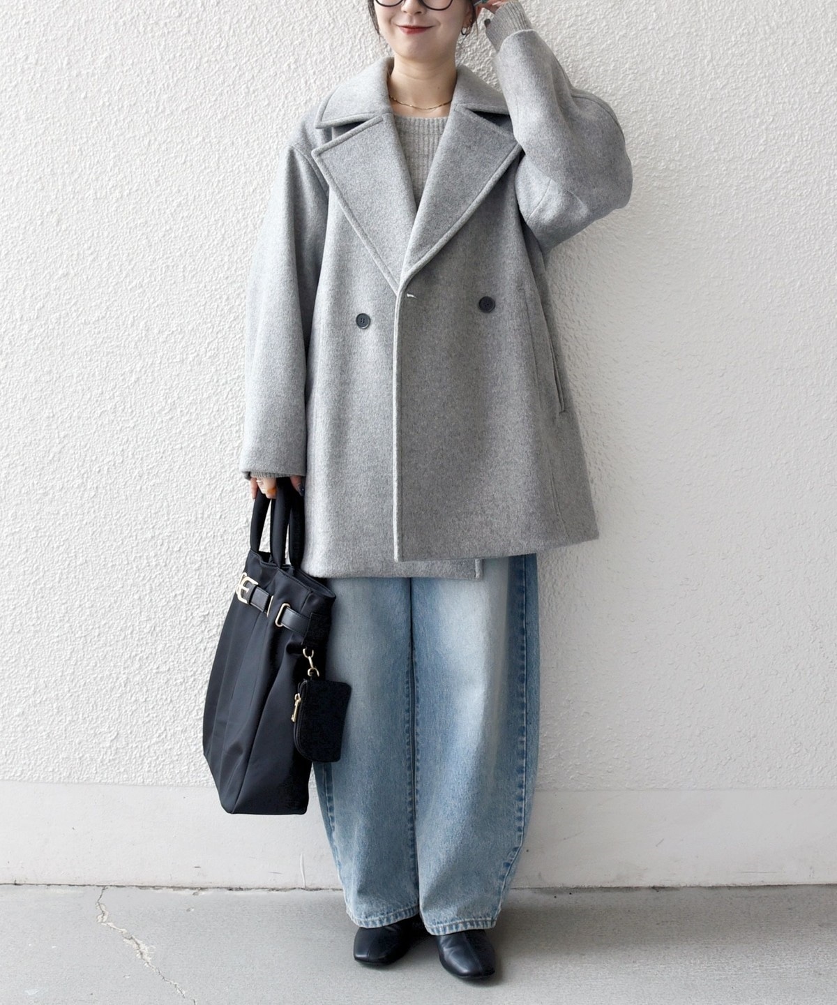 厚手のニットも着用できるサイズ感でありながら、オーバーサイズに見えない計算されたシルエットがポイントです。
