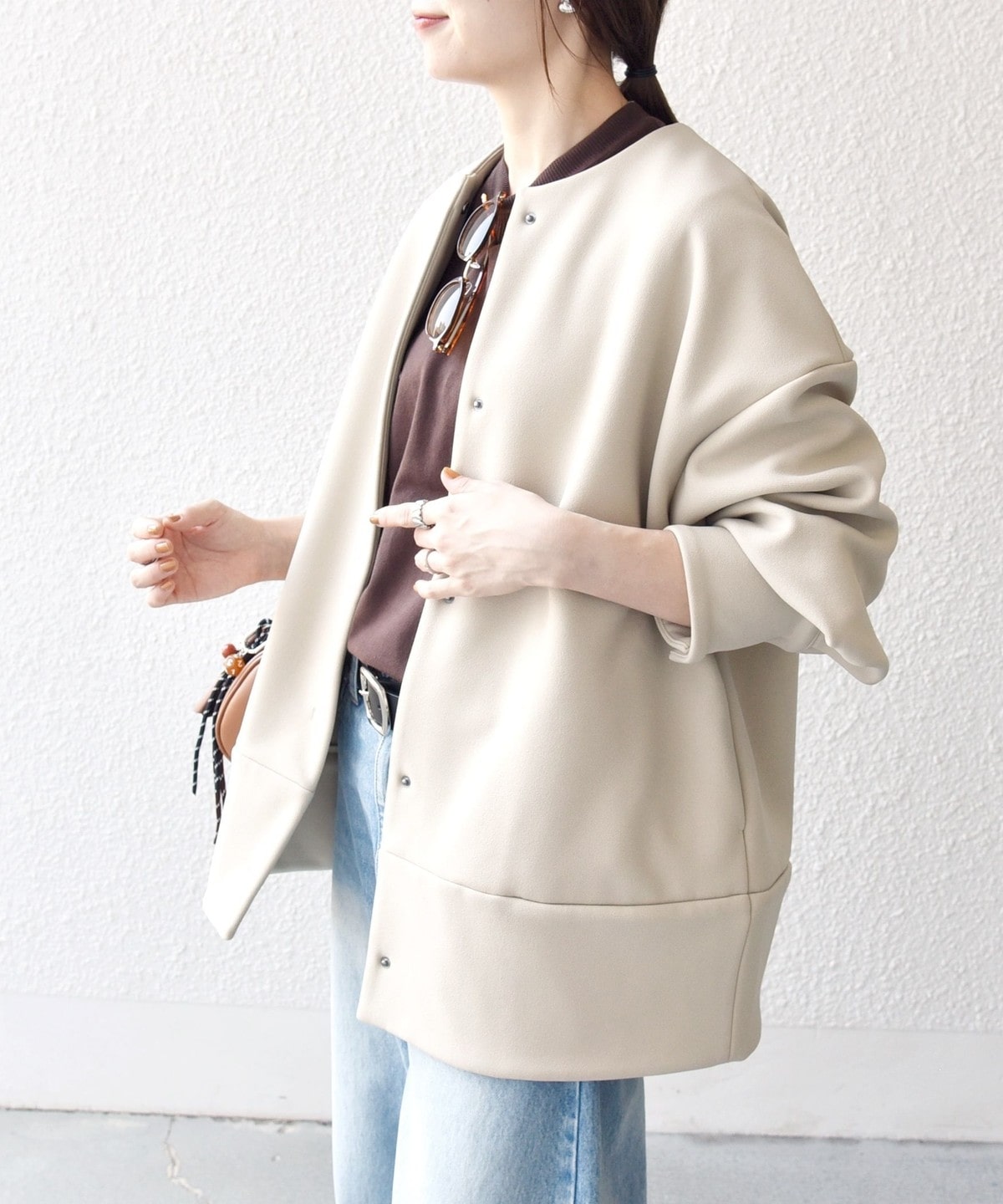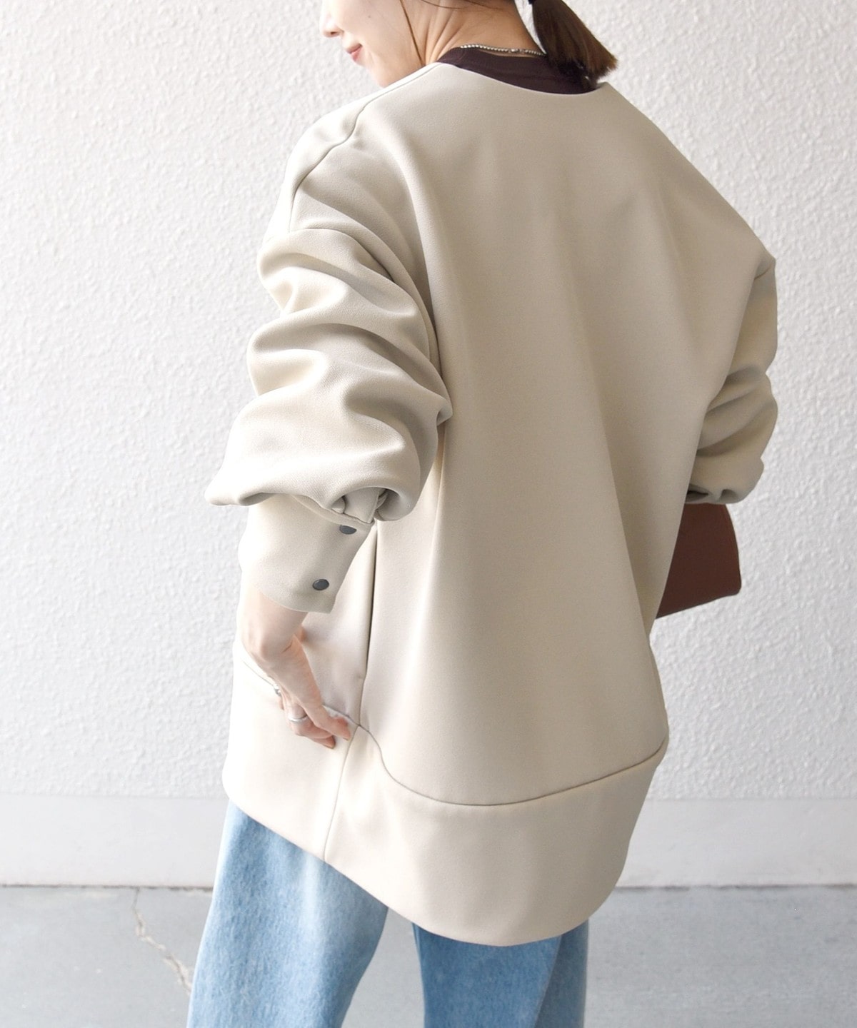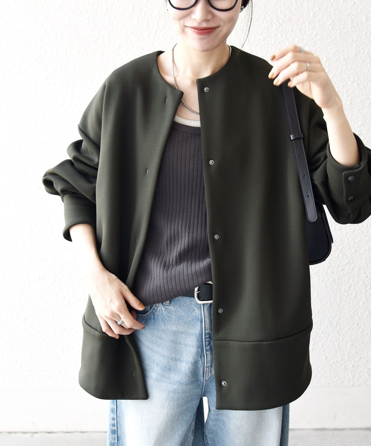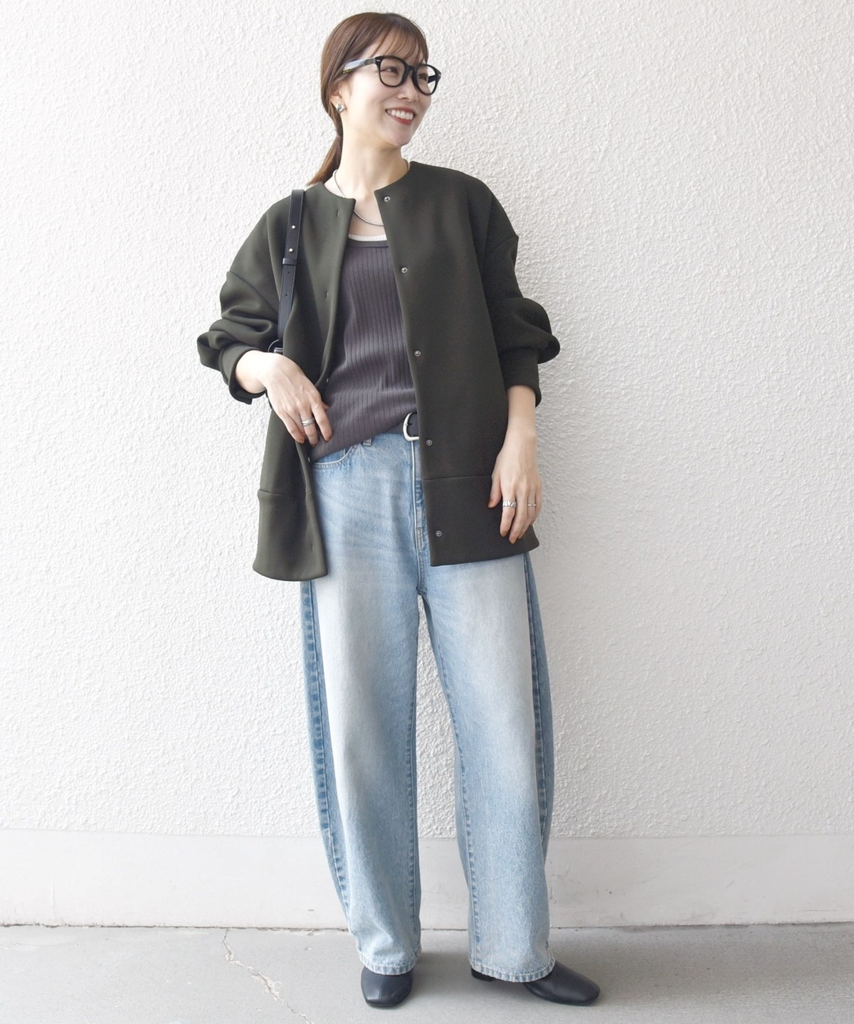 ゆったりとした程良いオーバーサイズなので、スウェットやニットの上にも羽織っていただけます。
