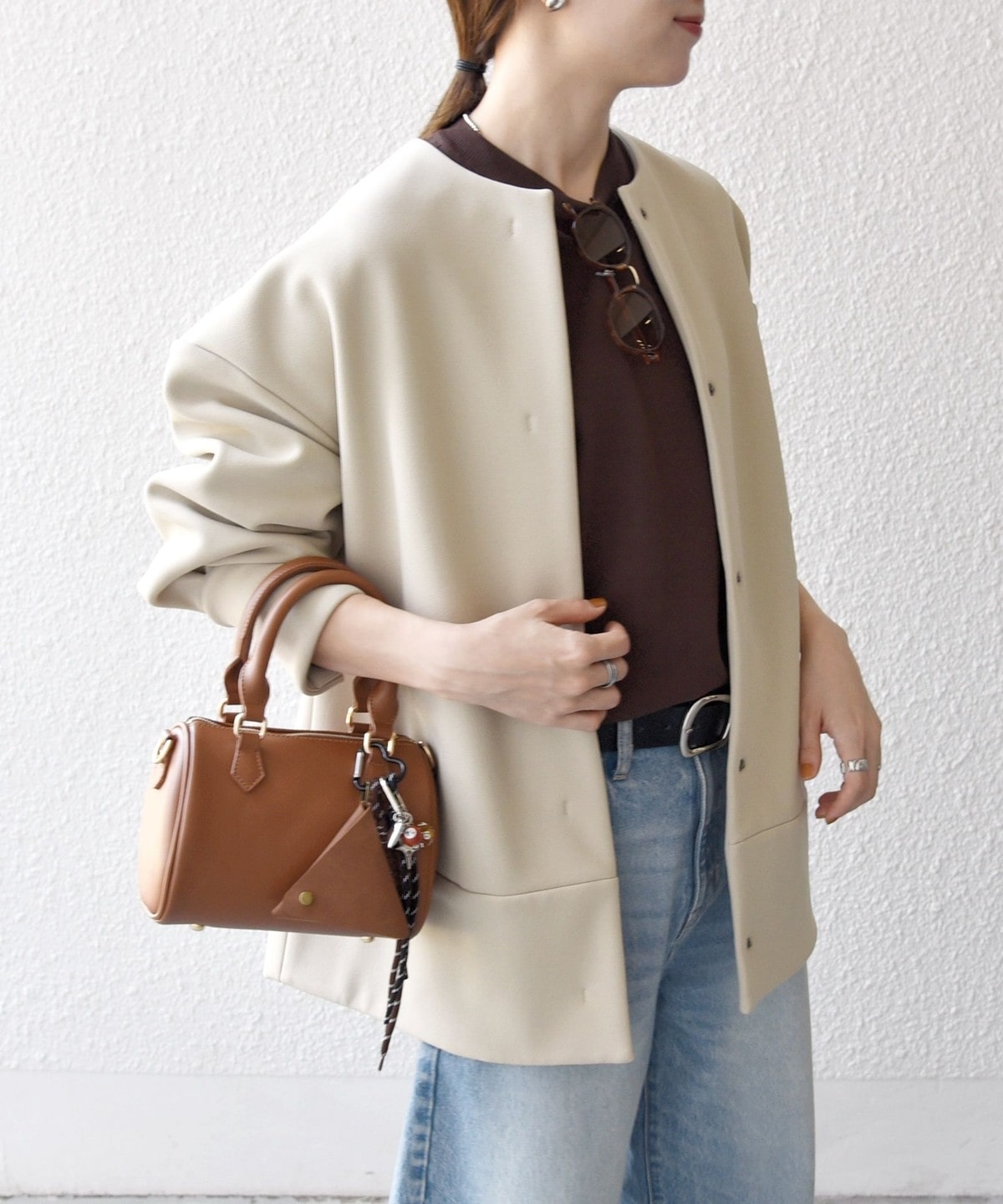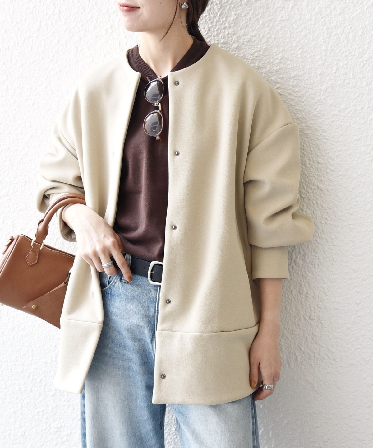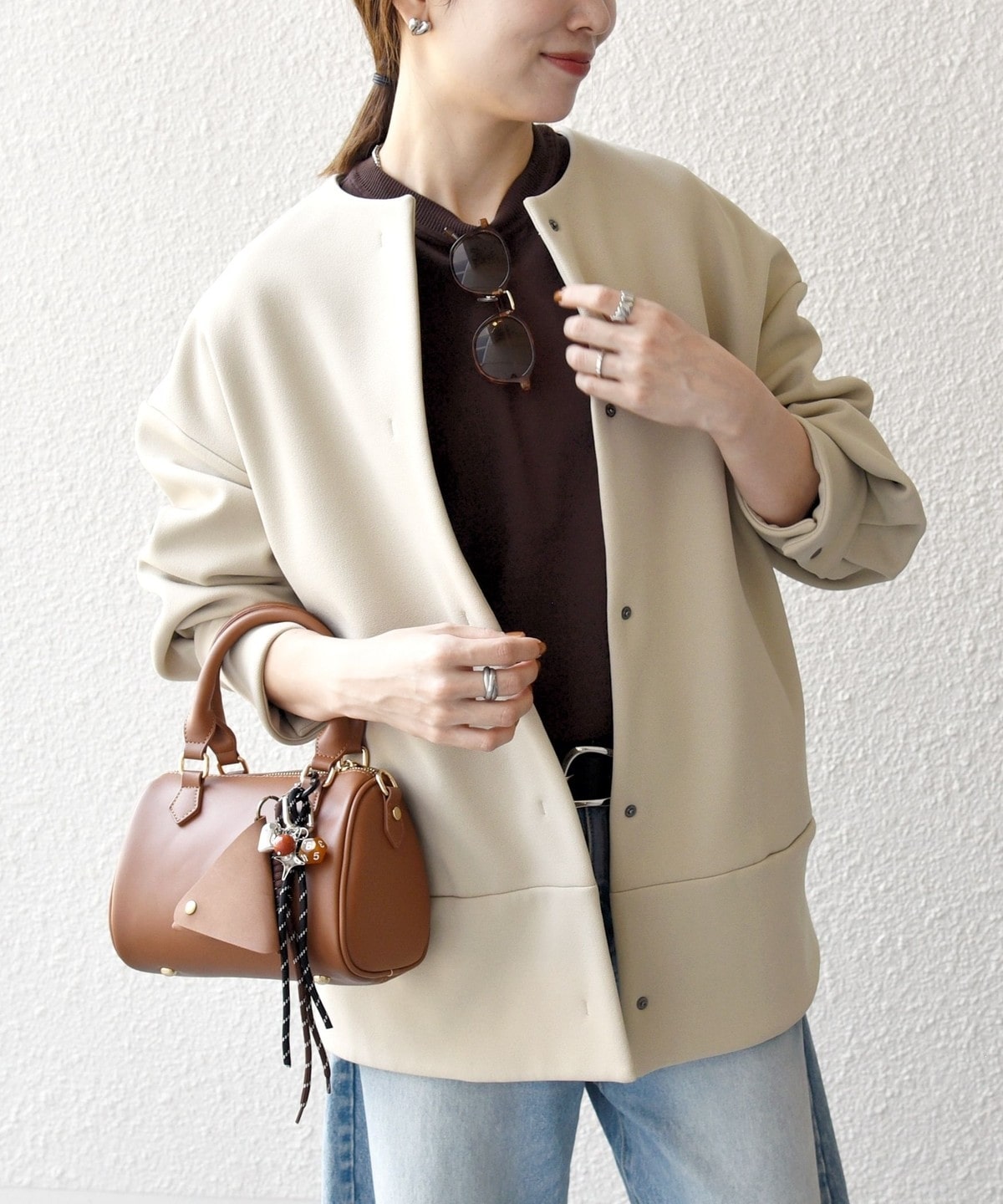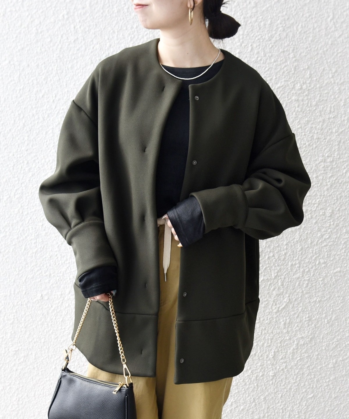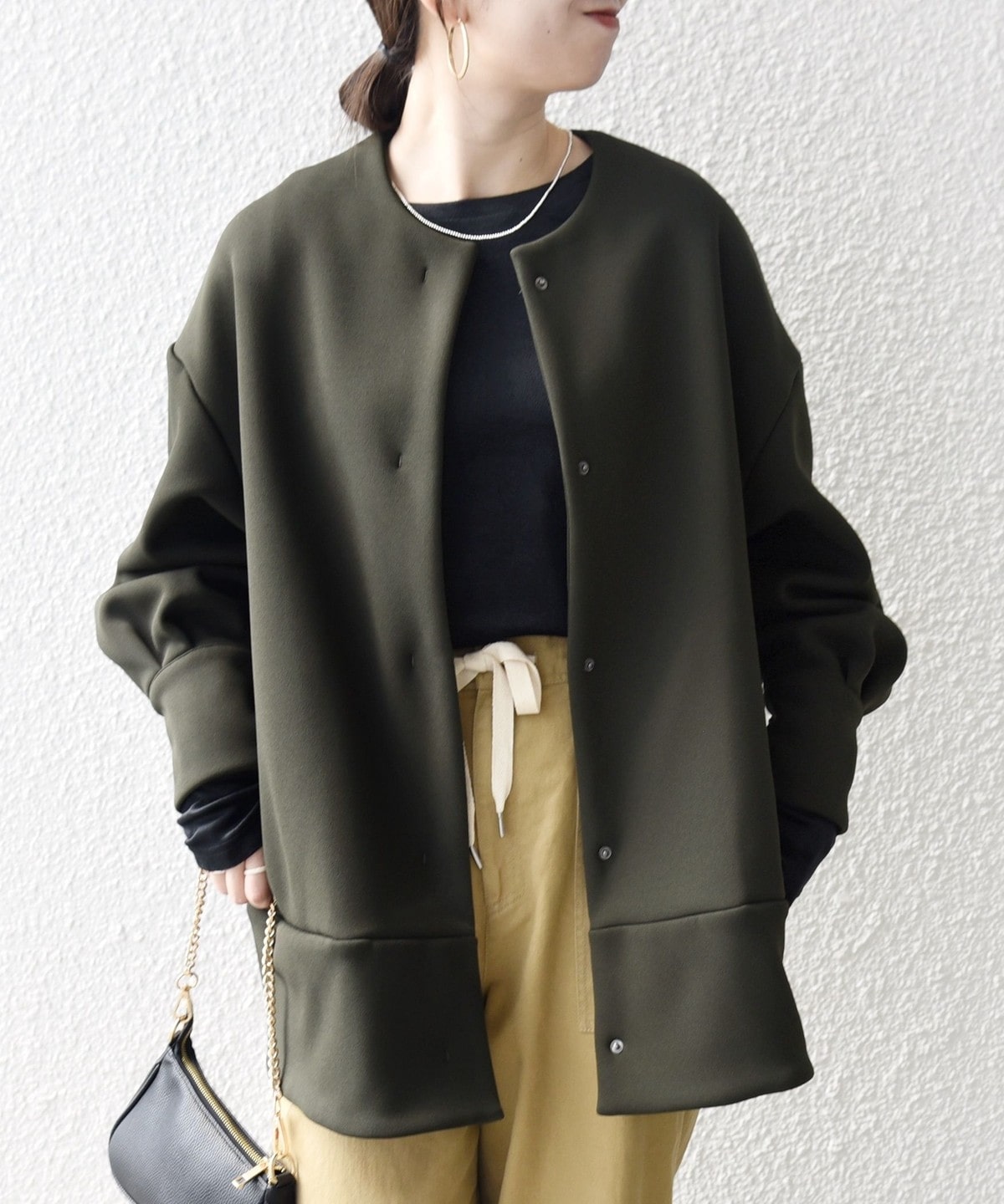ノーカラーなので、マフラーやストールを合わせてもごわつかないのもポイント。