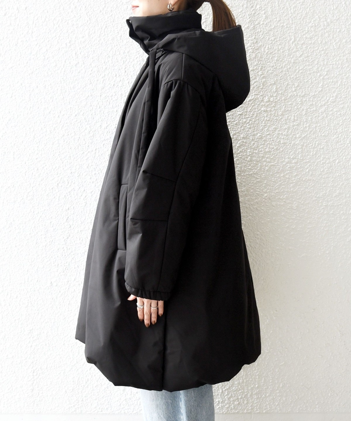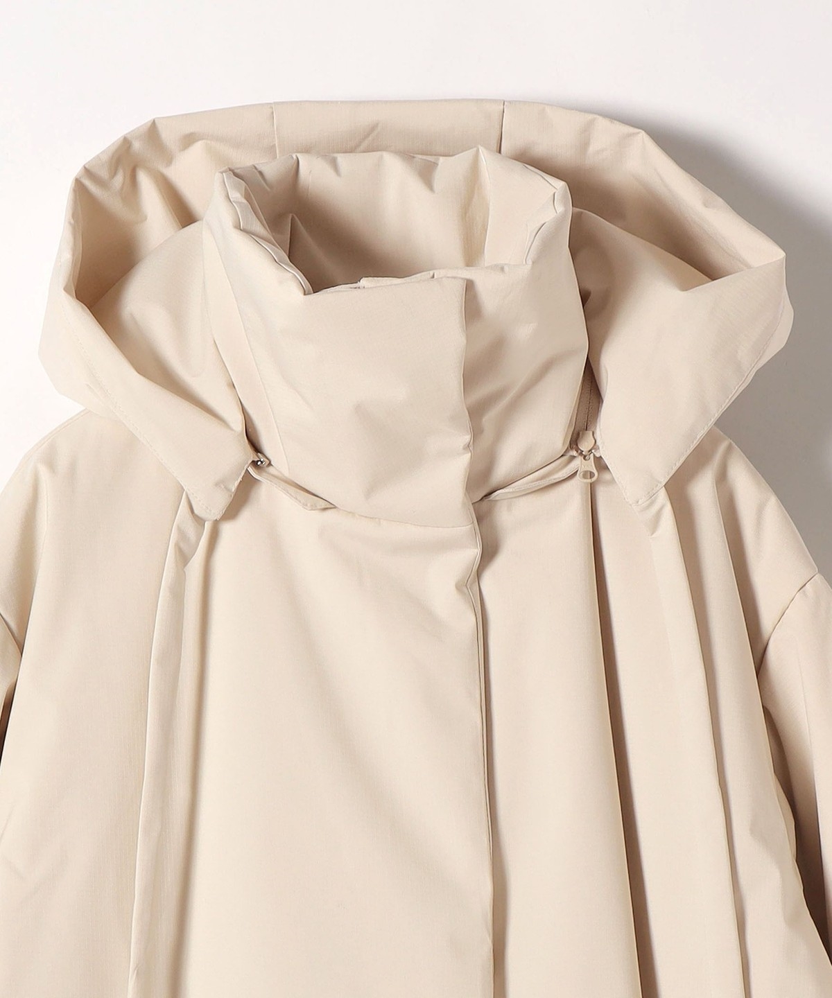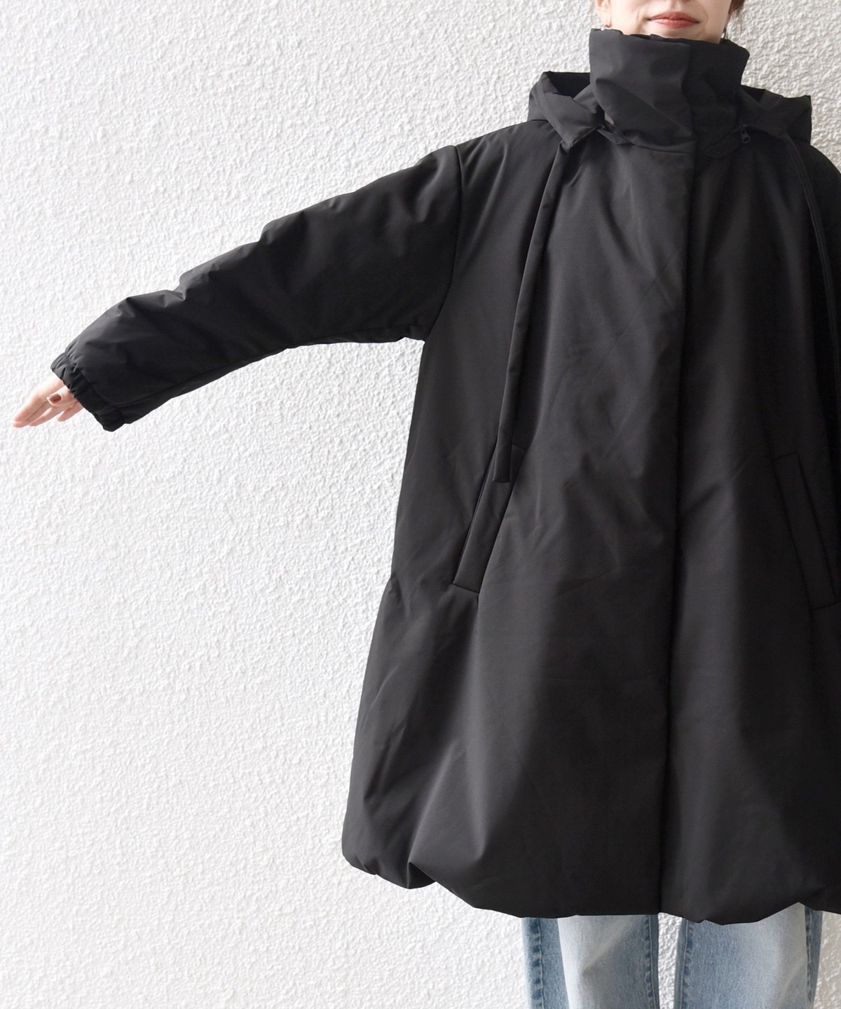 テントラインとバルーン風のシルエットがフェミニンな印象のフード付きコート。