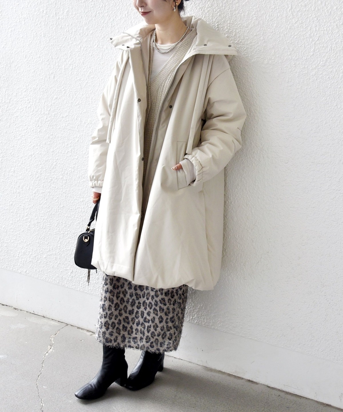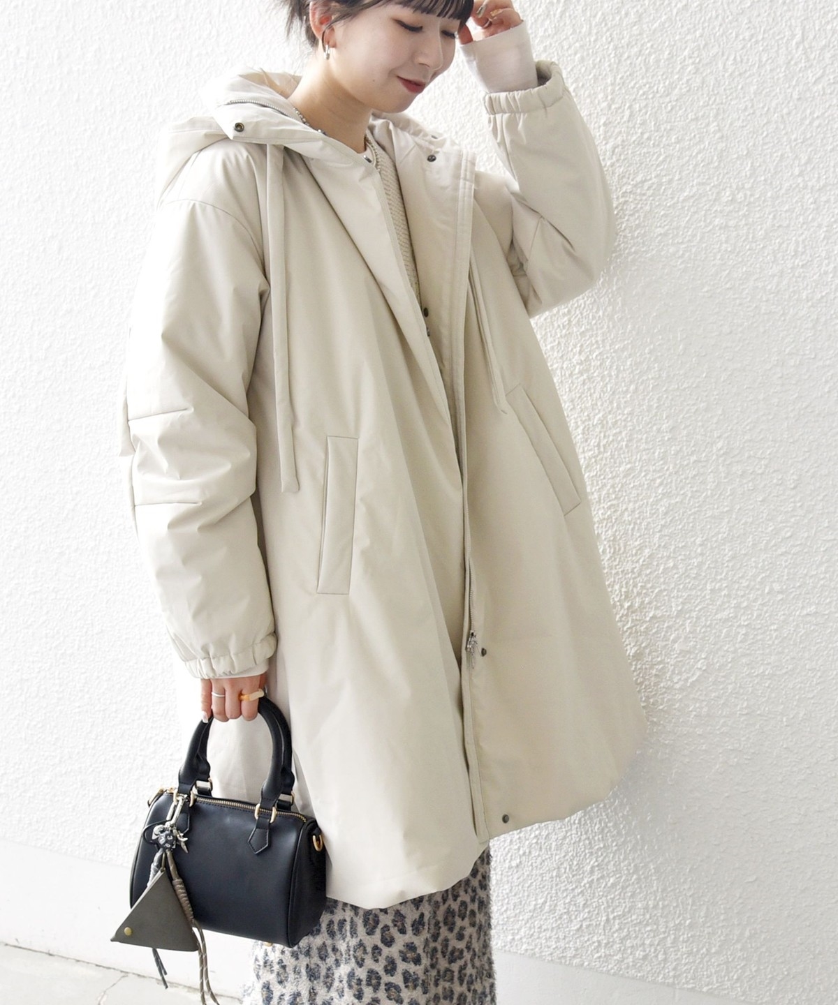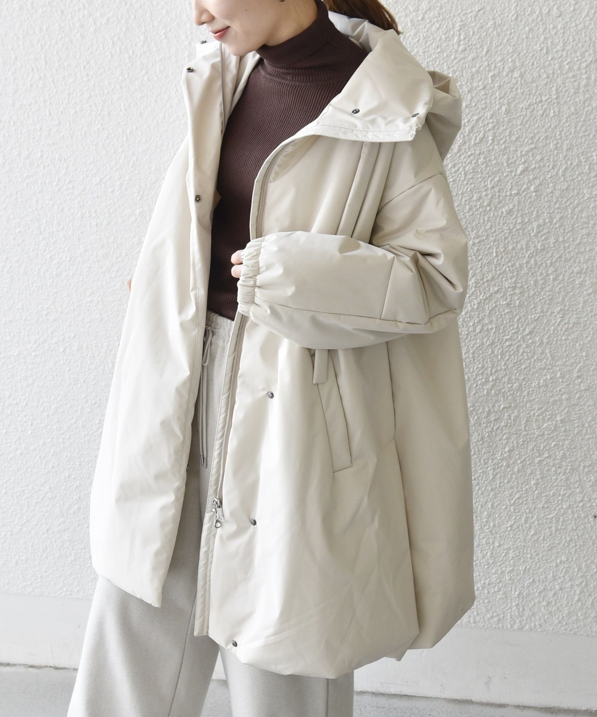 テントラインとバルーン風のシルエットがフェミニンな印象のフード付きコート。