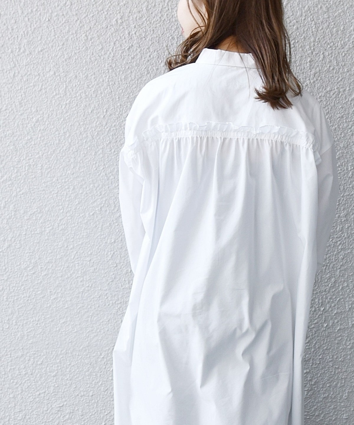 小さい衿やボリュームのある袖、後ろについたフリルなどかわいいポイントがたくさん詰まったシャツワンピース。