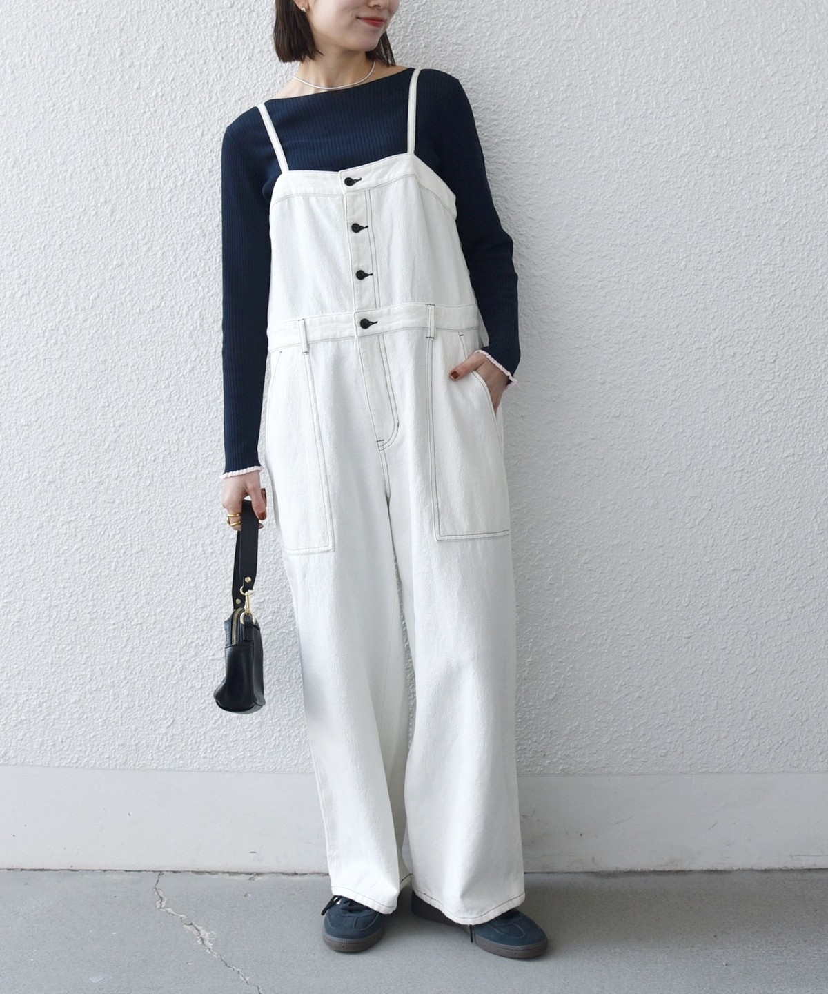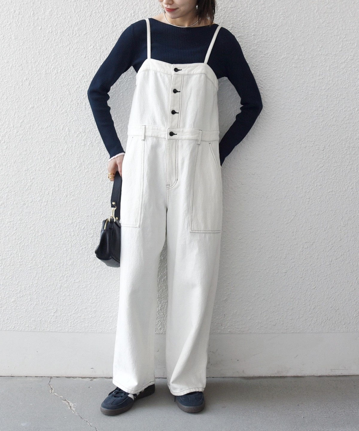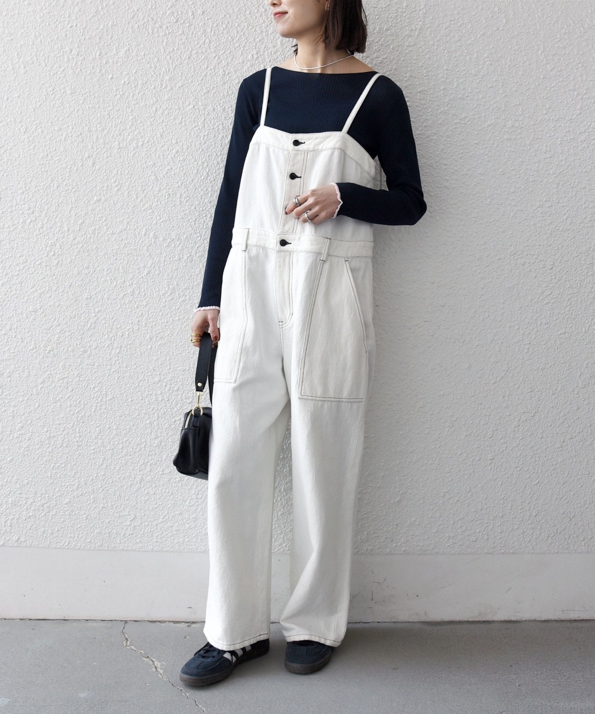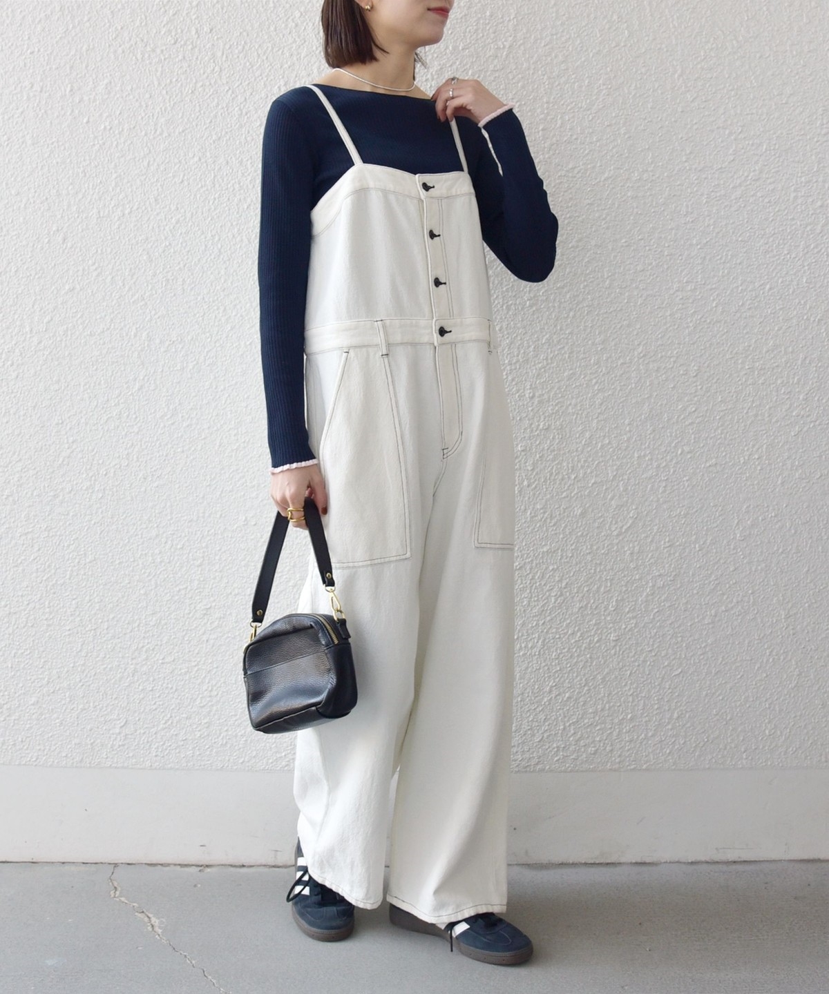 フロントのボタンや大きめのパッチポケットでワーク感がありながら、華奢なストラップやワイドストレートのパンツシルエットで大人っぽく着こなせます。