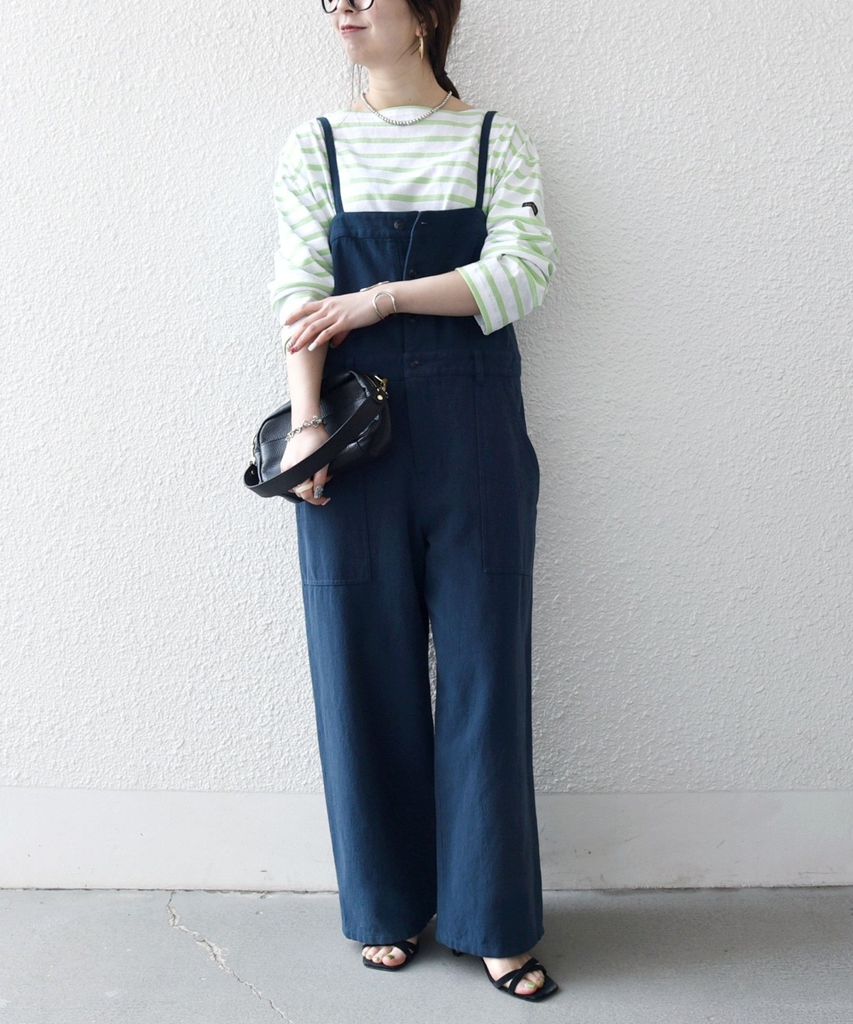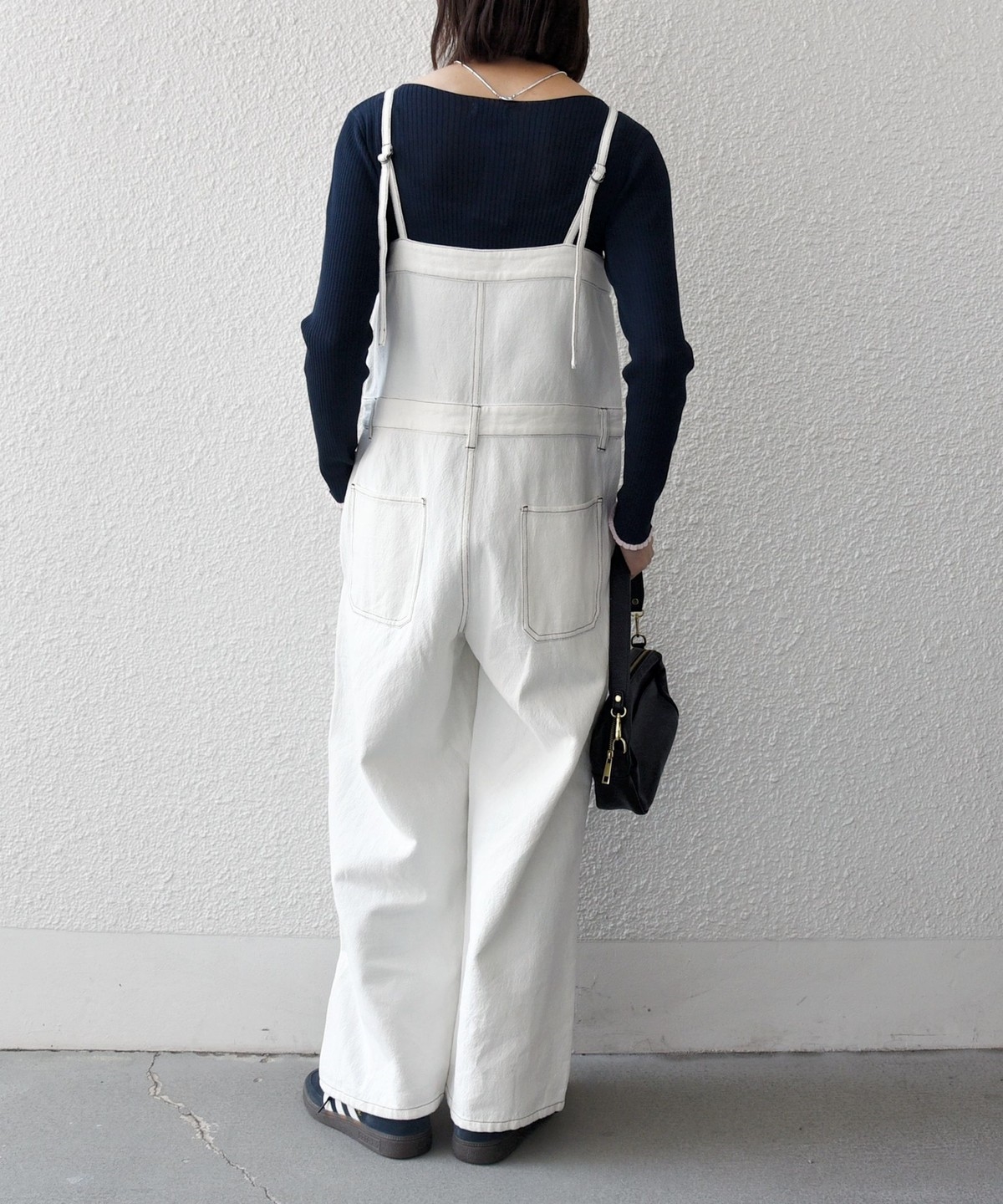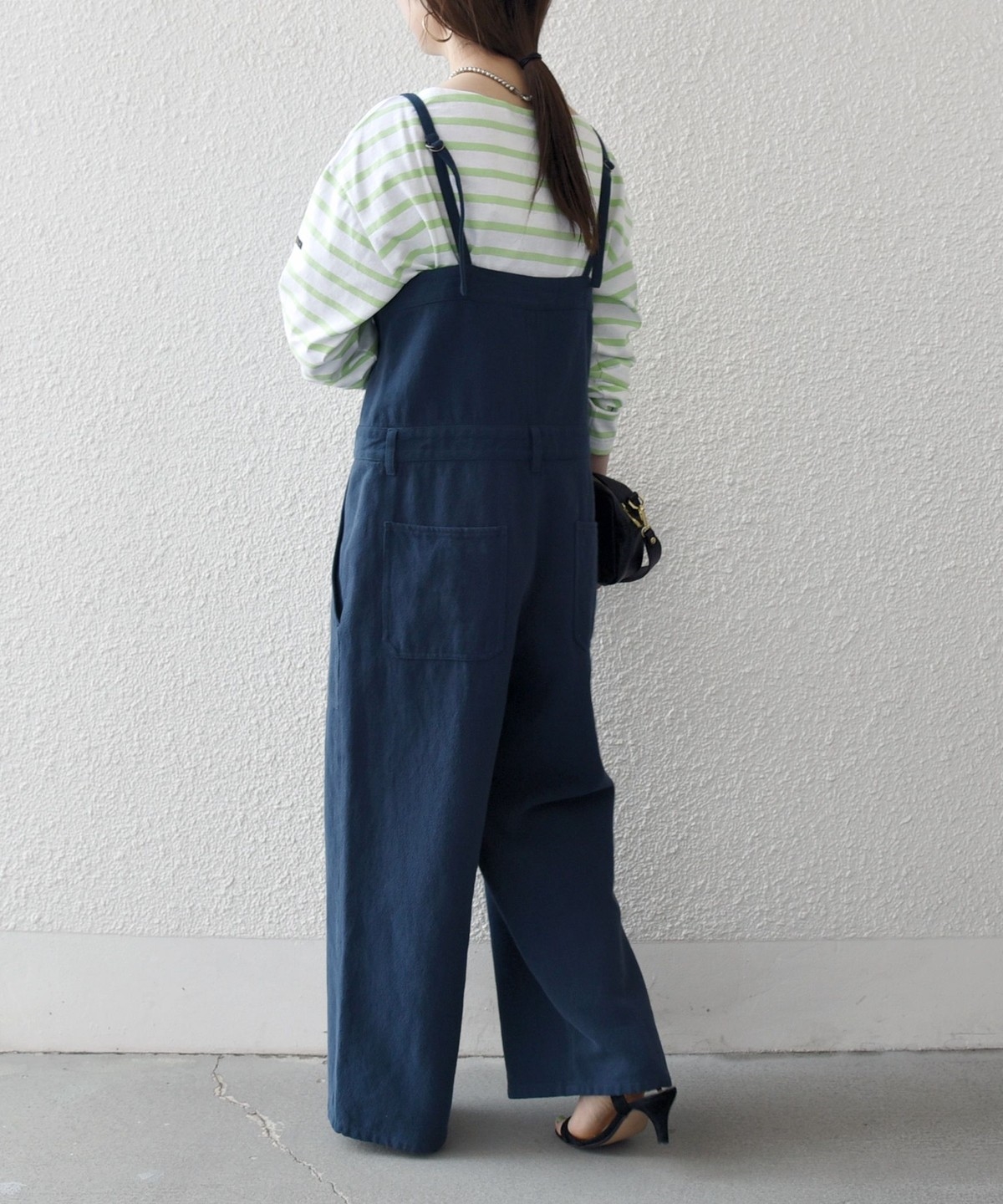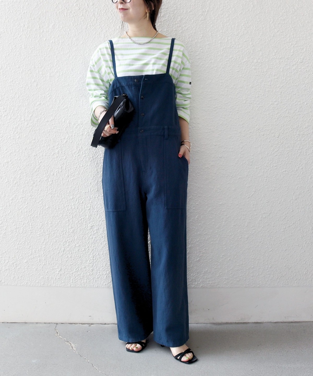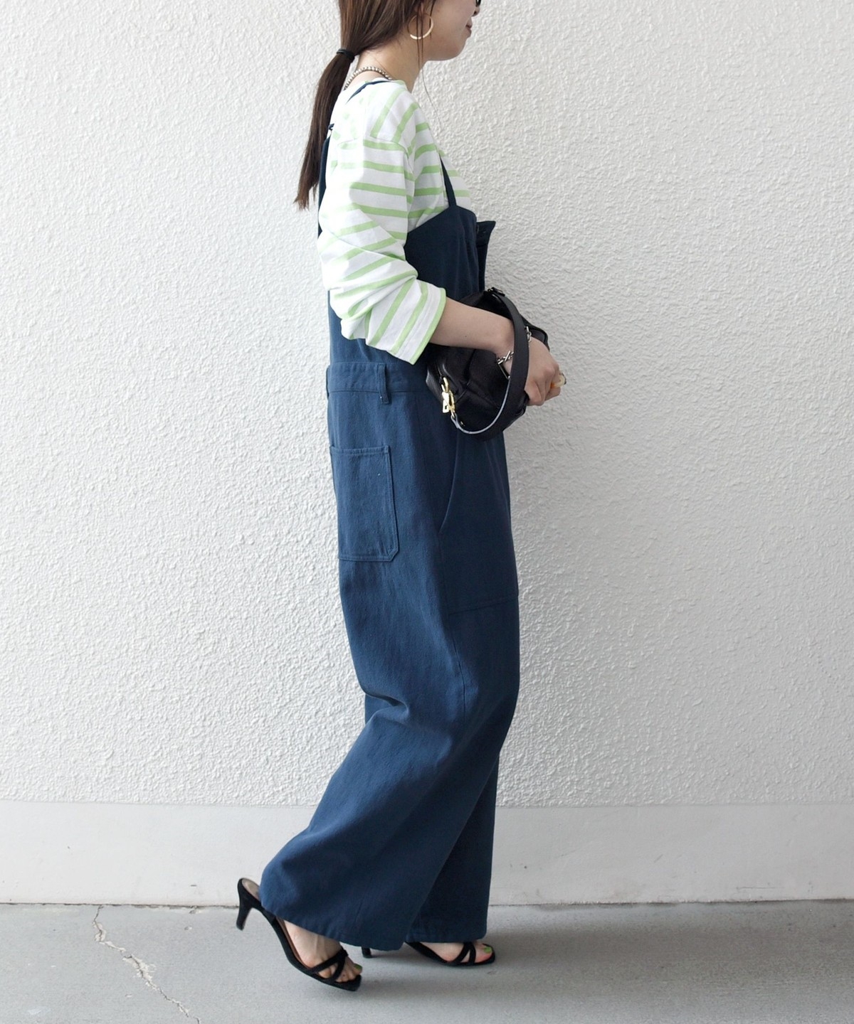 フロントのボタンや大きめのパッチポケットでワーク感がありながら、華奢なストラップやワイドストレートのパンツシルエットで大人っぽく着こなせます。