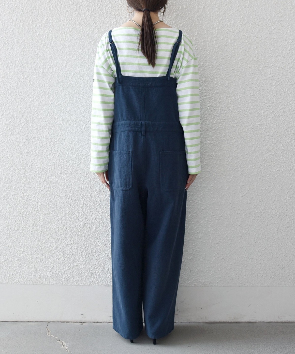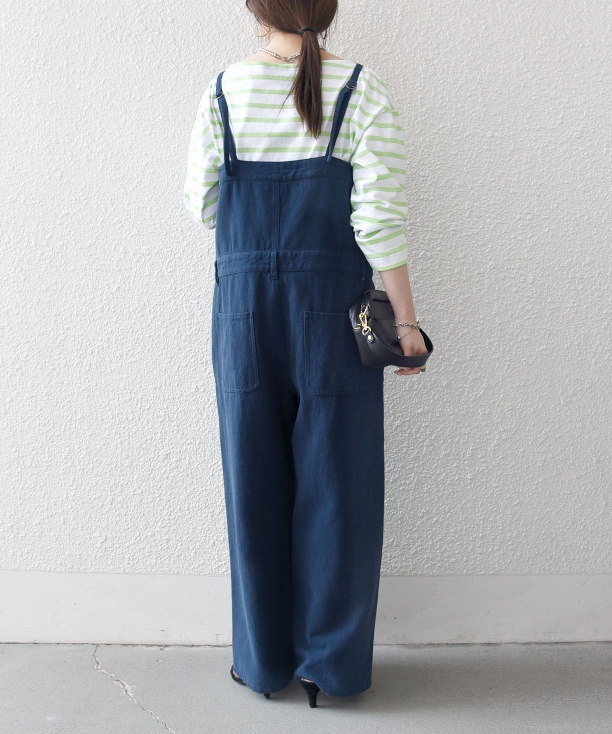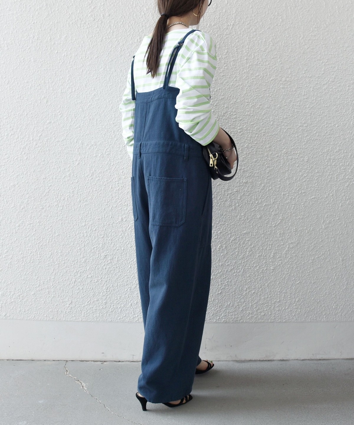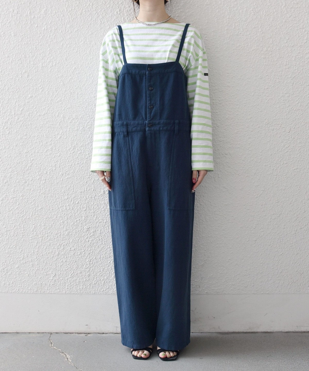 フロントのボタンや大きめのパッチポケットでワーク感がありながら、華奢なストラップやワイドストレートのパンツシルエットで大人っぽく着こなせます。