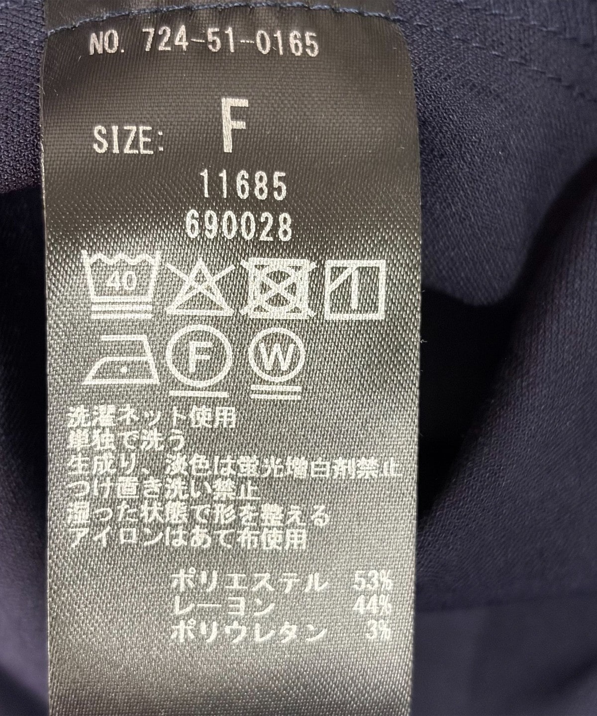 素材:ポリエステル53%, レーヨン44%, ポリウレタン3%