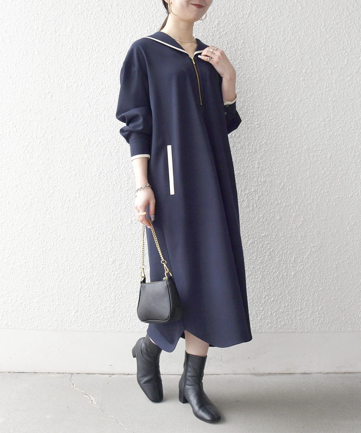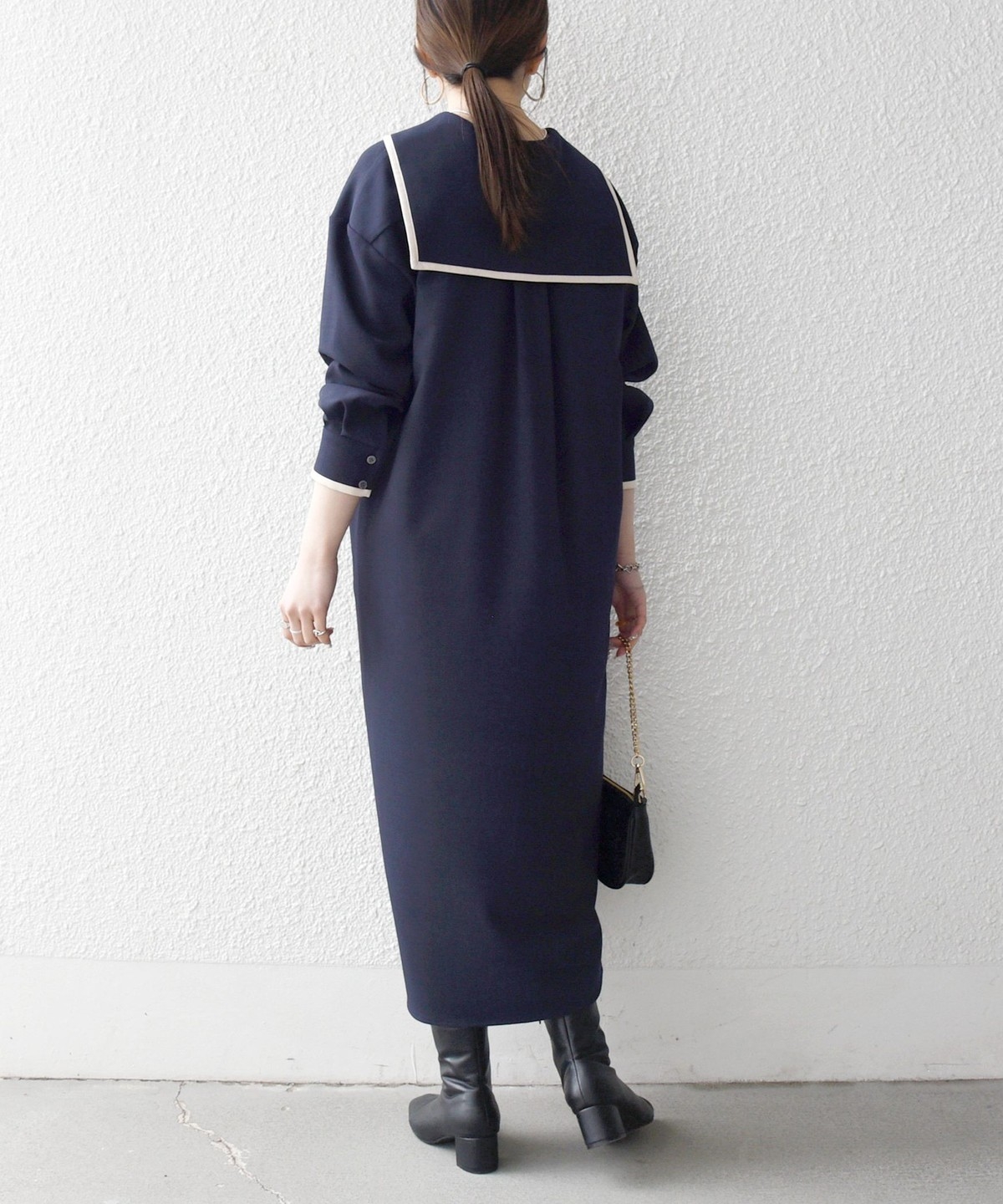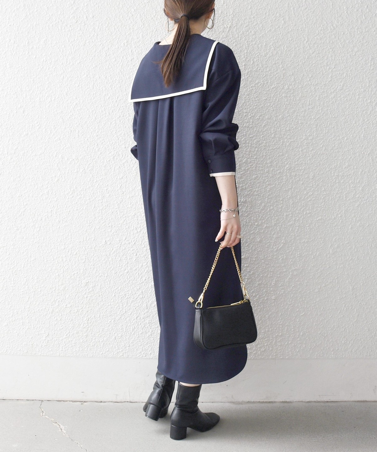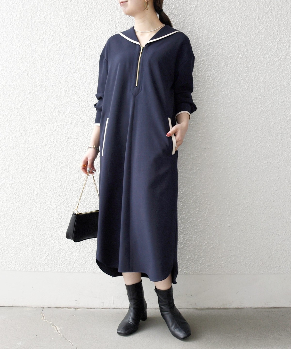 フレンチムード漂う、ミドル丈のセーラーカラーワンピース。