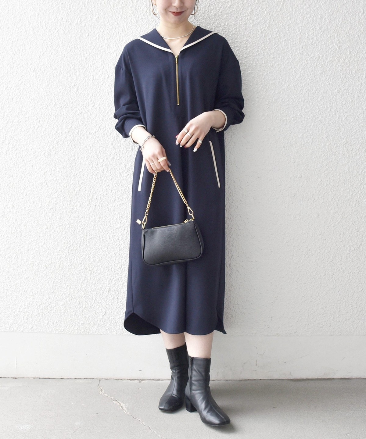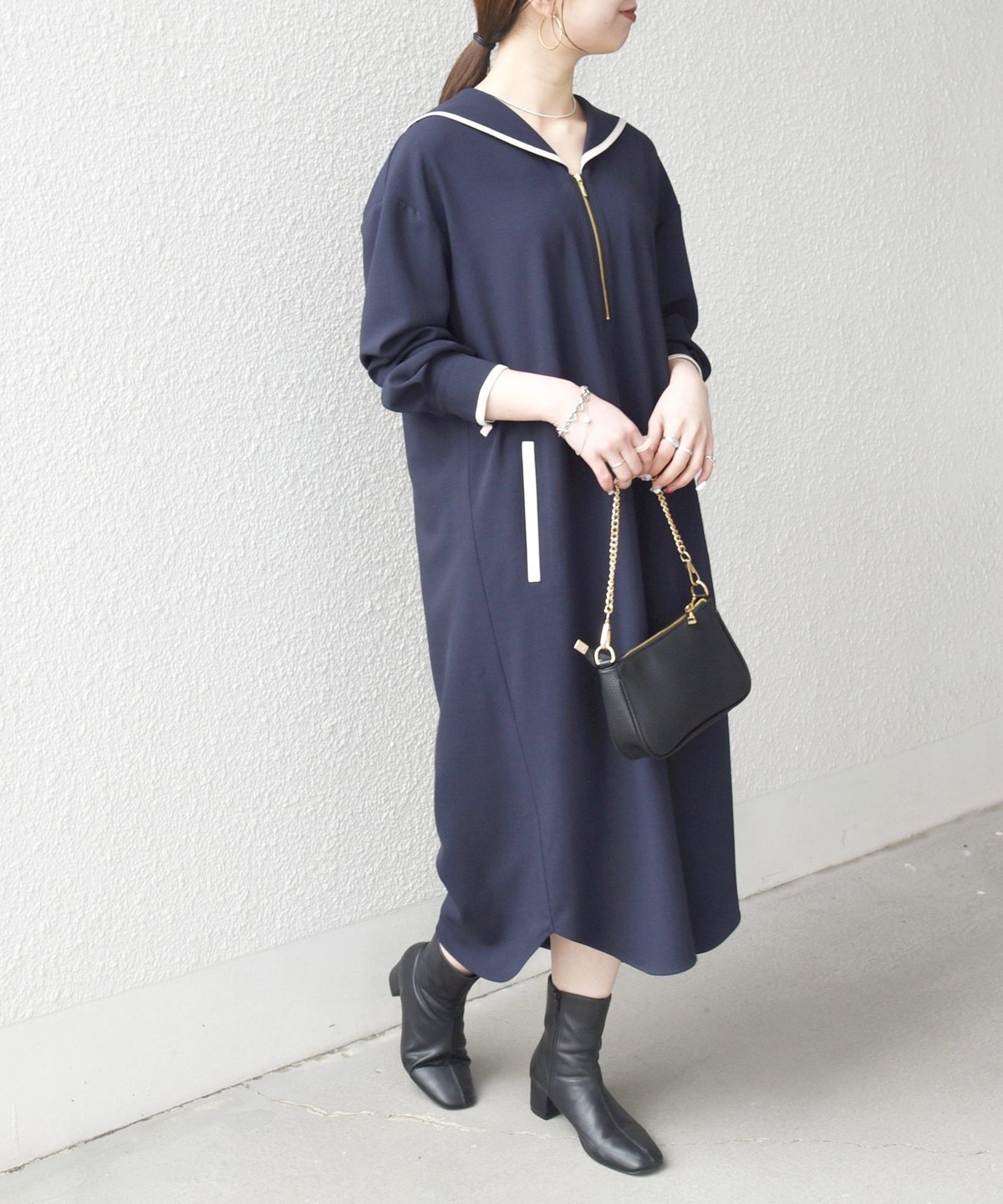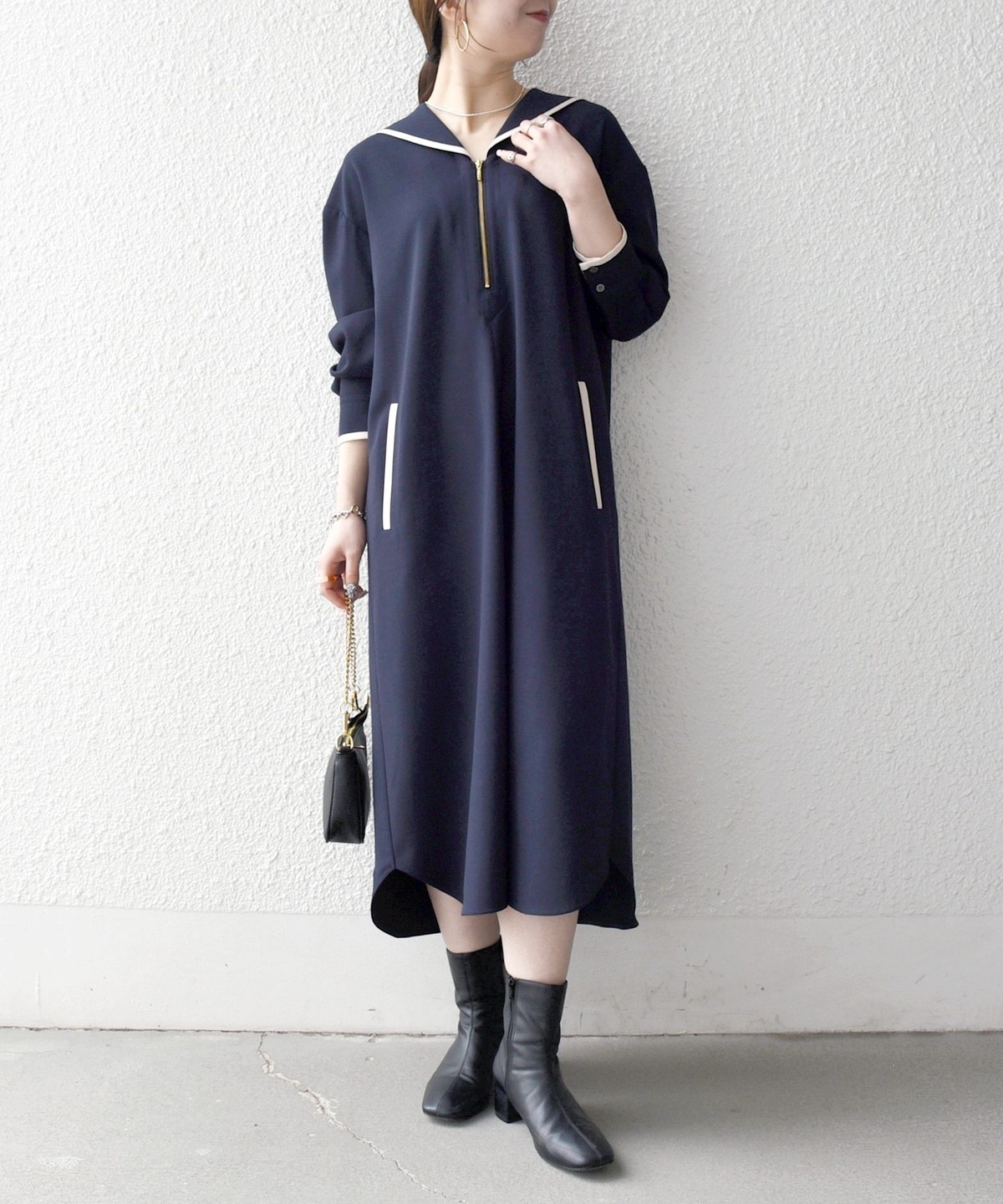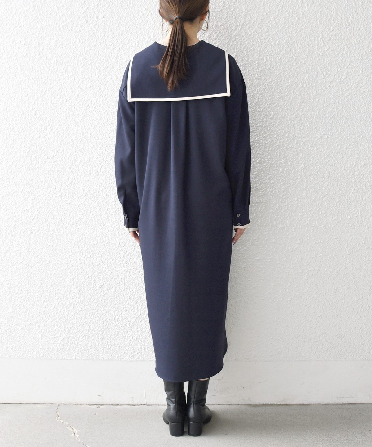 フレンチムード漂う、ミドル丈のセーラーカラーワンピース。
