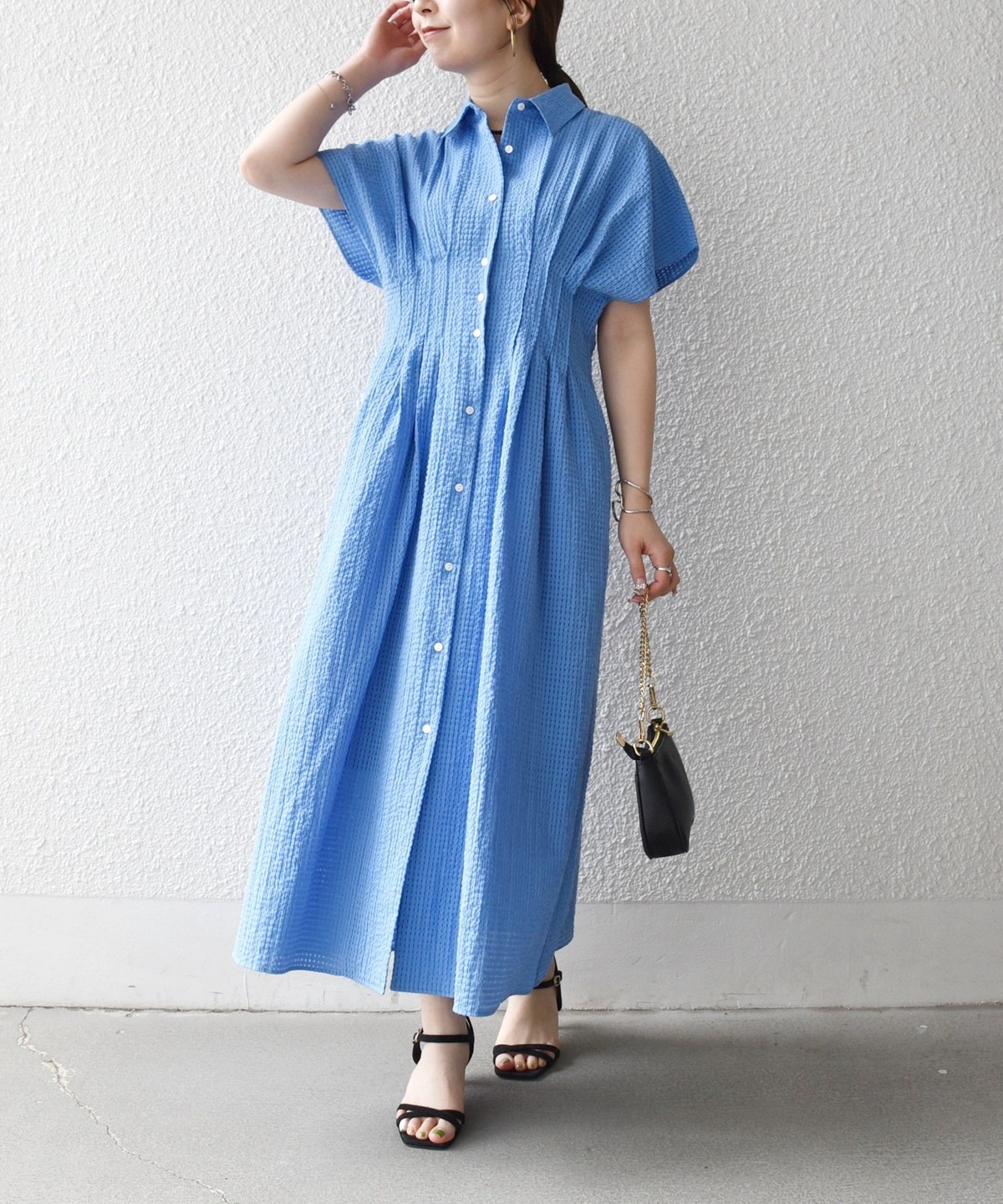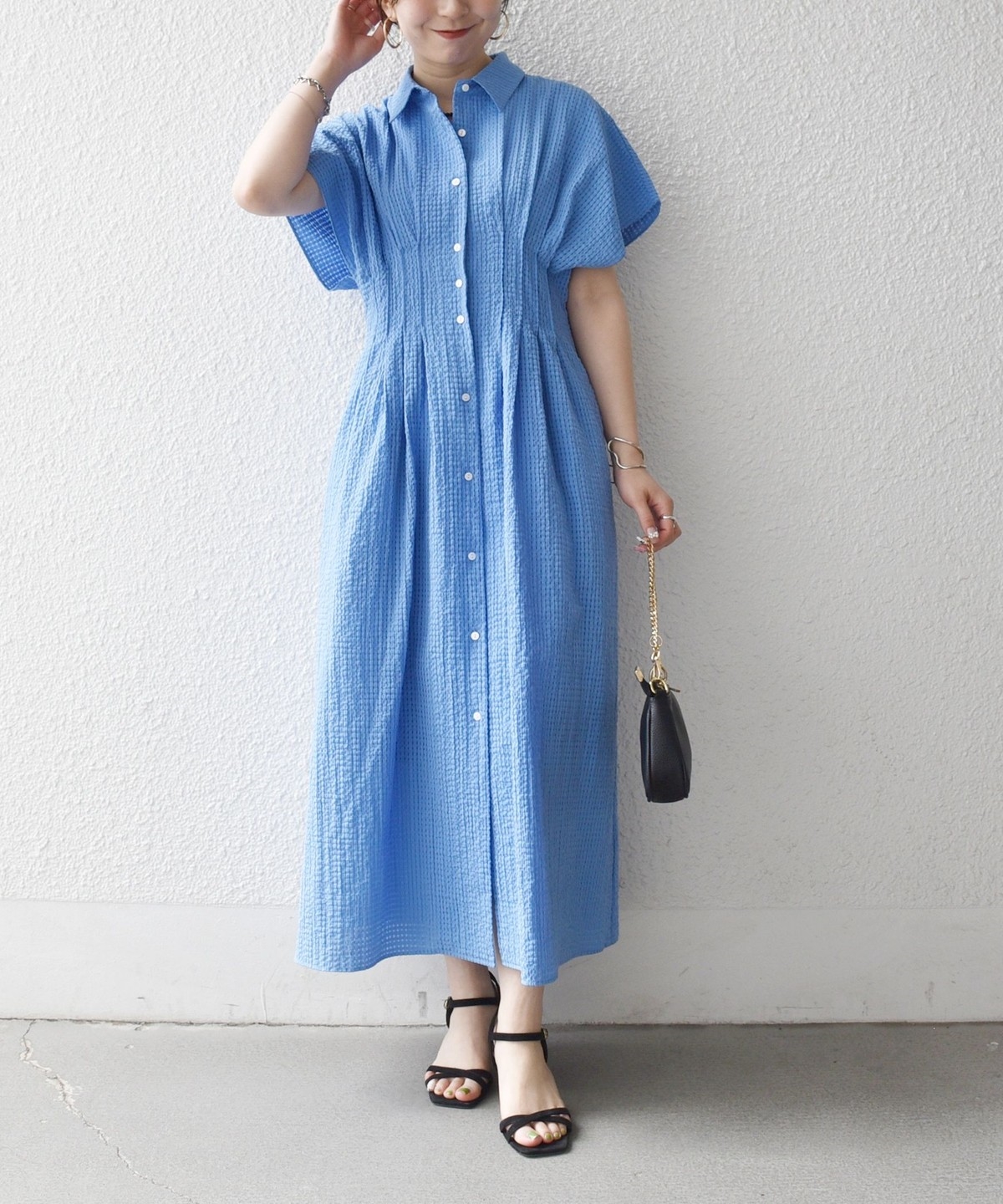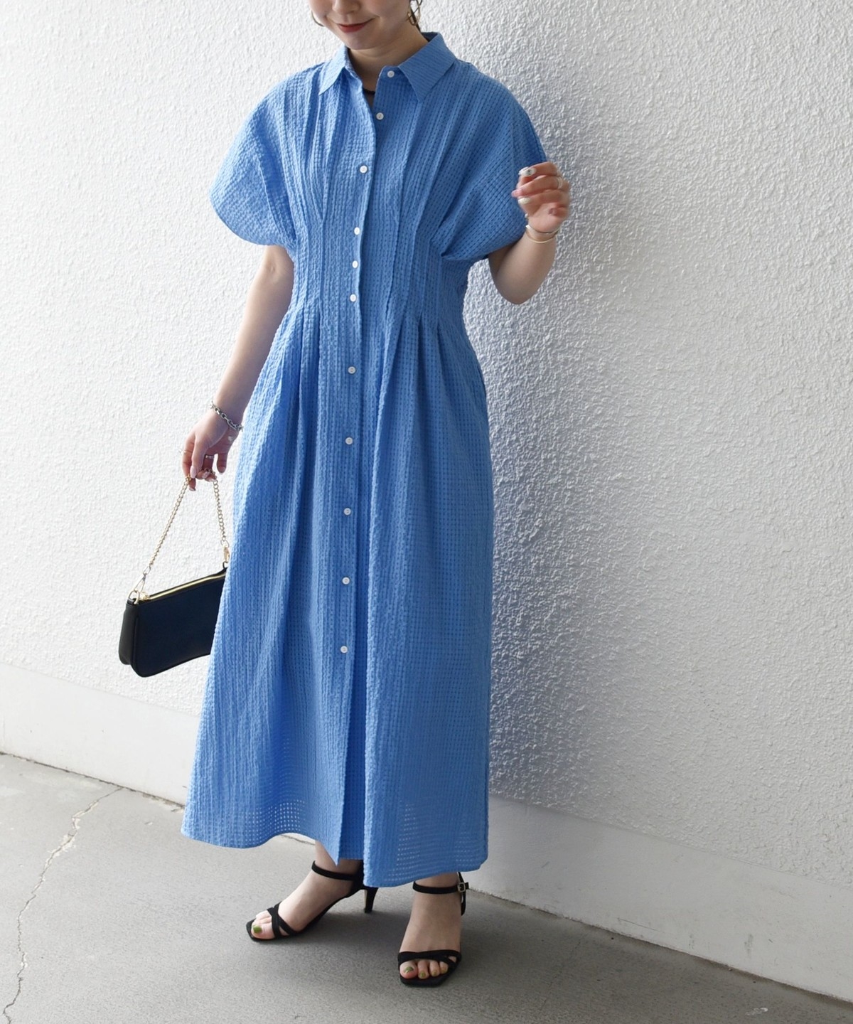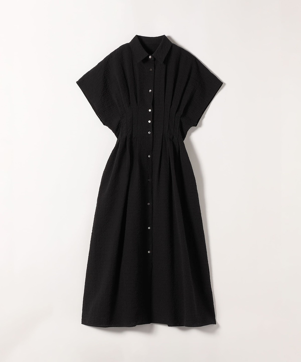 ウエストをタックでシェイプした、メリハリのあるシルエットが女性らしい雰囲気を演出。