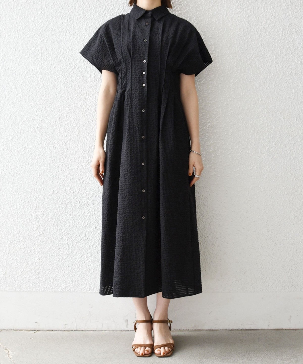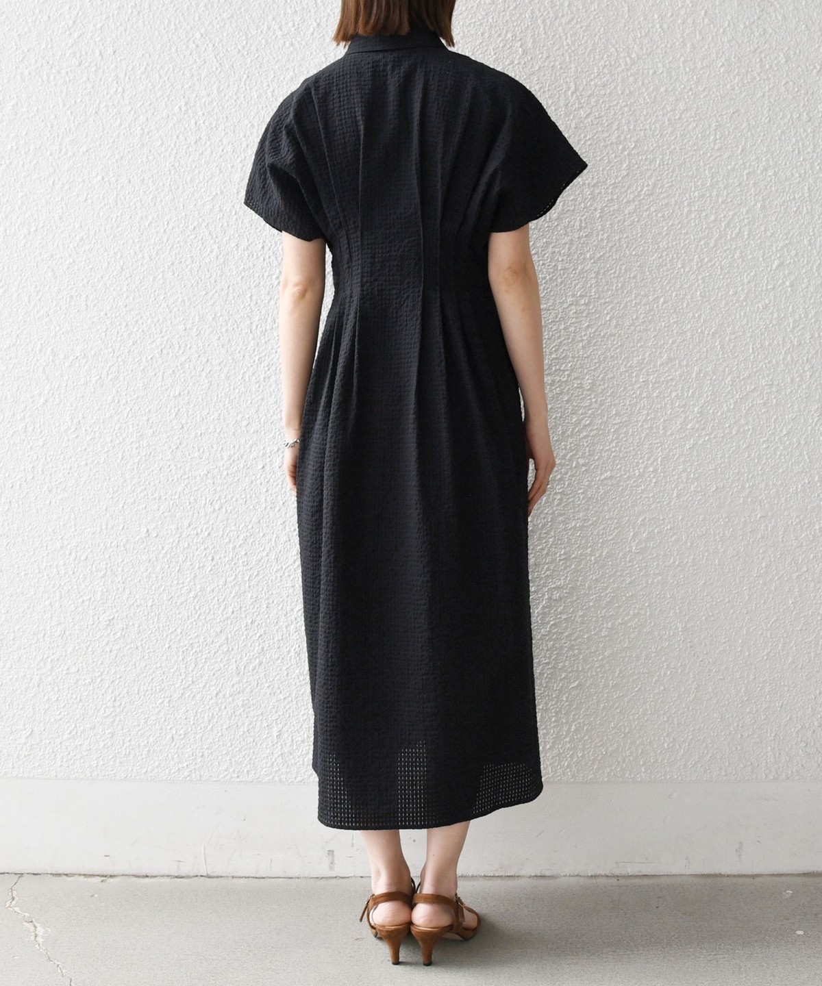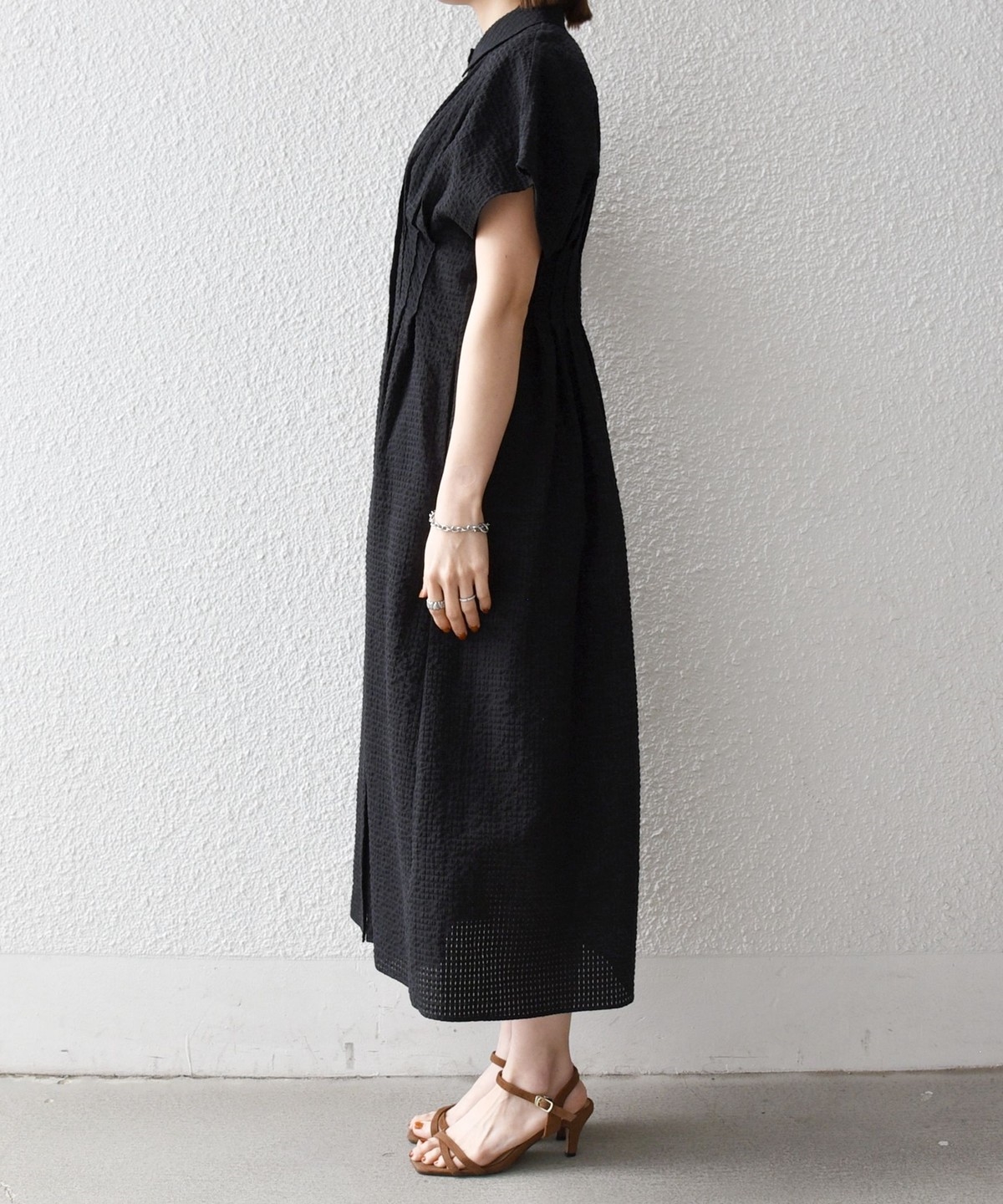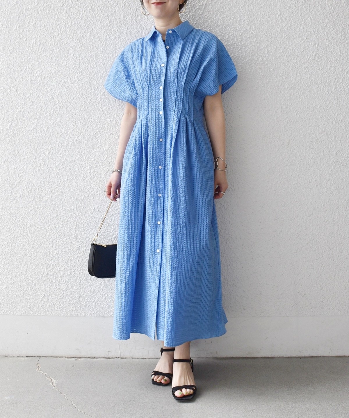 ウエストをタックでシェイプした、メリハリのあるシルエットが女性らしい雰囲気を演出。