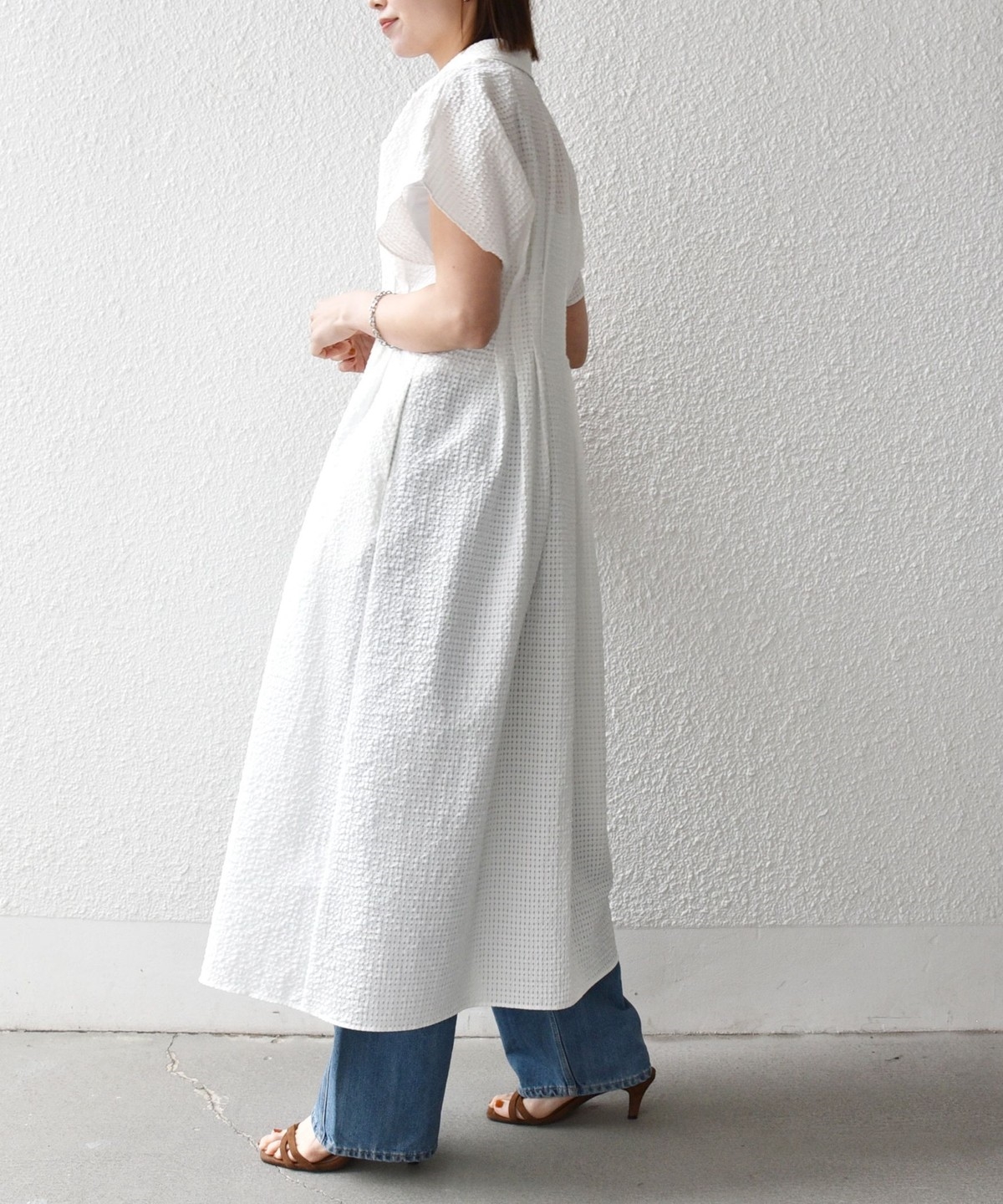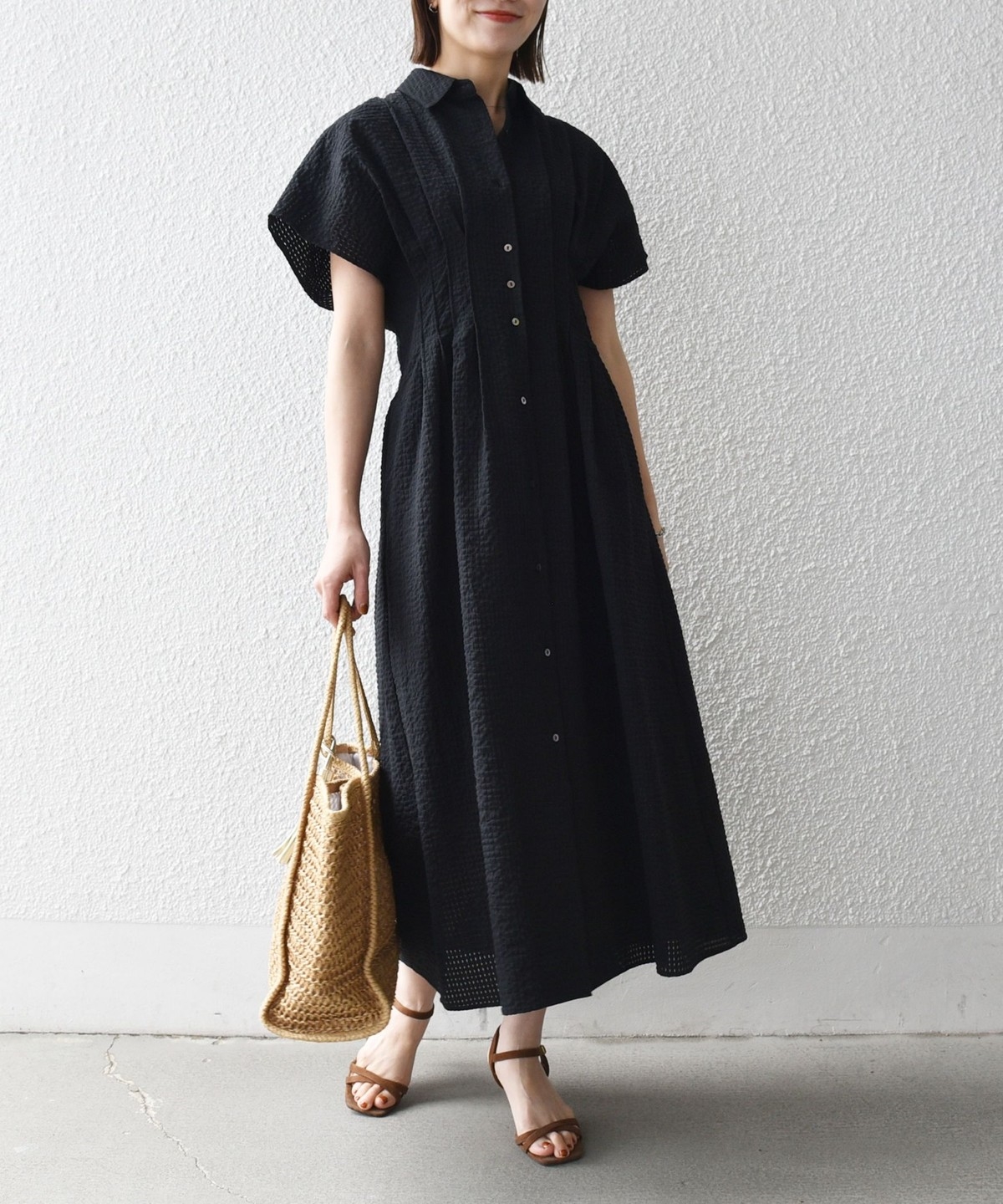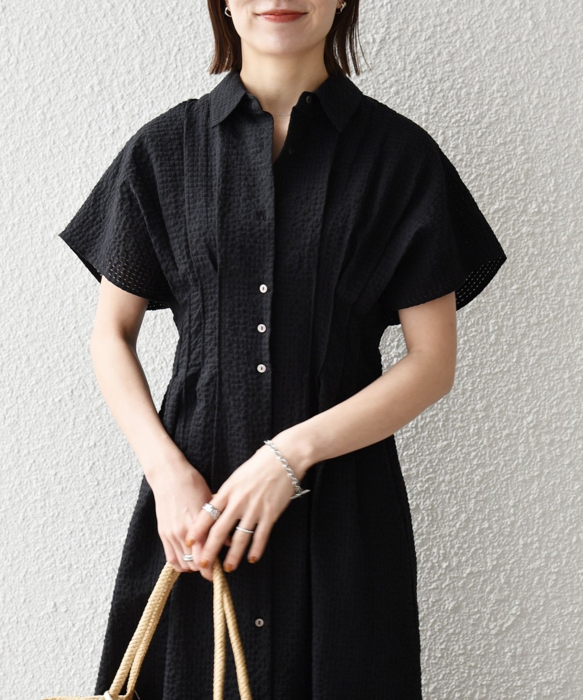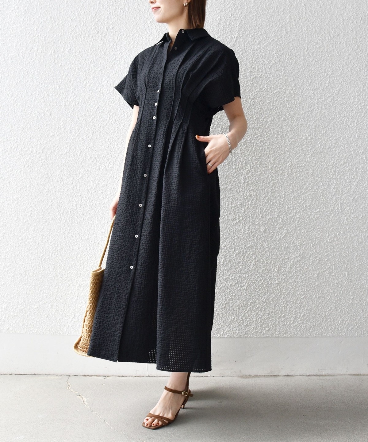 ウエストをタックでシェイプした、メリハリのあるシルエットが女性らしい雰囲気を演出。