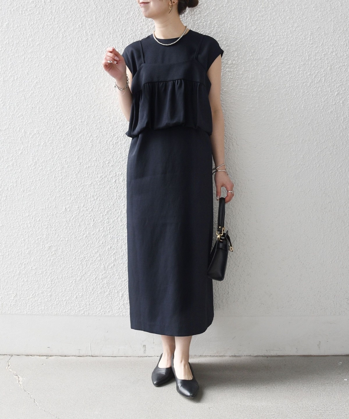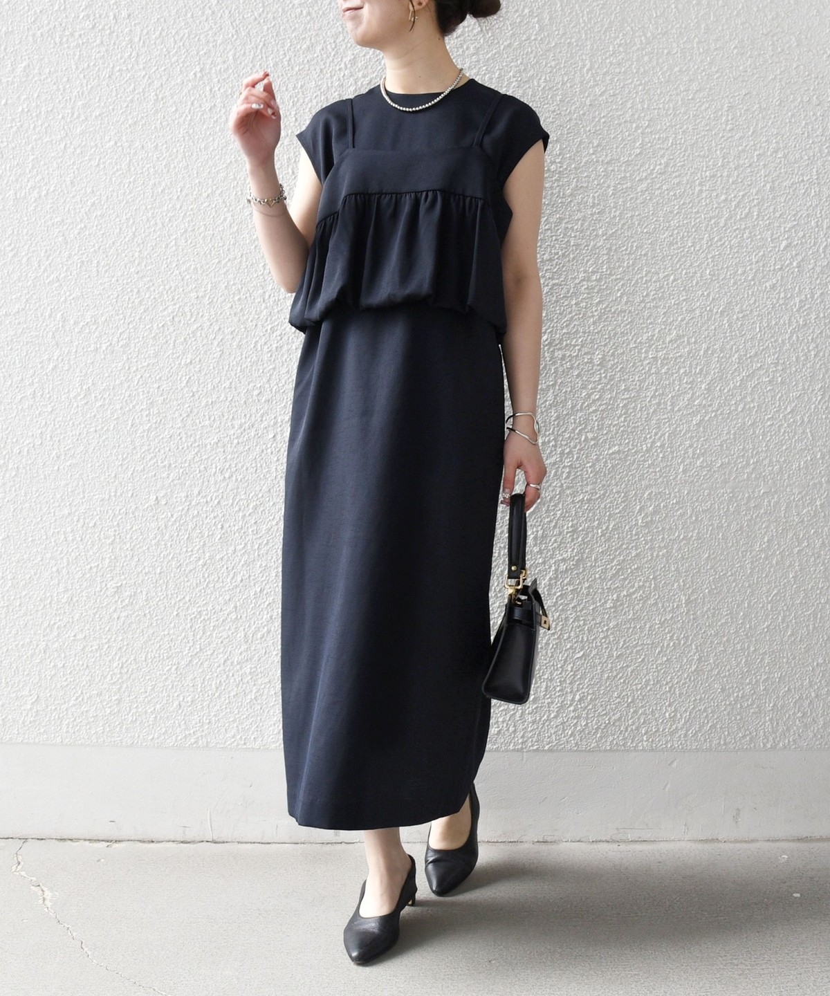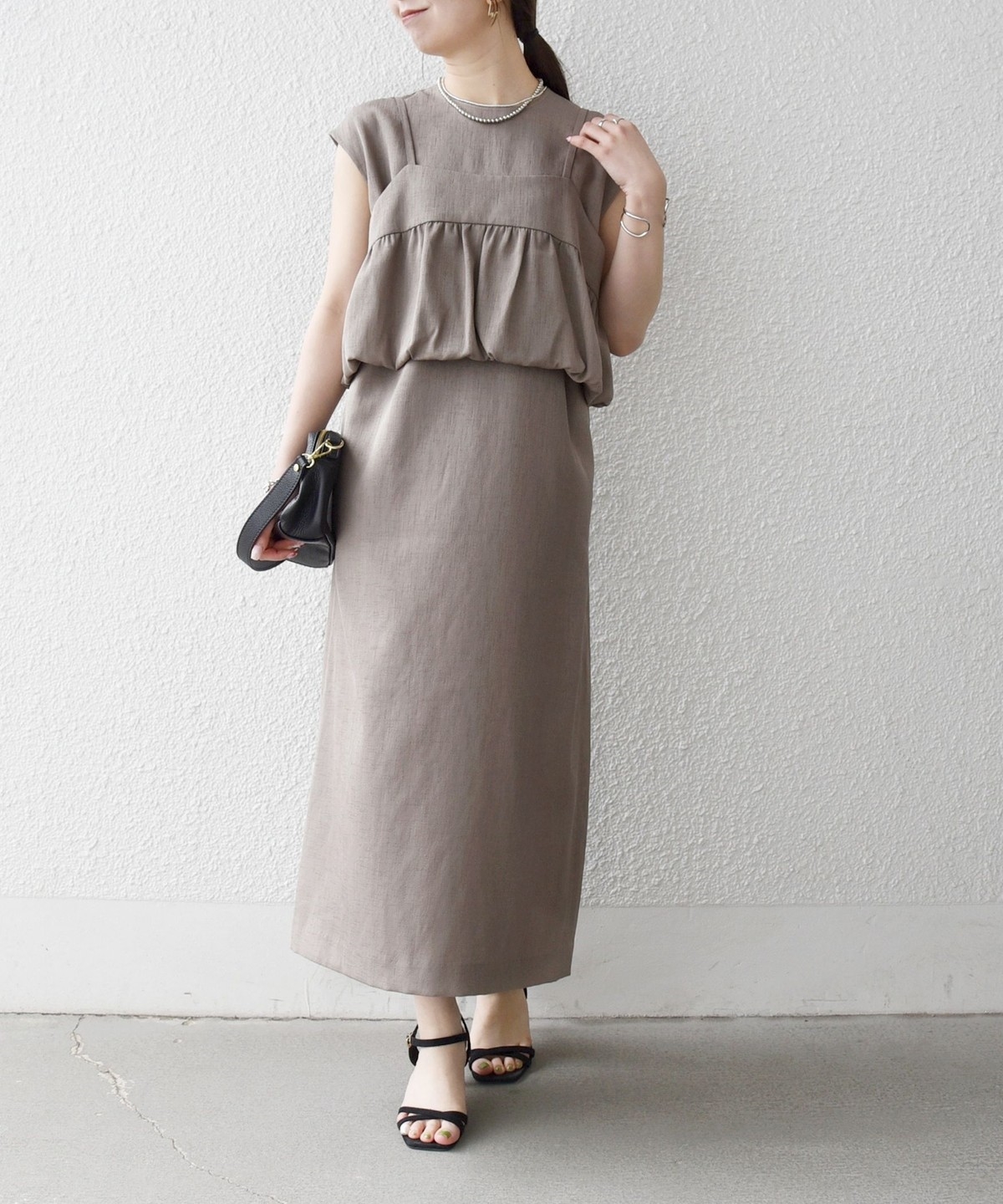 ギャザーを寄せた立体感のあるディテールのキャミソールと、フレンチスリーブワンピースのセットアイテム。