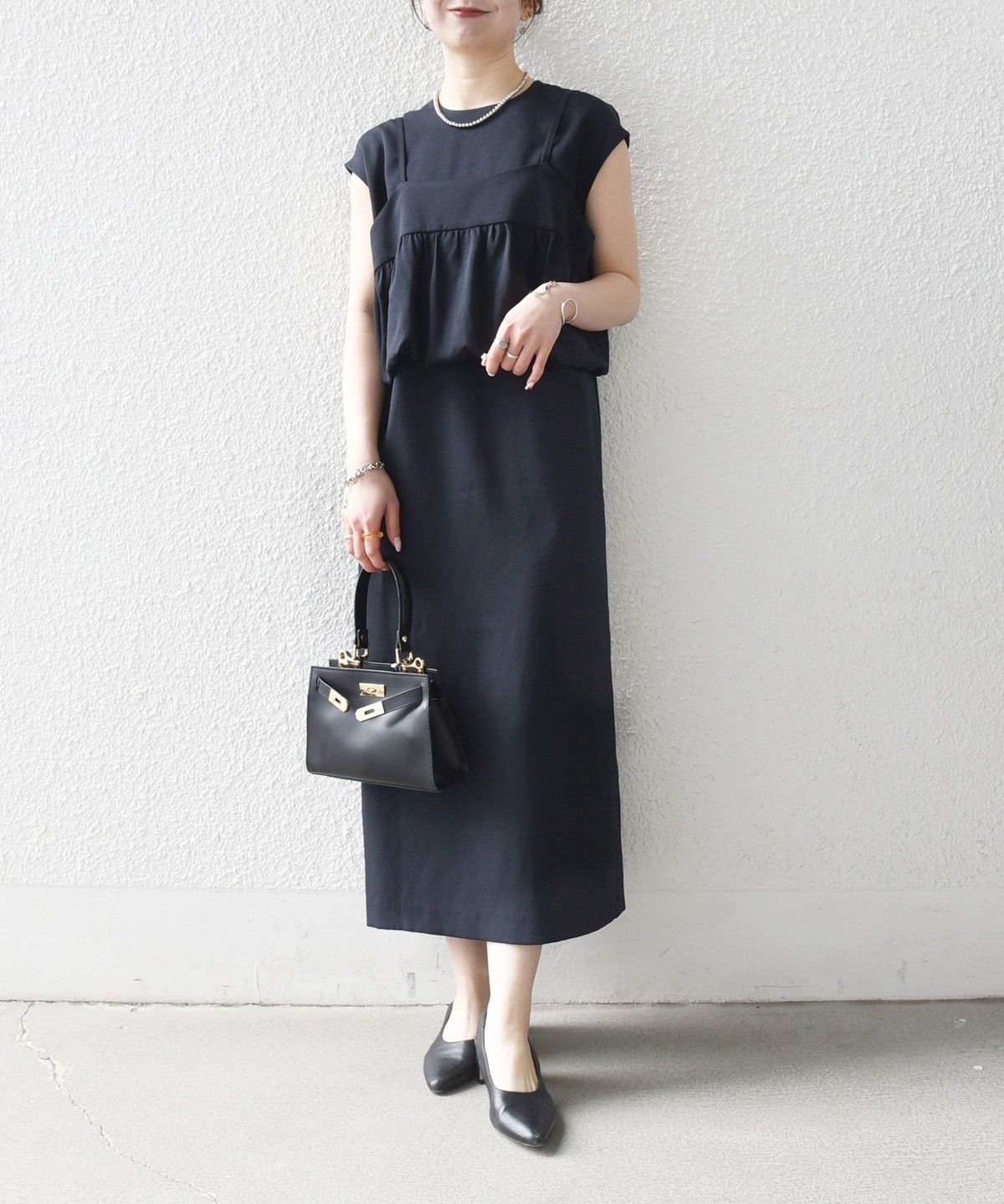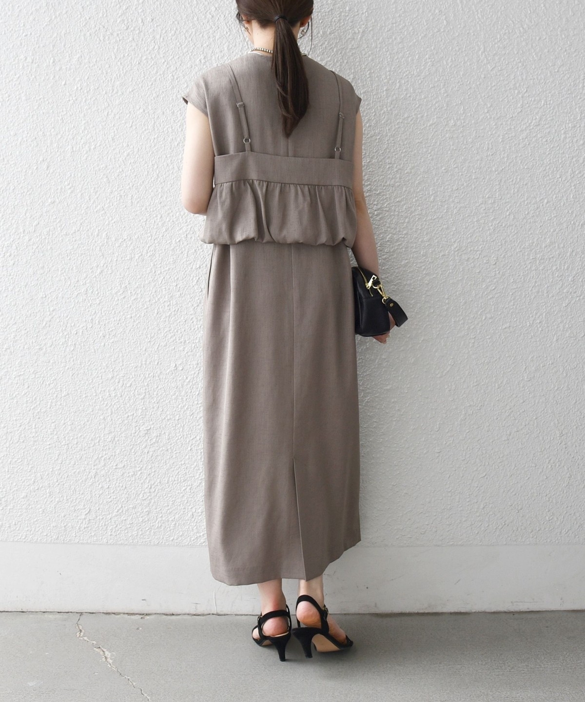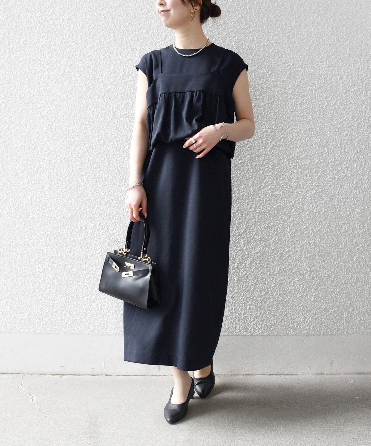 ギャザーを寄せた立体感のあるディテールのキャミソールと、フレンチスリーブワンピースのセットアイテム。