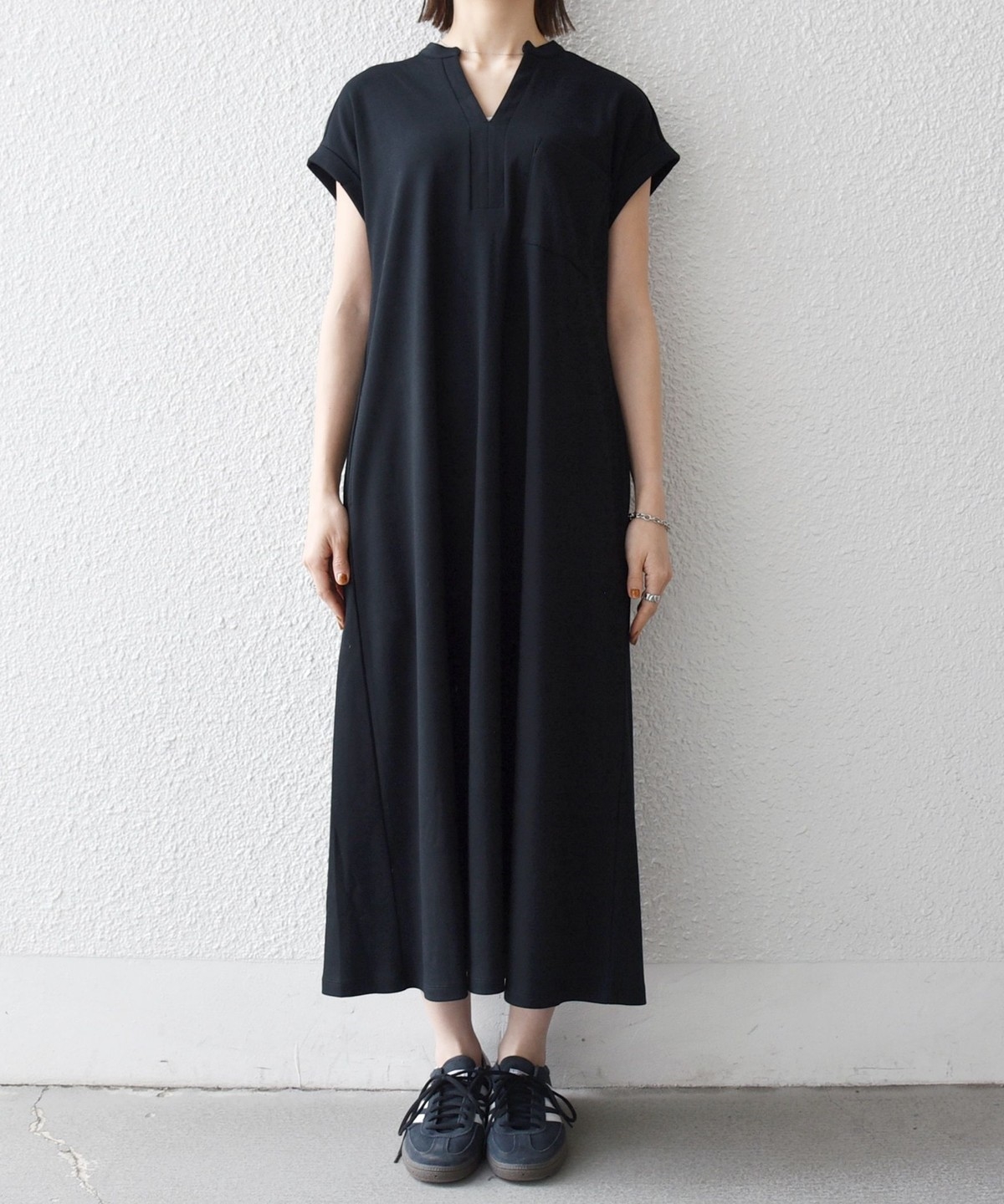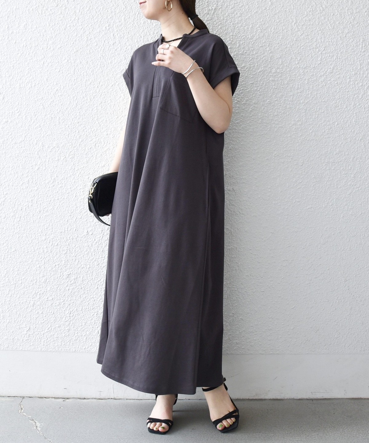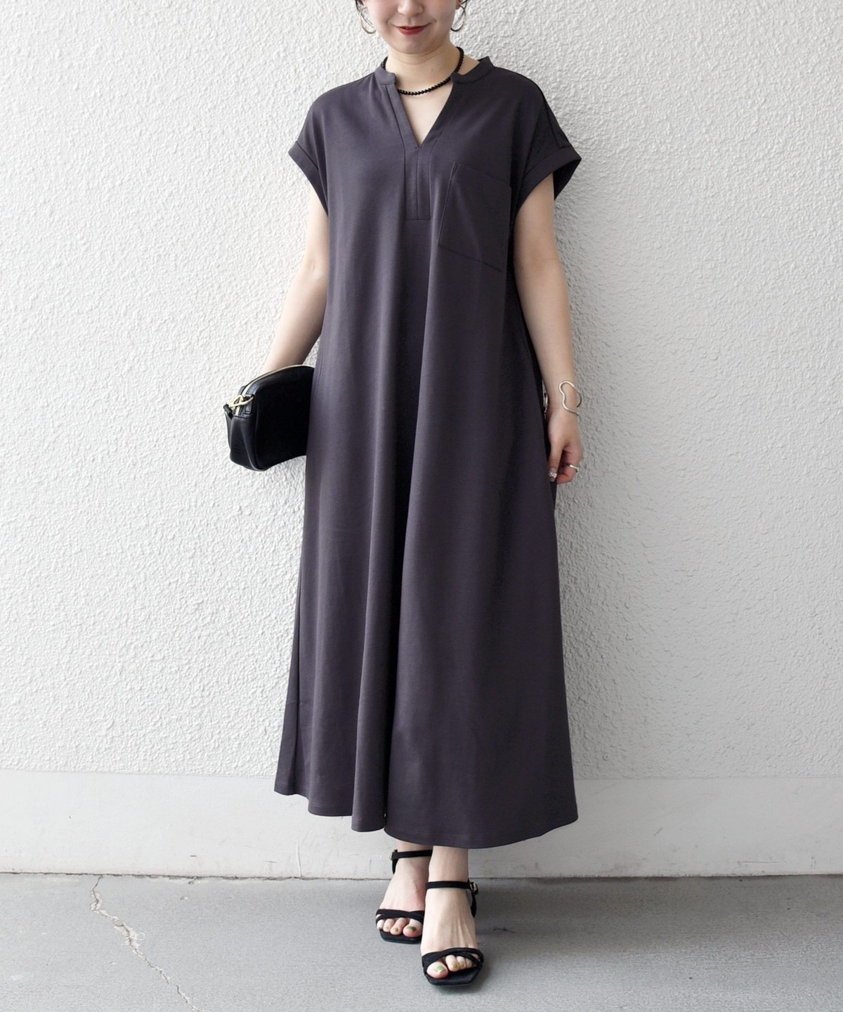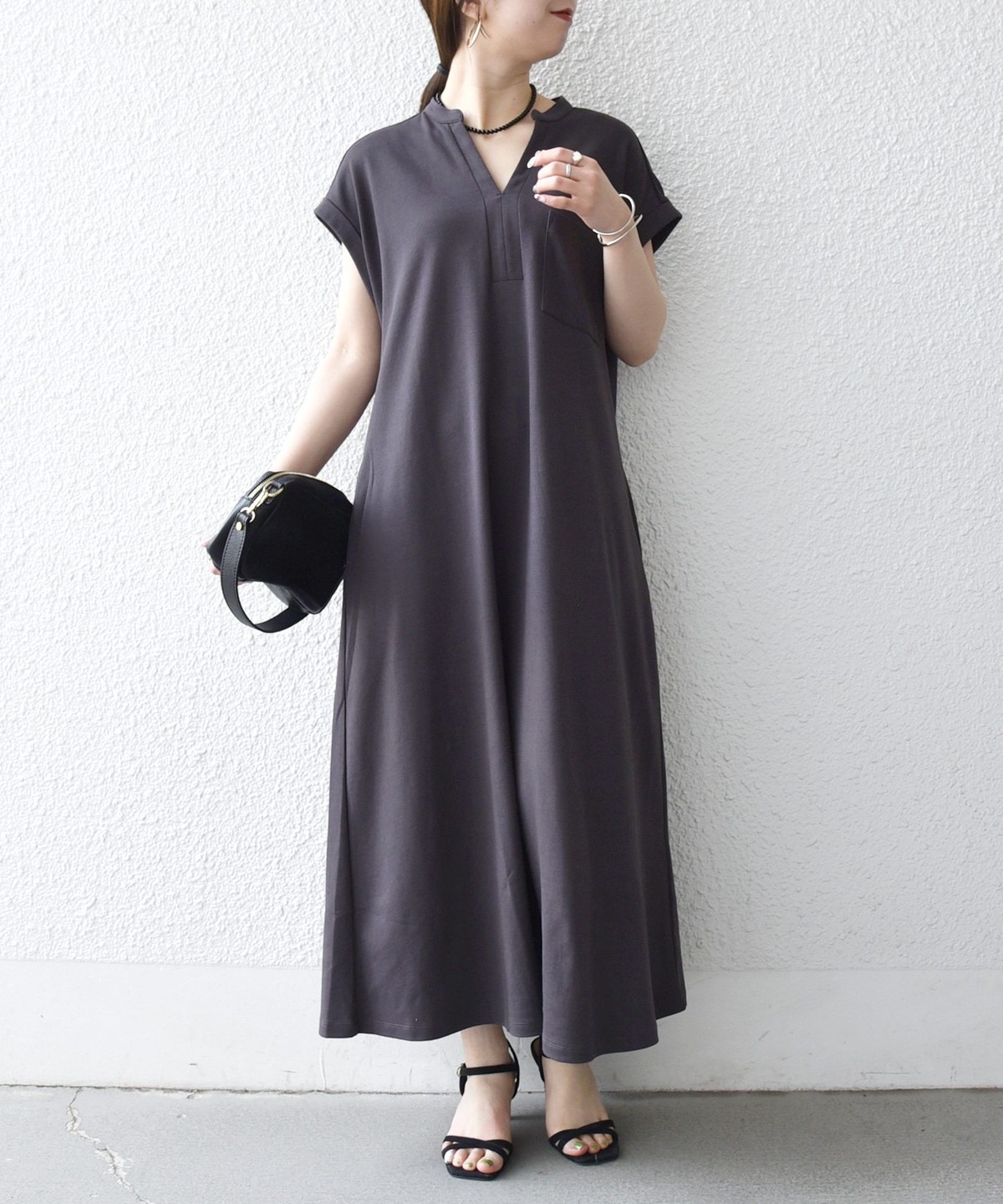 キーネックのすっきりとしたV開きと、シャツワンピのようなデザインがポイントのワンピース。