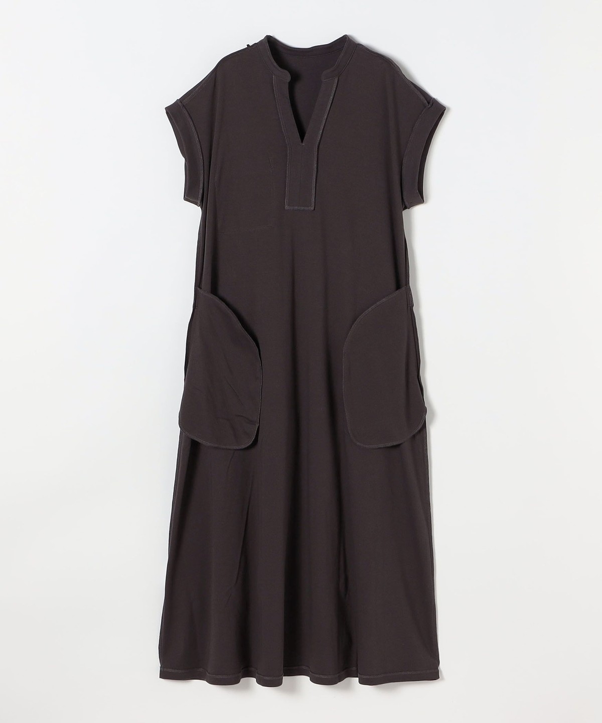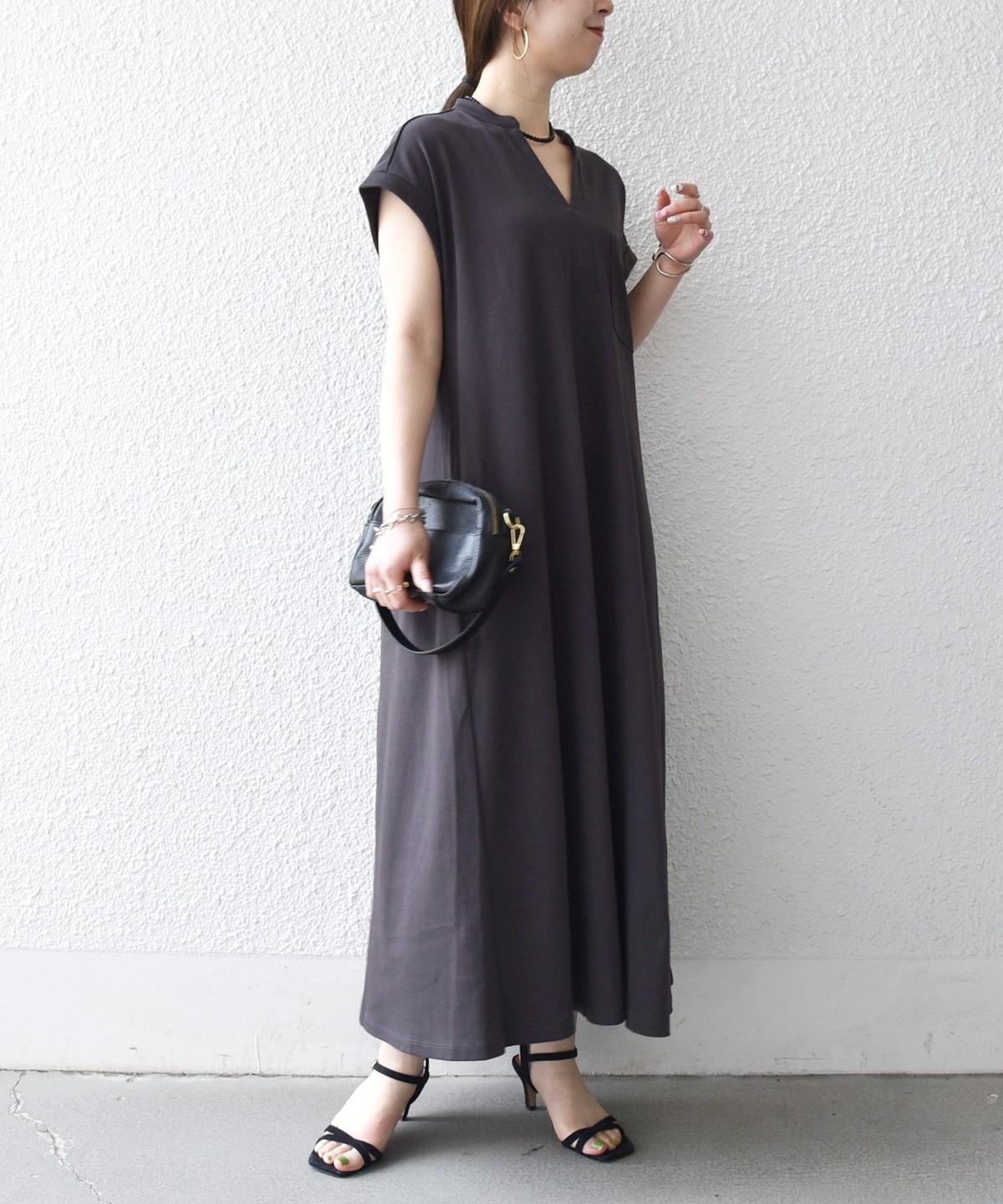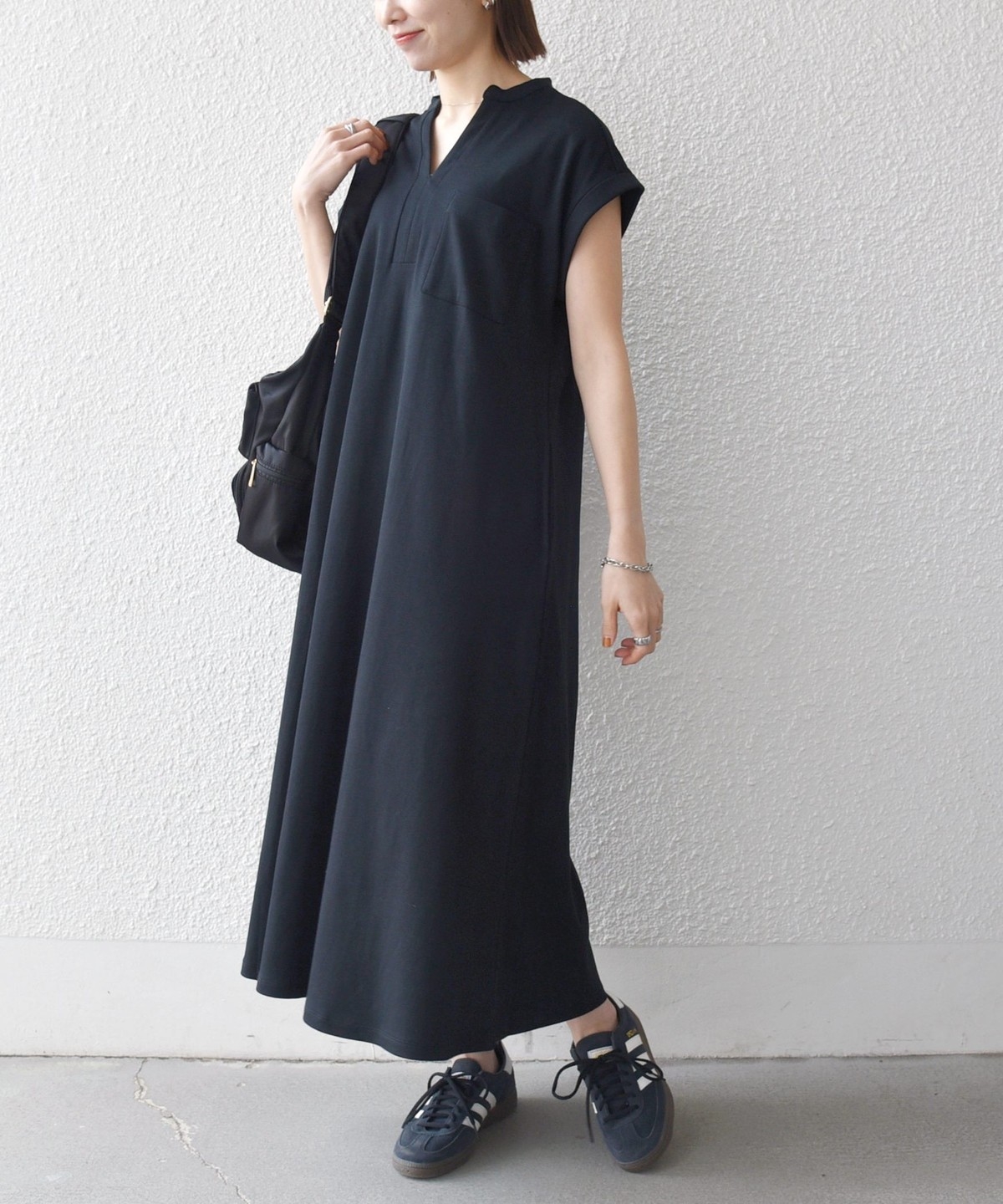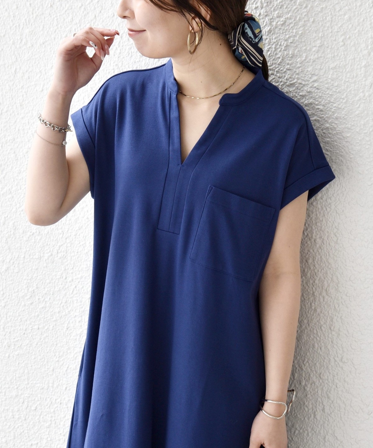 キーネックのすっきりとしたV開きと、シャツワンピのようなデザインがポイントのワンピース。