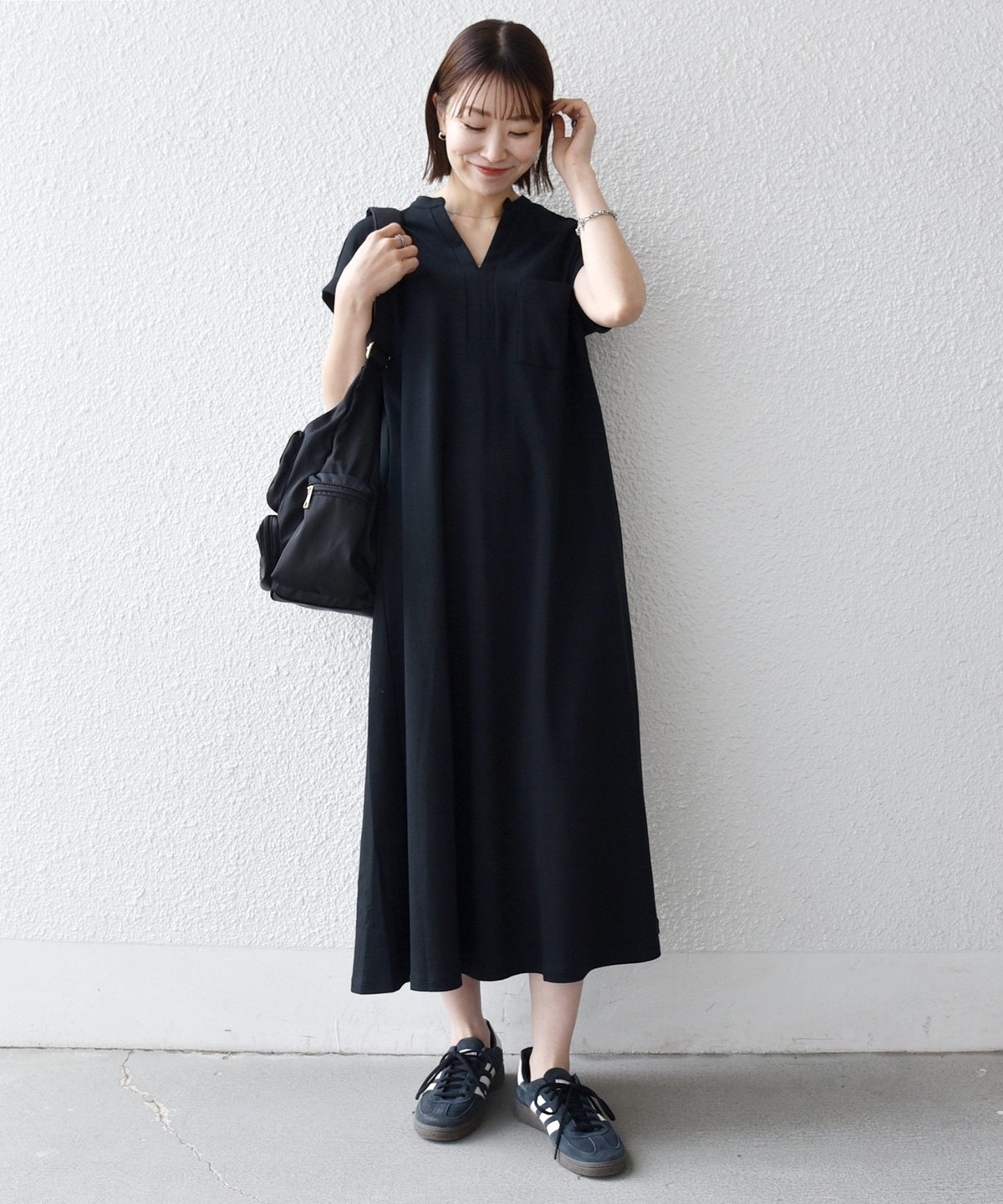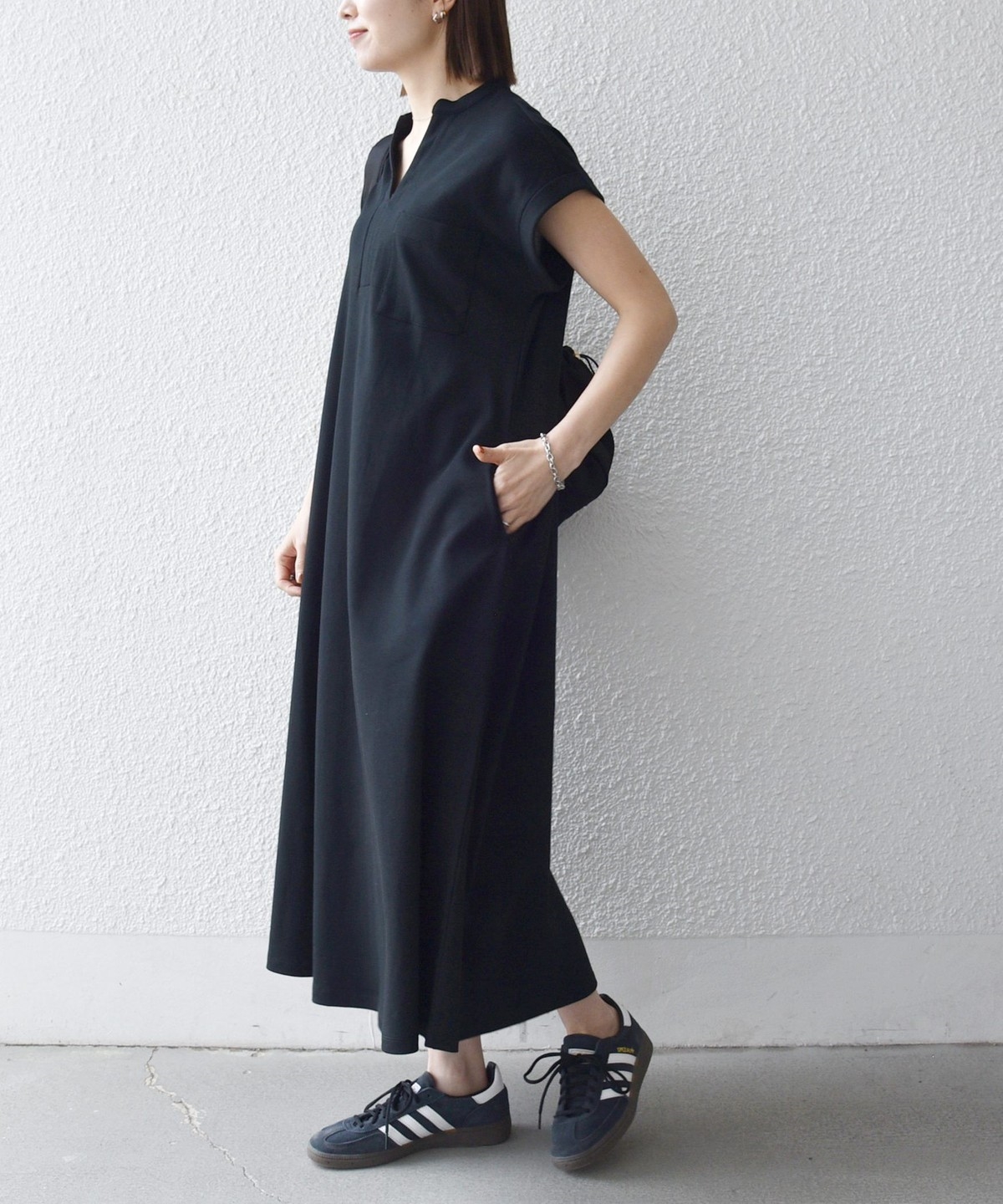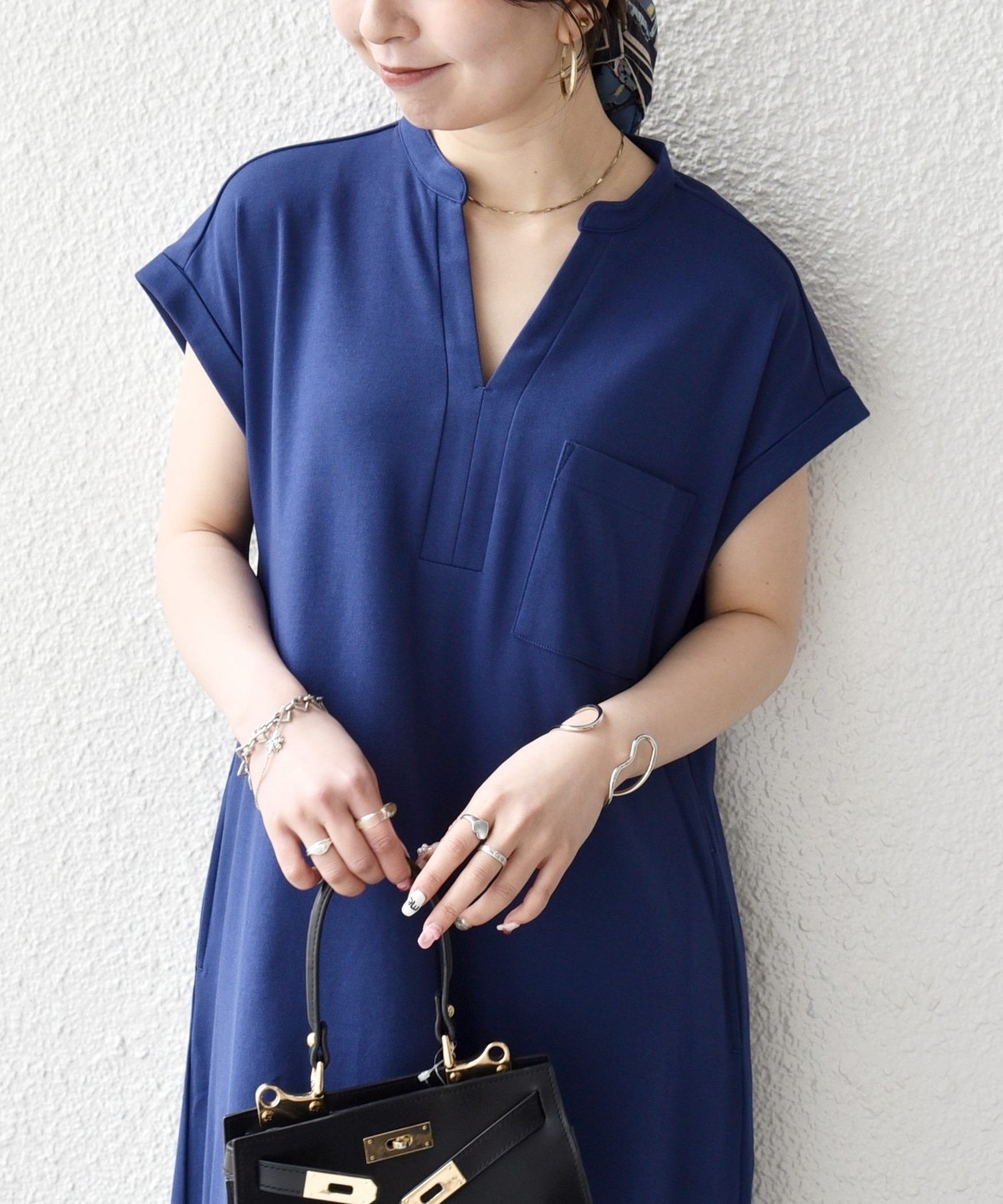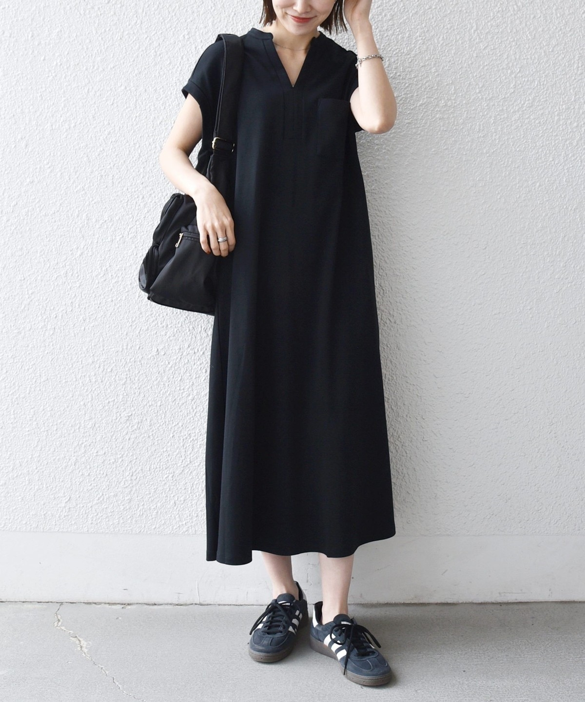 キーネックのすっきりとしたV開きと、シャツワンピのようなデザインがポイントのワンピース。