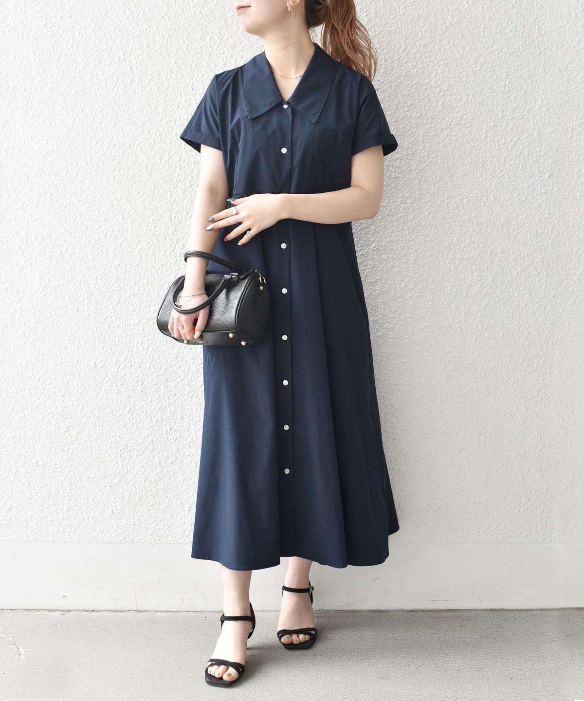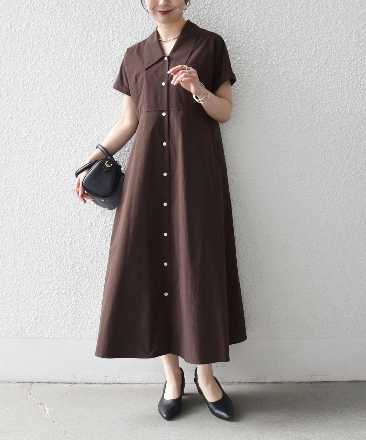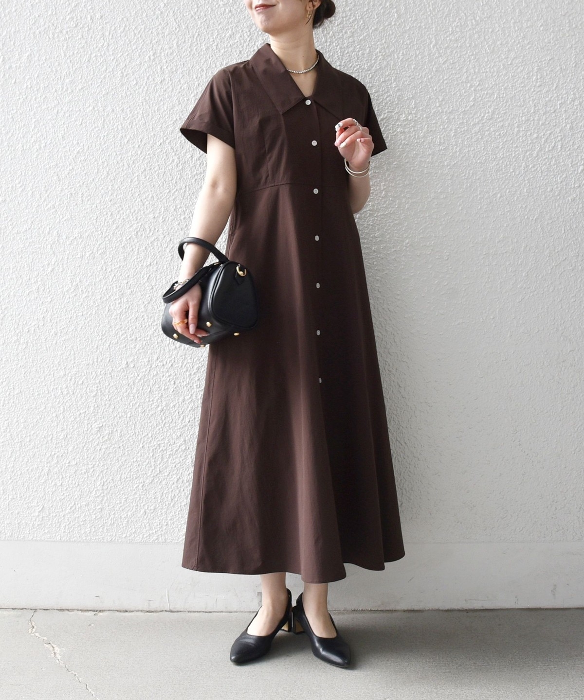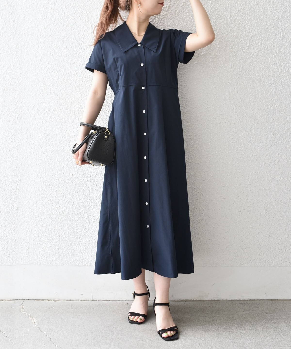 やや深めに開いたフラットカラーがクラシックな印象のAラインフレアワンピース。