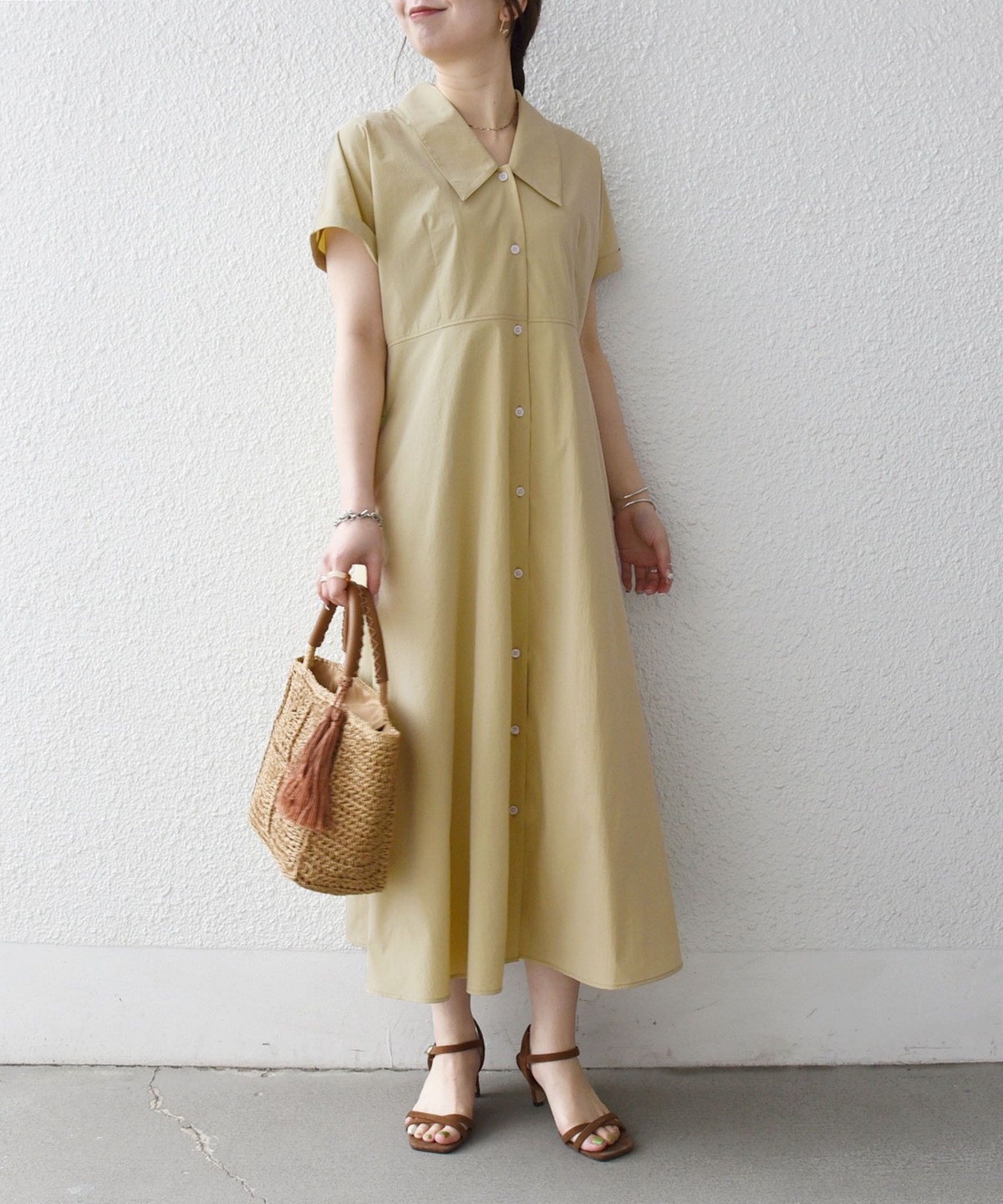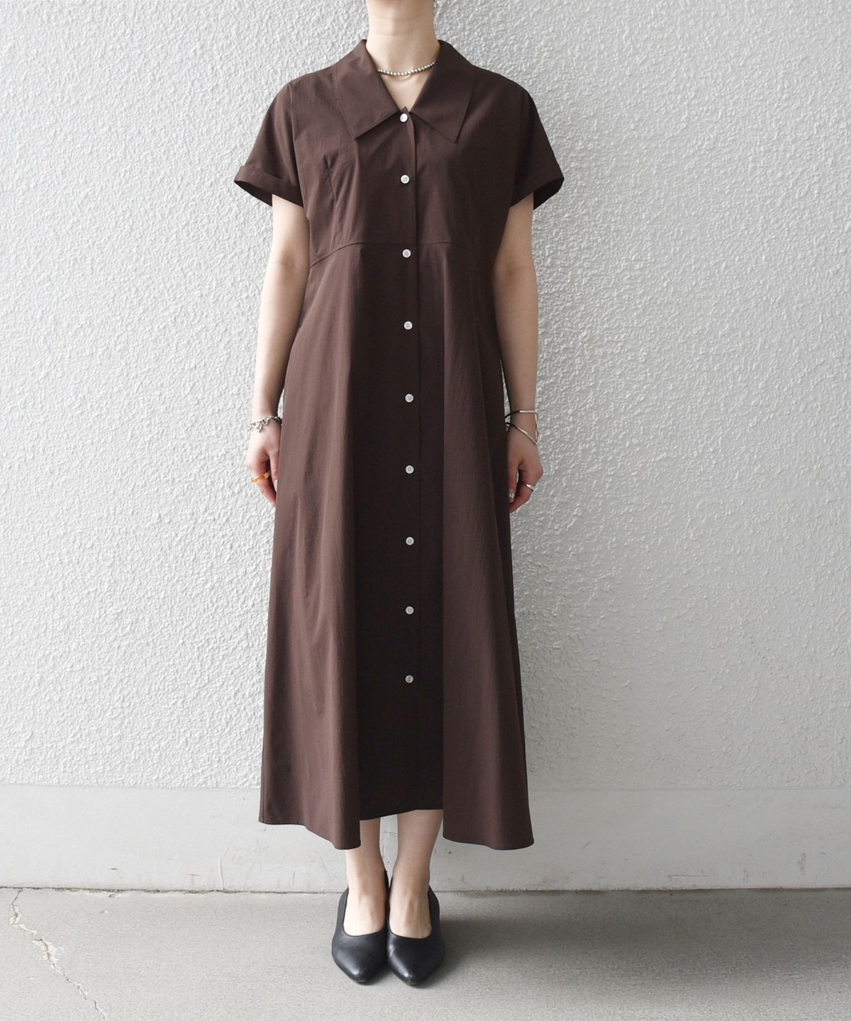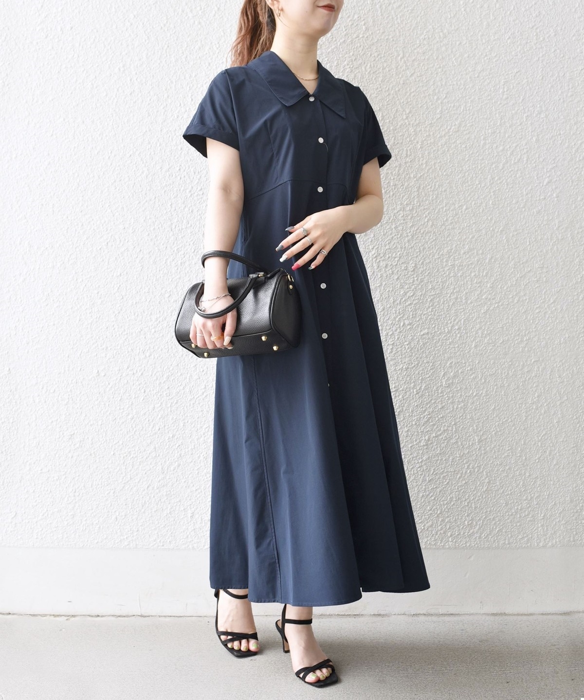 やや深めに開いたフラットカラーがクラシックな印象のAラインフレアワンピース。