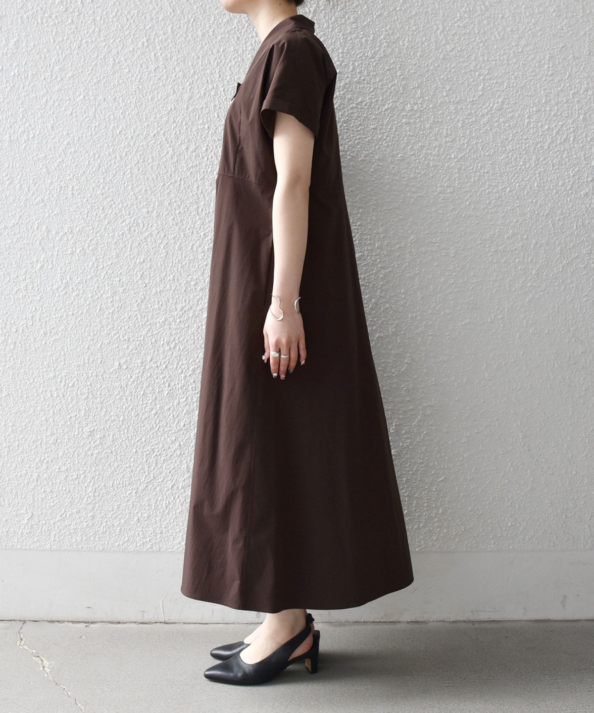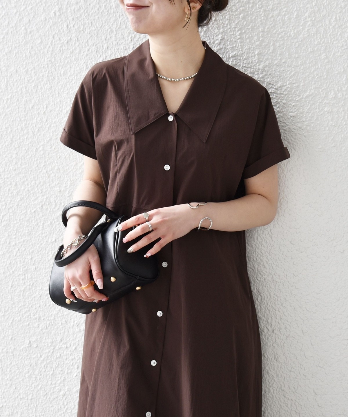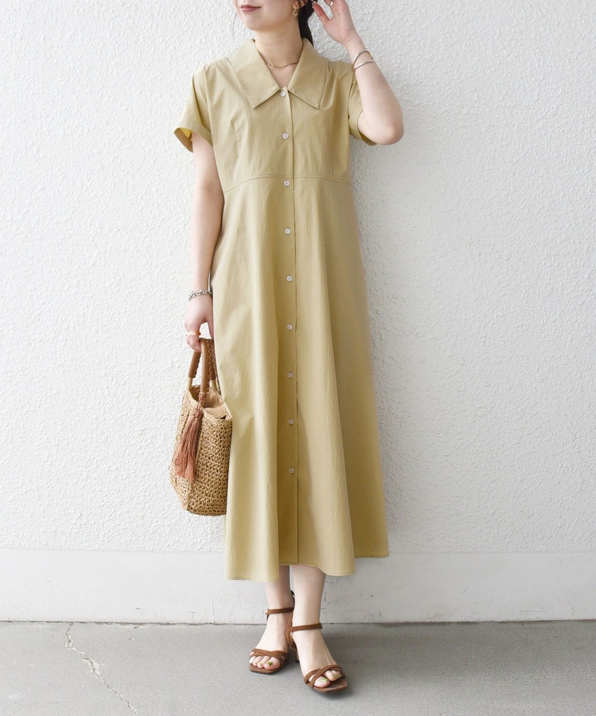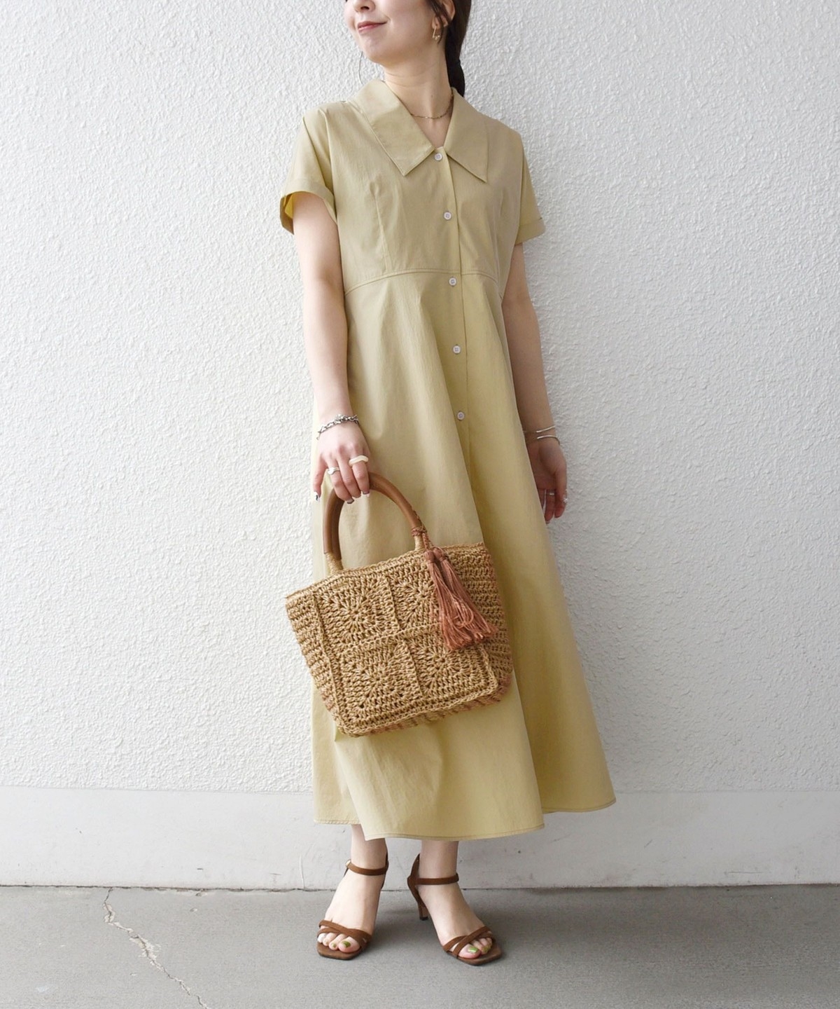やや深めに開いたフラットカラーがクラシックな印象のAラインフレアワンピース。