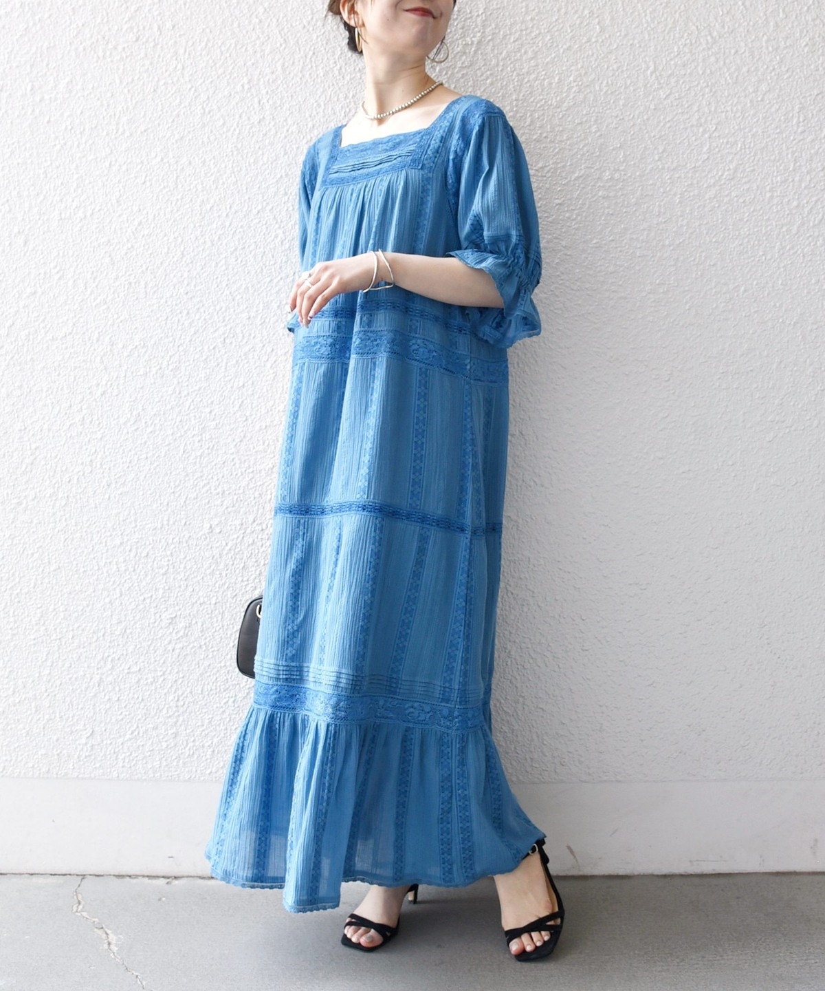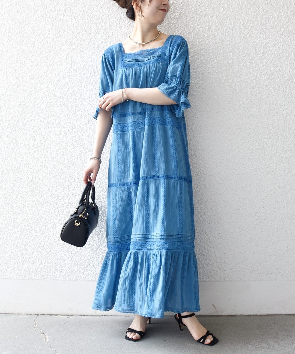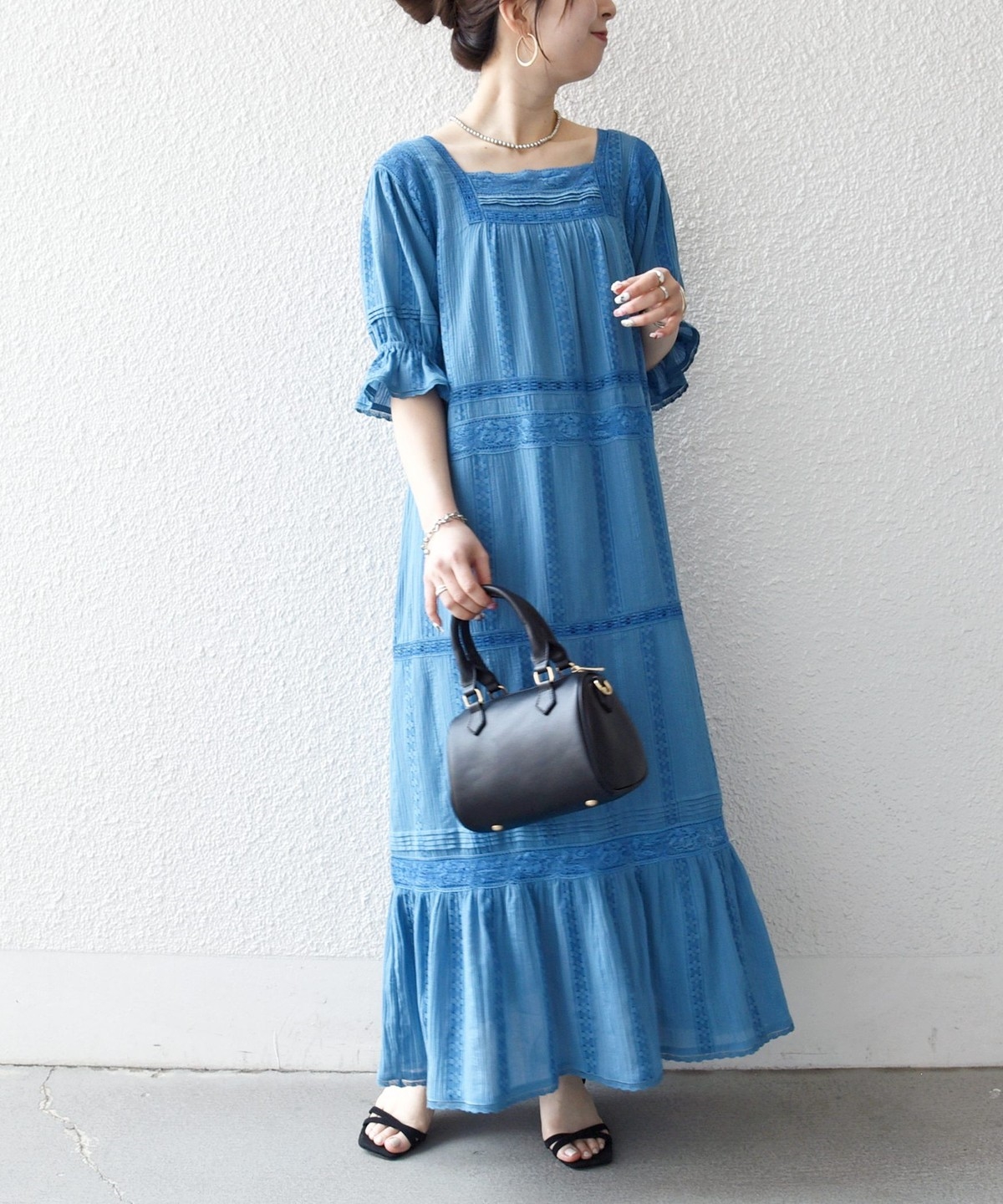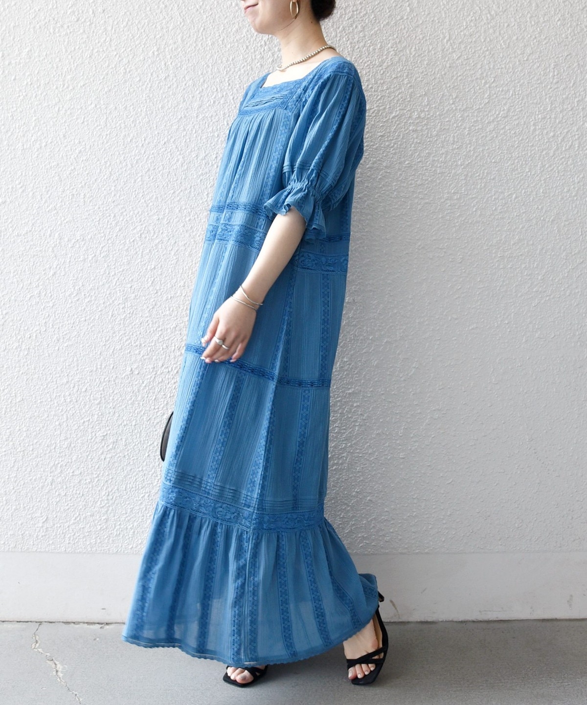 襟元のレースがアンティークな雰囲気を演出する、マキシ丈ワンピース。