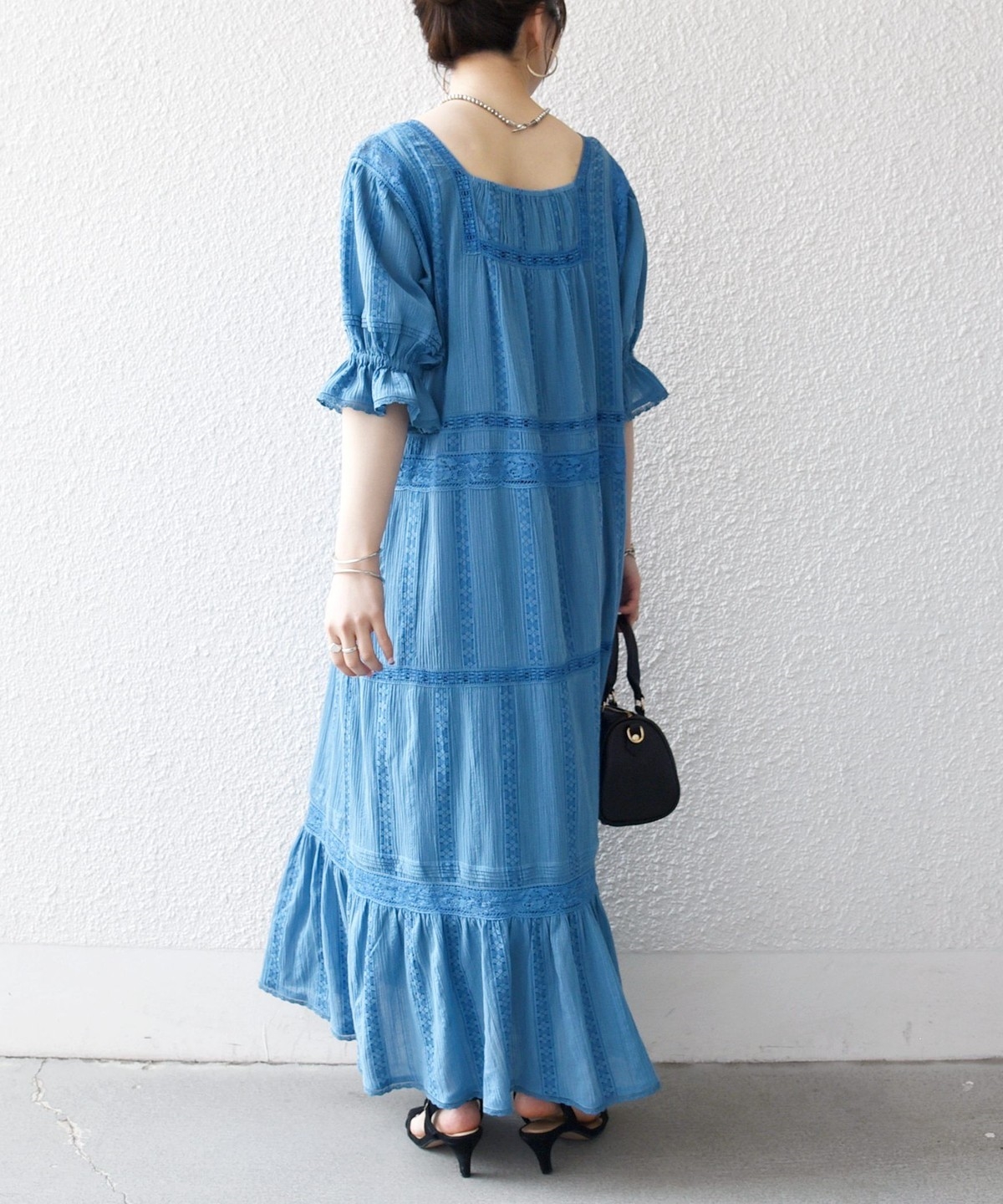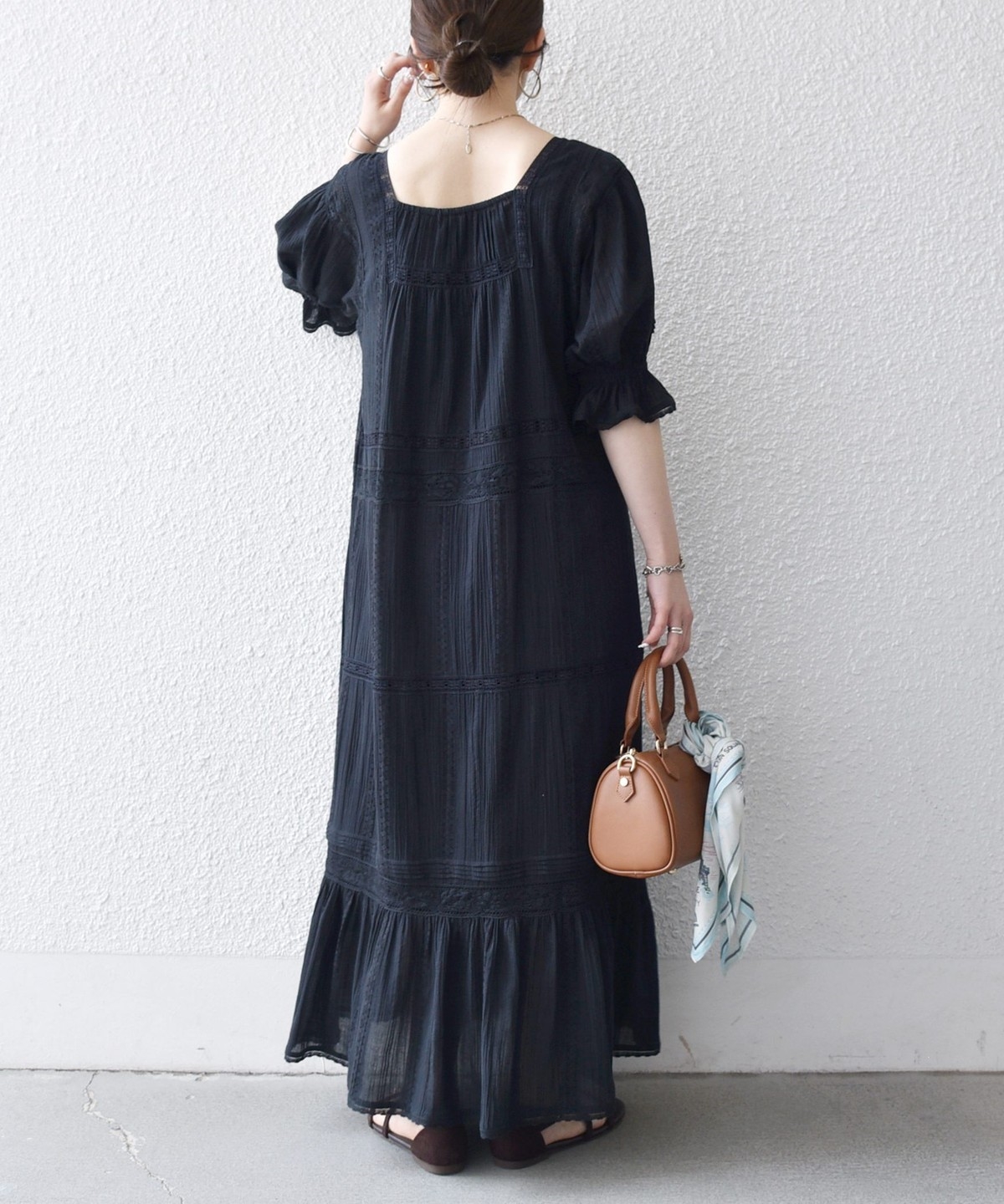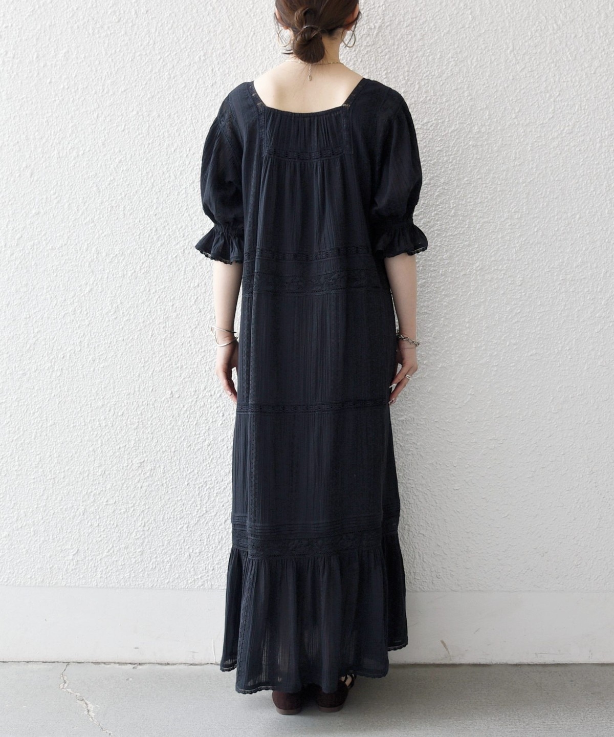 襟元のレースがアンティークな雰囲気を演出する、マキシ丈ワンピース。