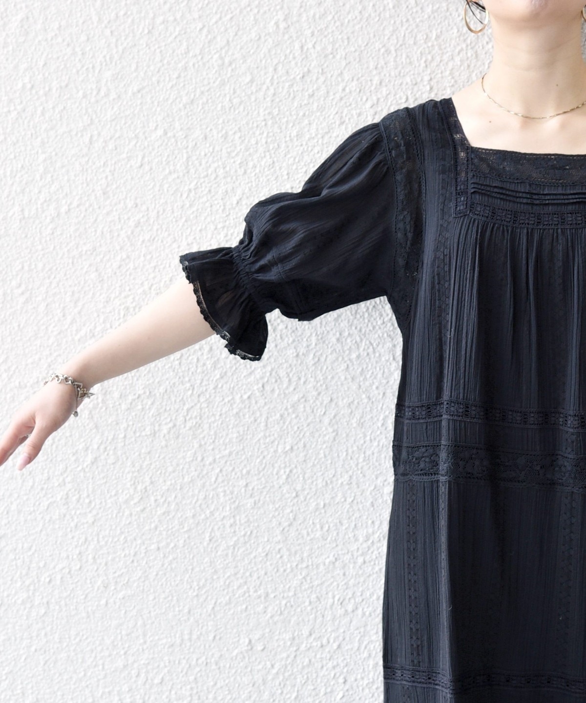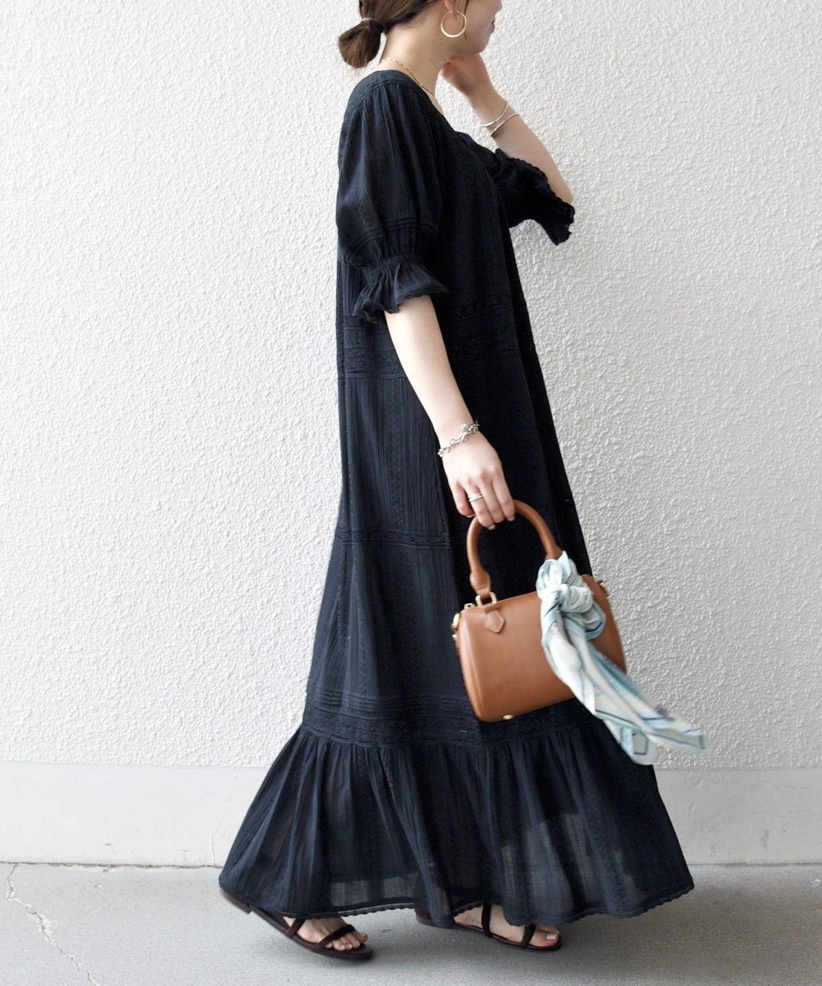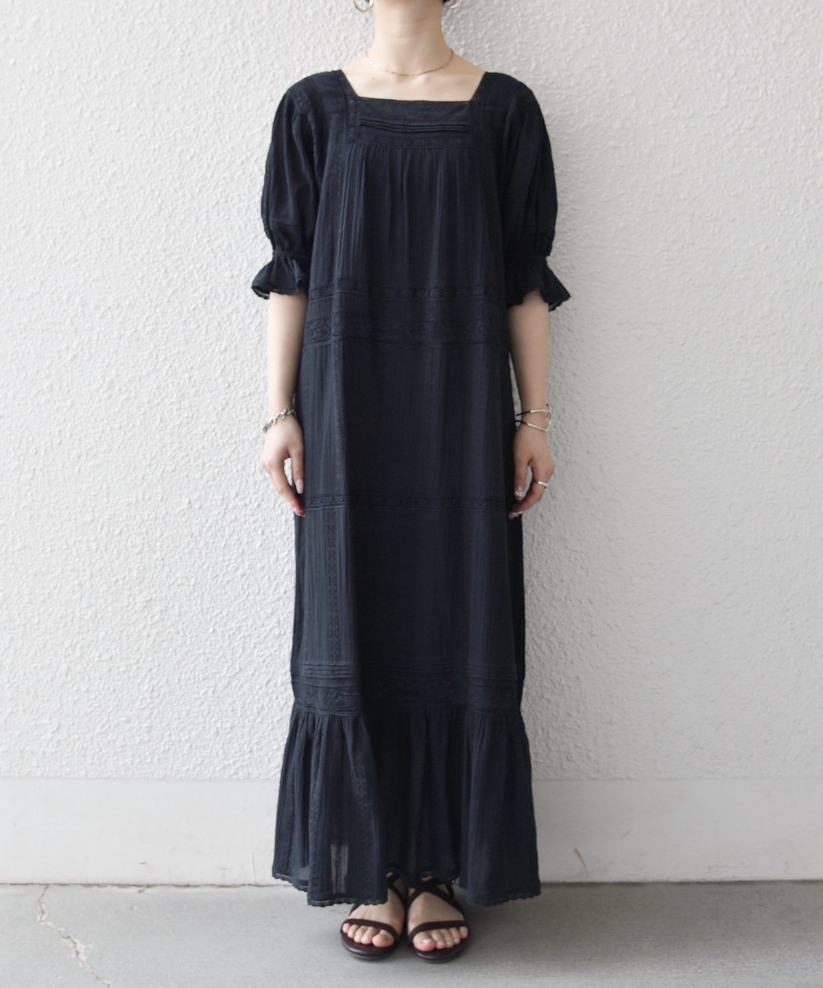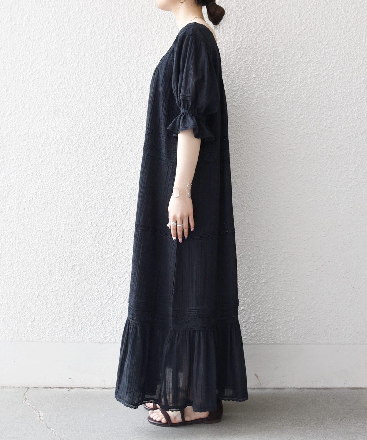 襟元のレースがアンティークな雰囲気を演出する、マキシ丈ワンピース。