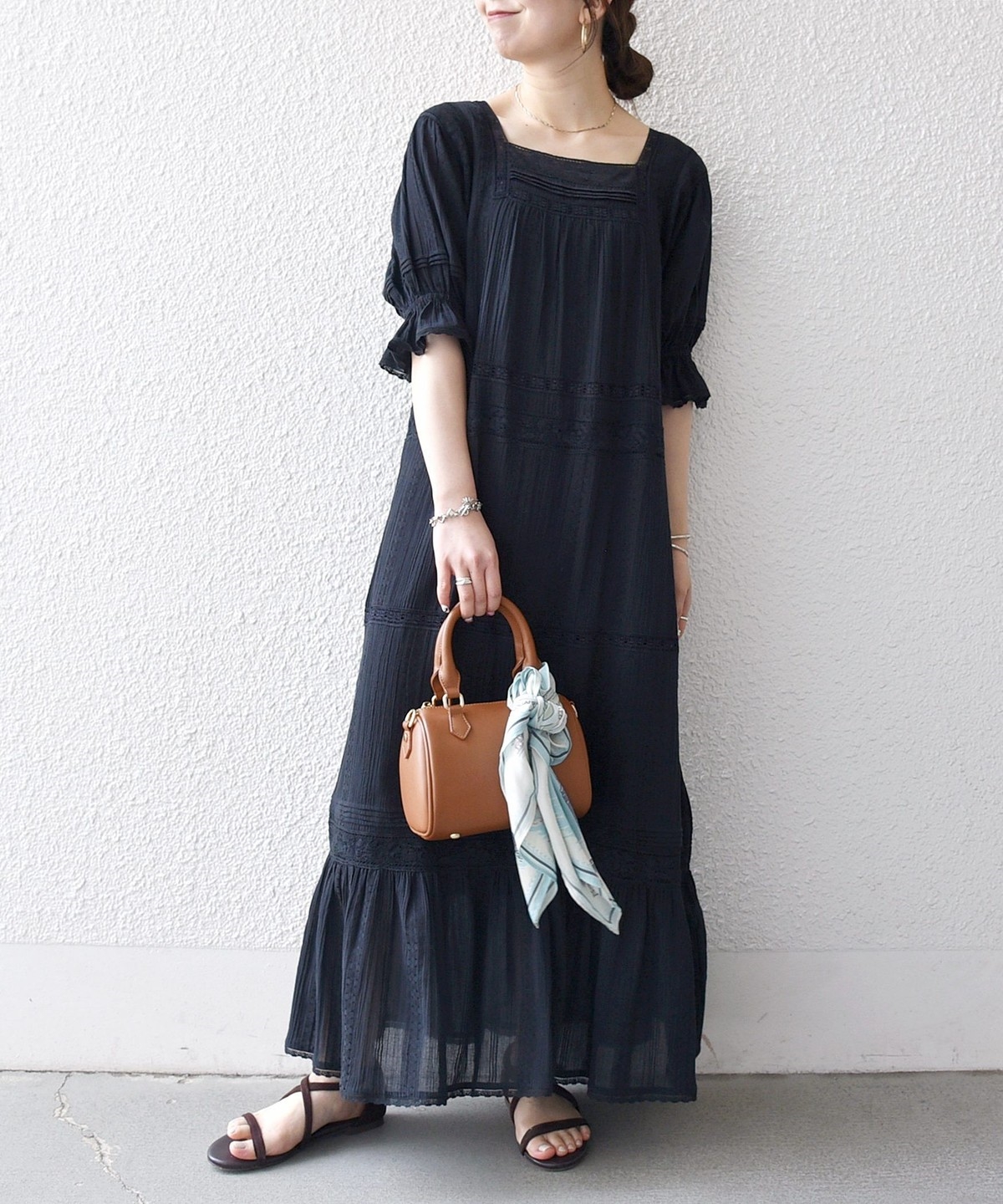 顔まわりをすっきり見せてくれるスクエアネックもポイント。