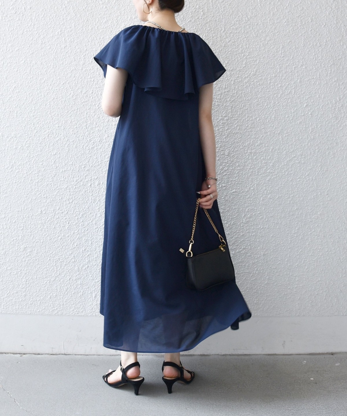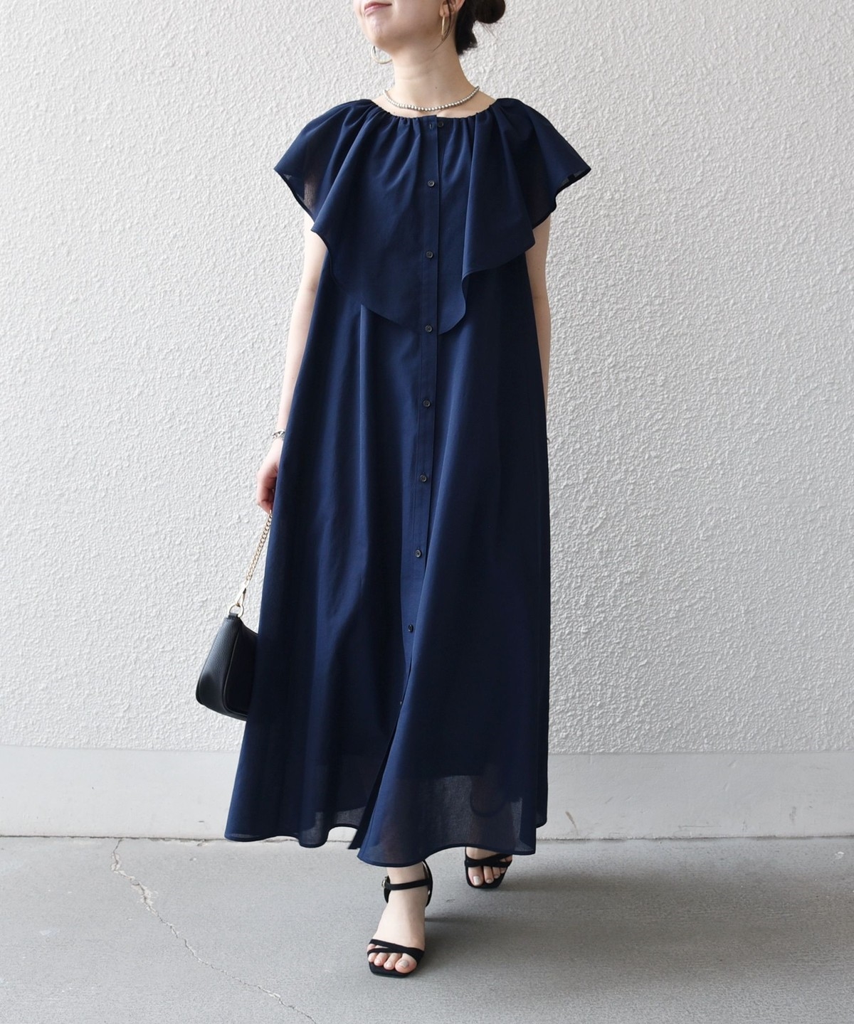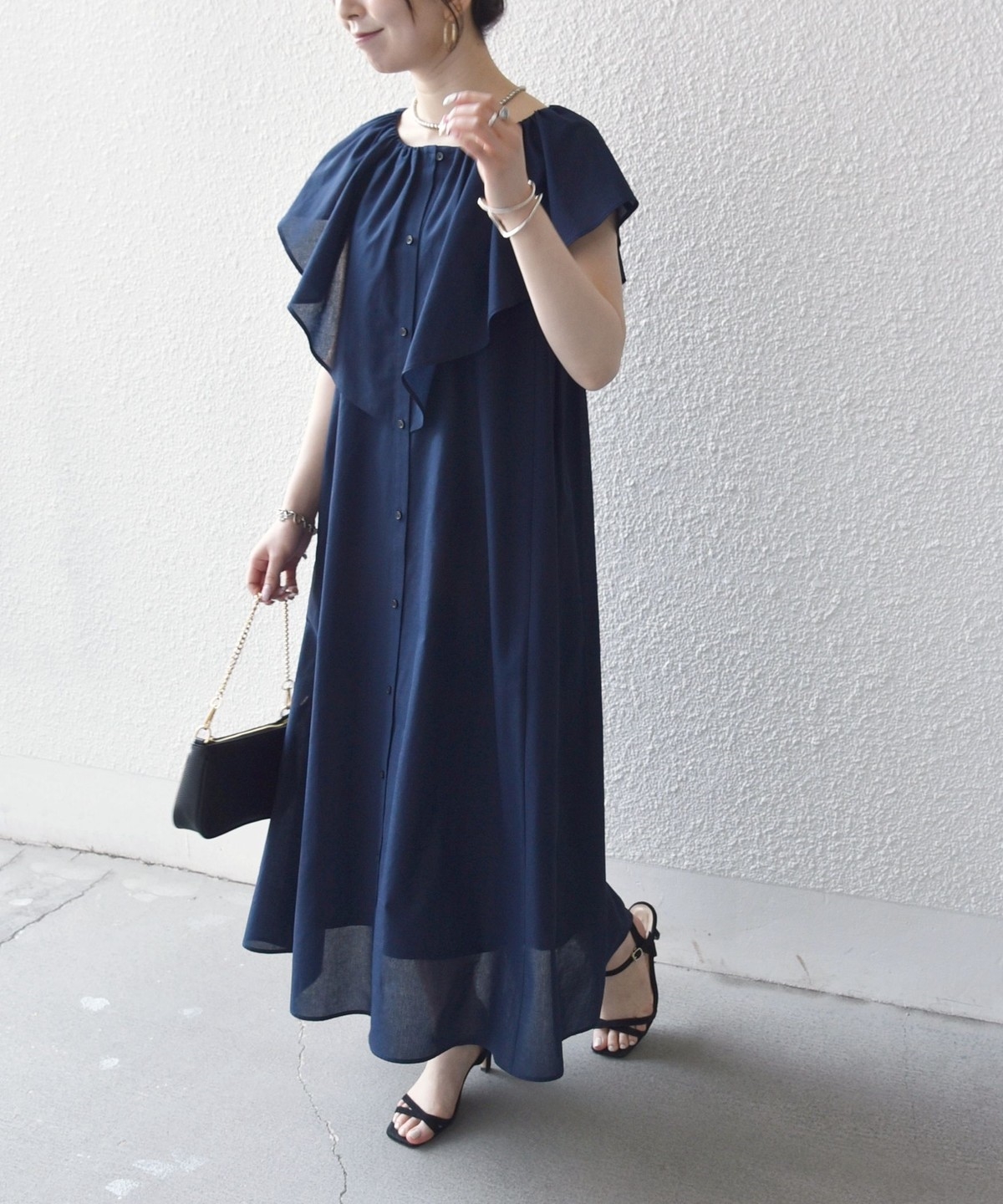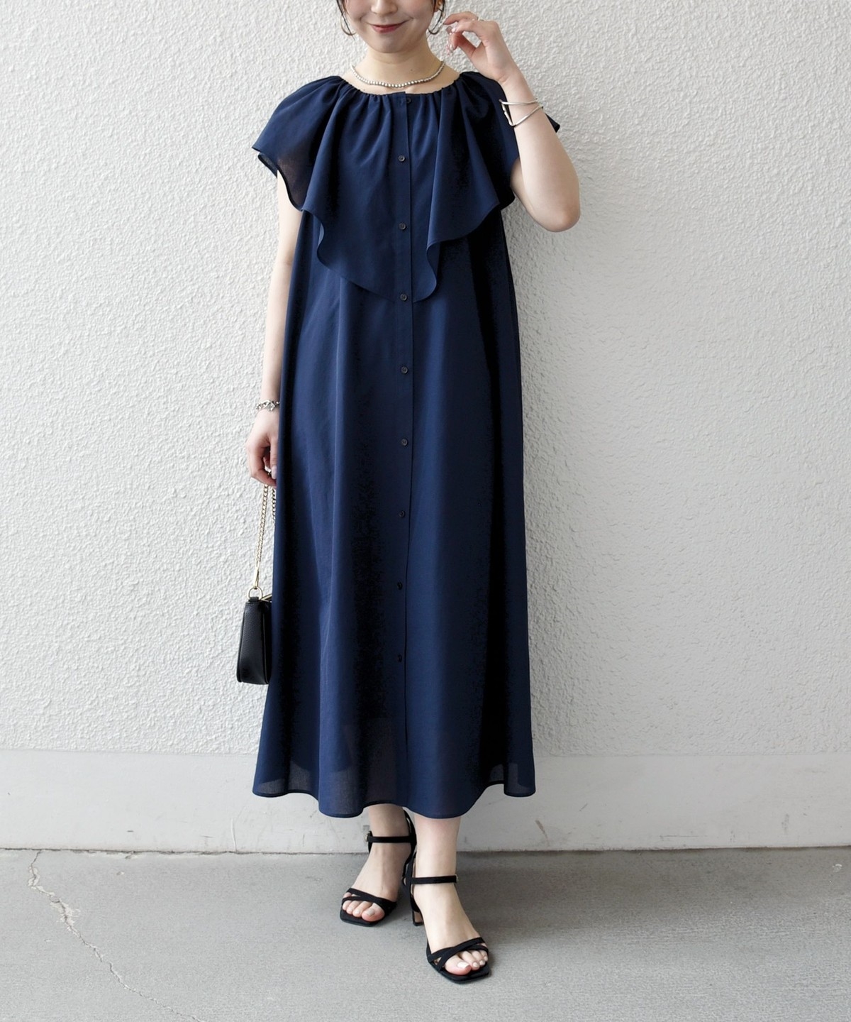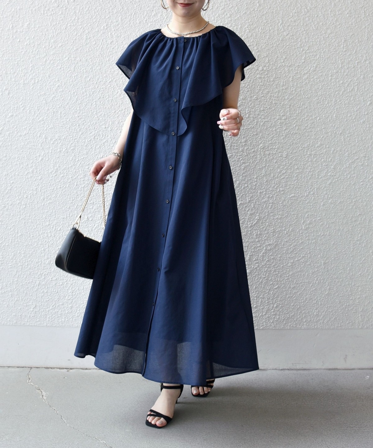美しいラッフルデザインが目を惹くロングワンピース。