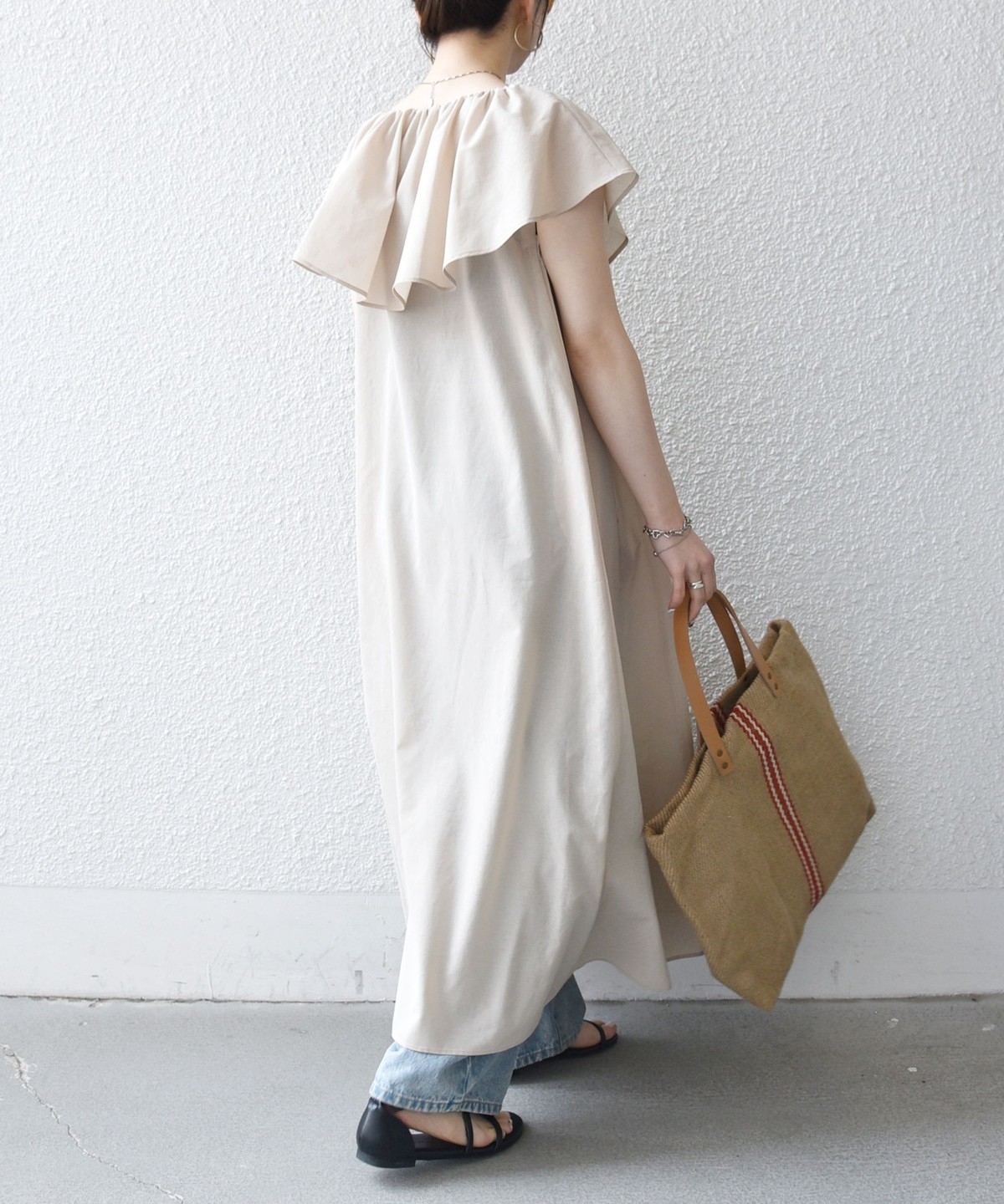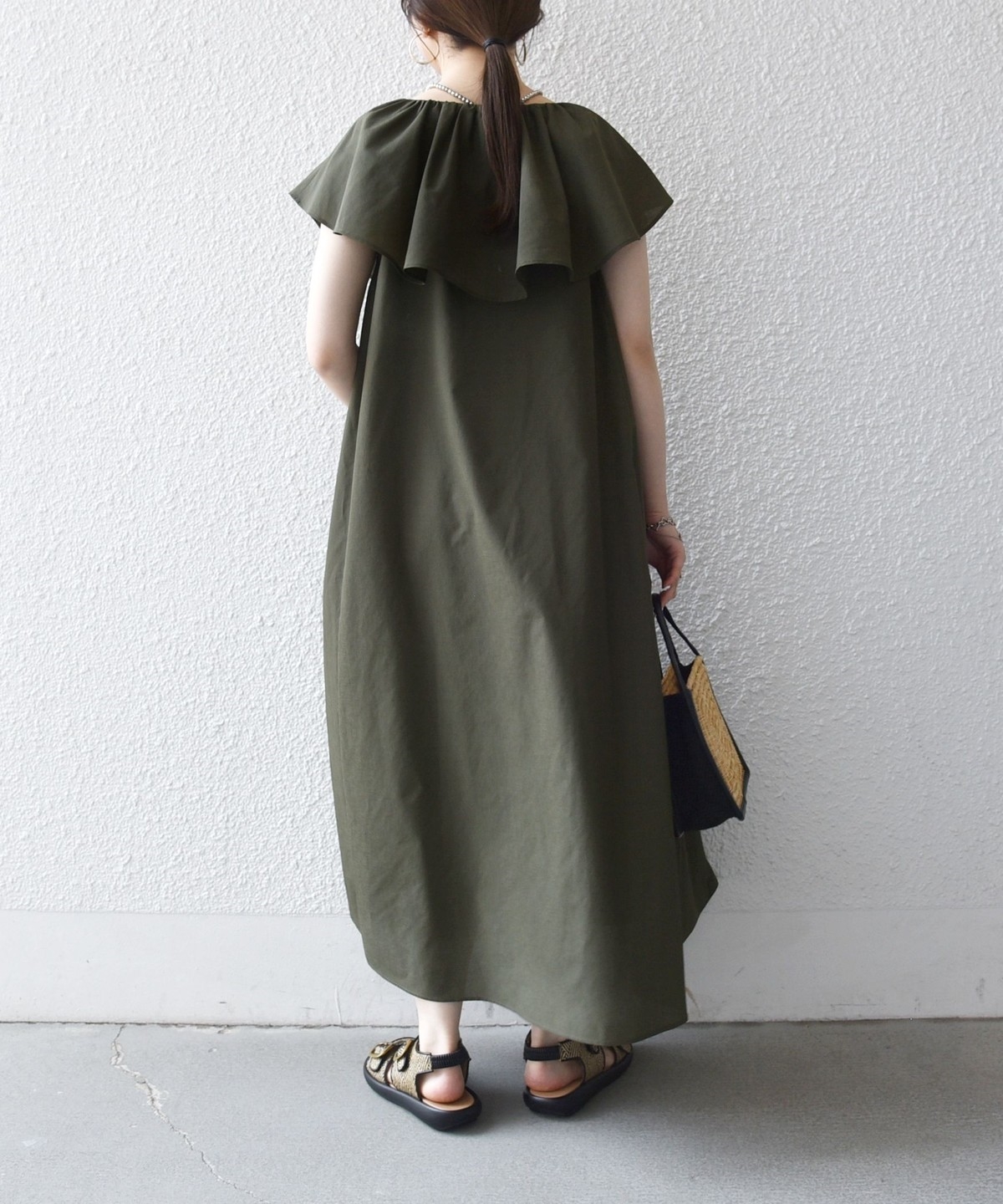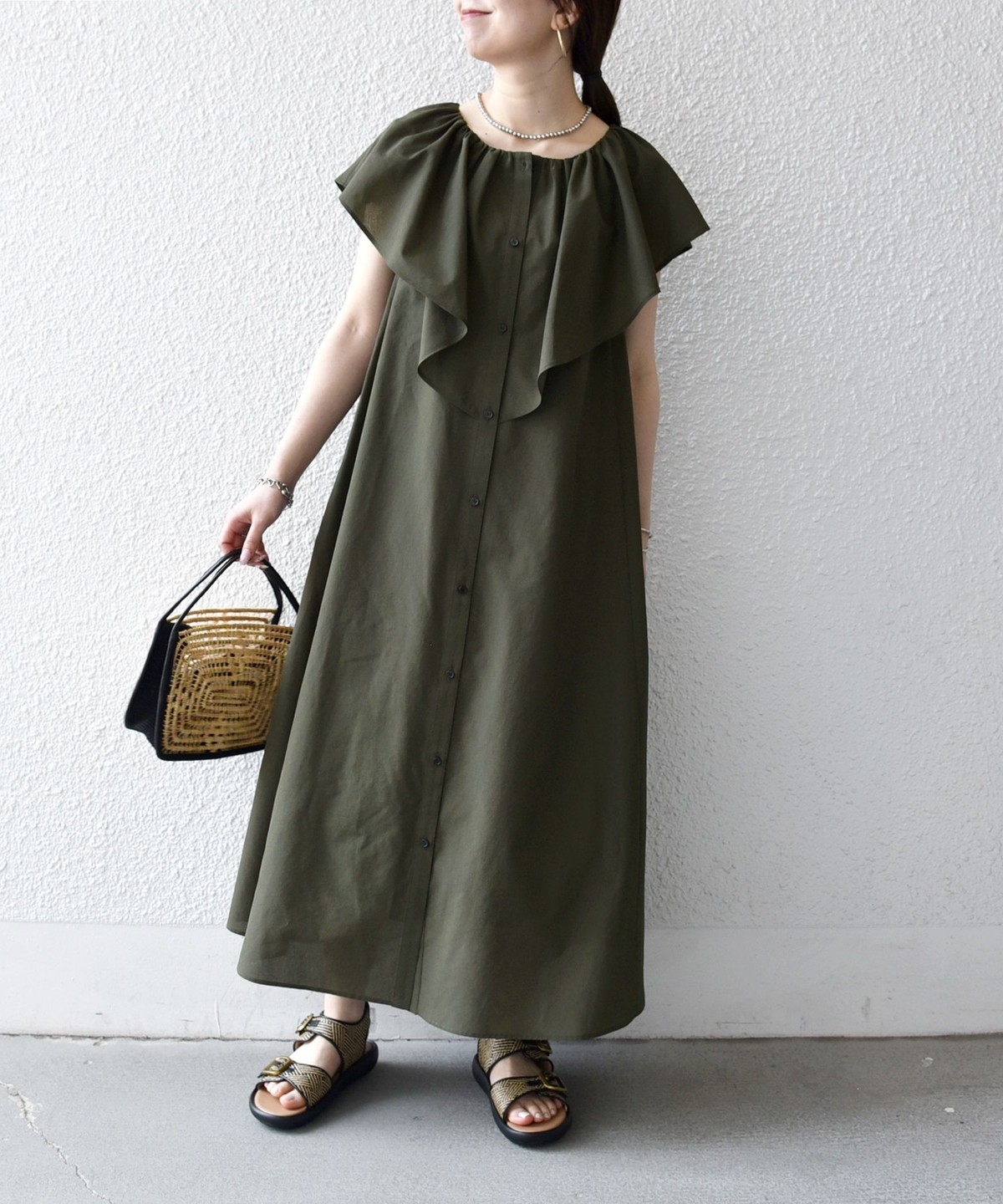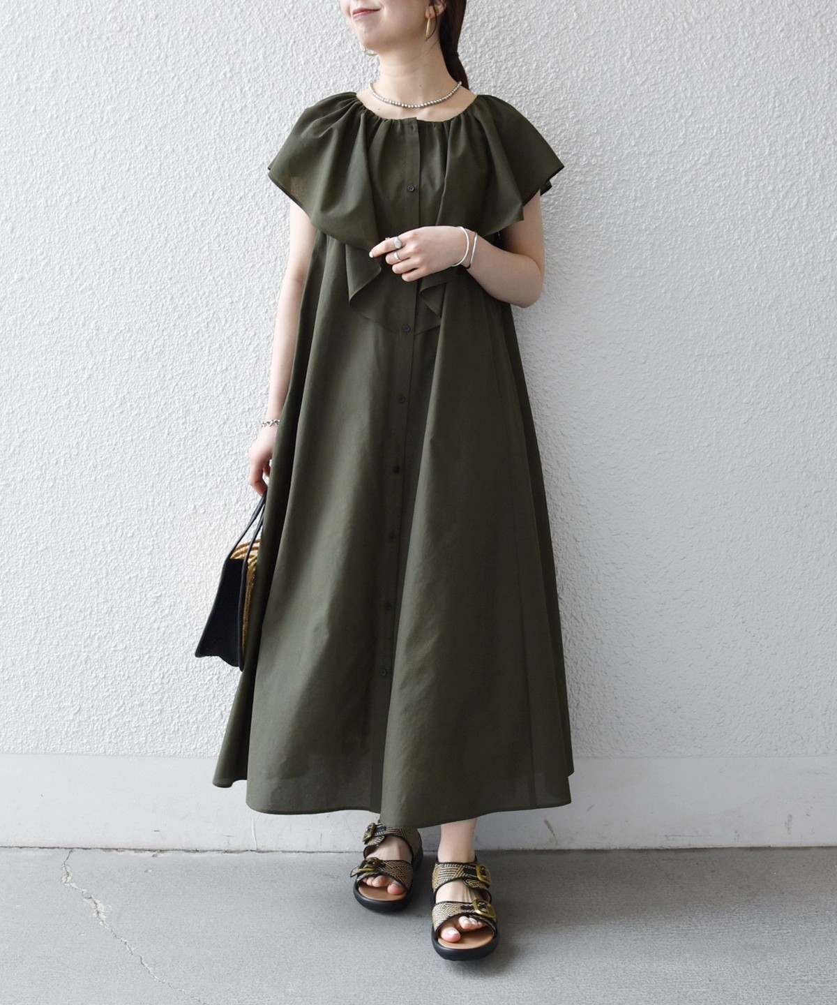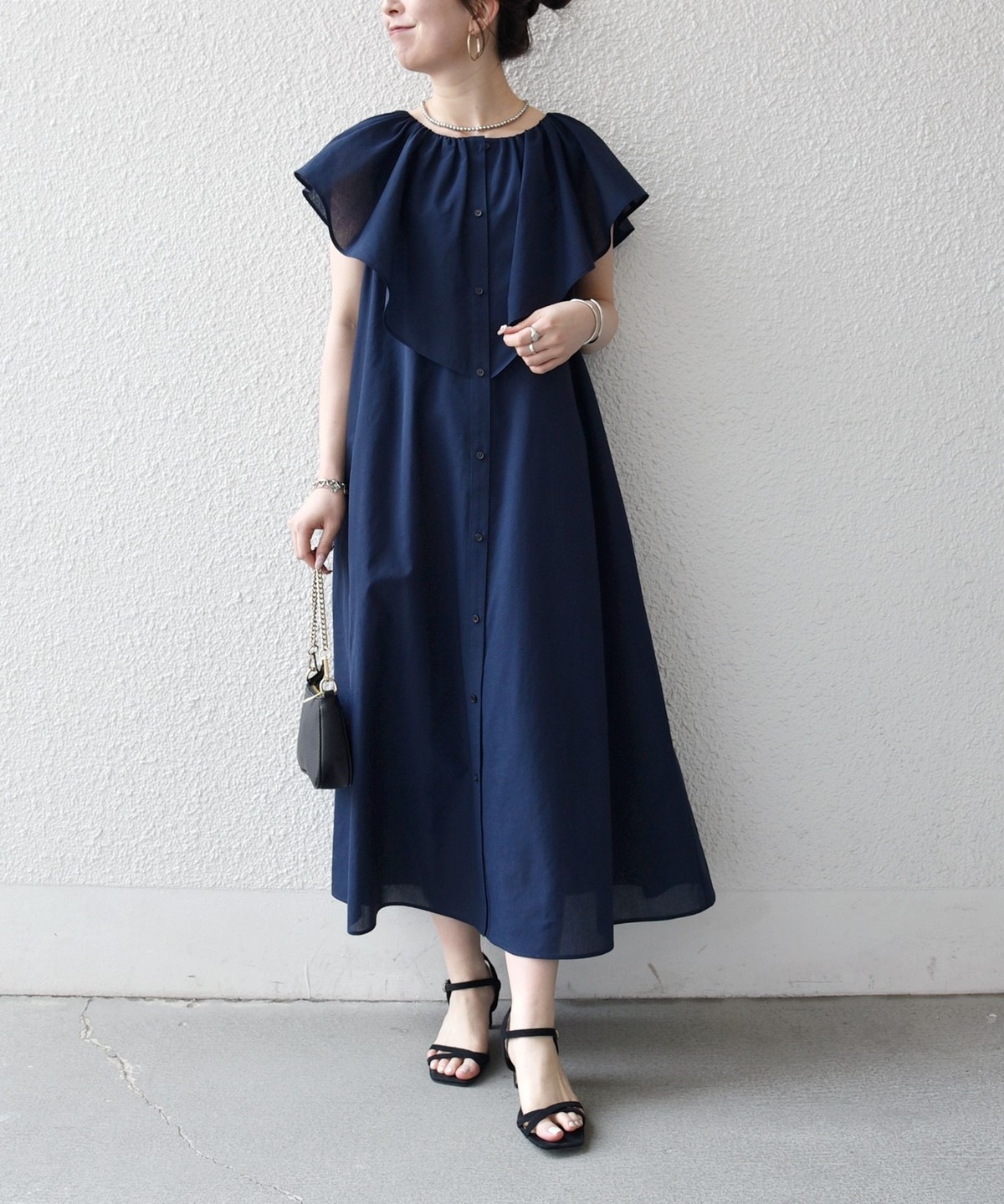 美しいラッフルデザインが目を惹くロングワンピース。