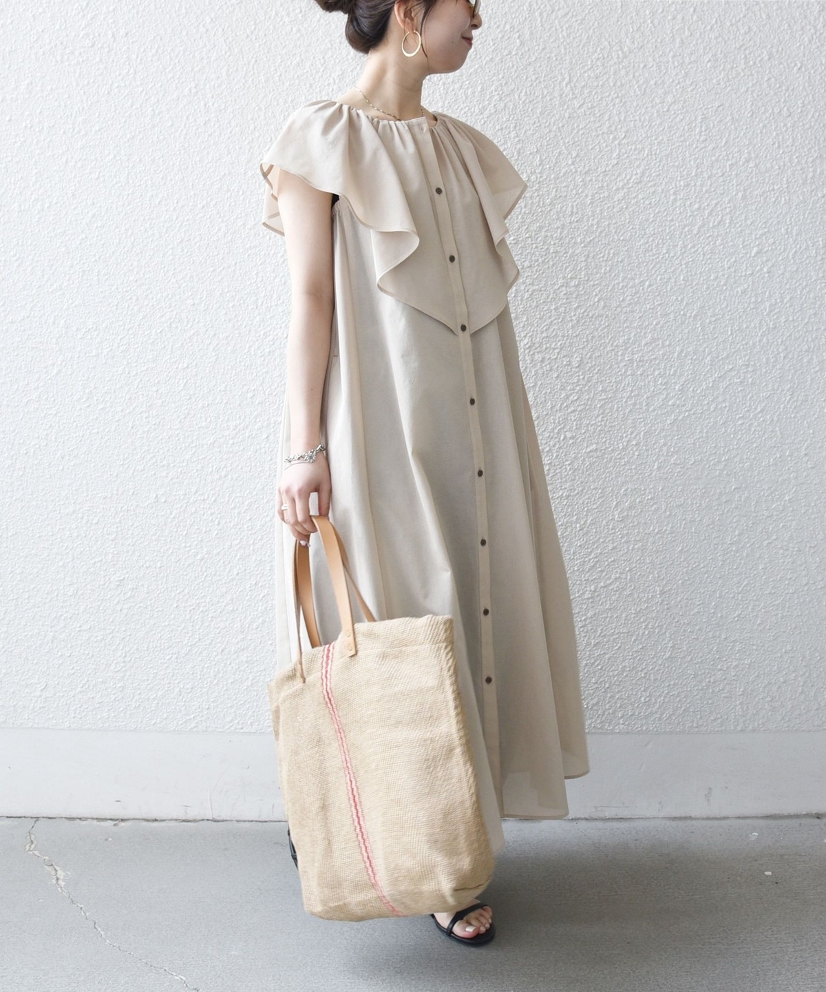 顔まわりを華やかに演出する大きめのフリルは、肩を包み込むようなシルエットで、気になる二の腕をさりげなくカバーしてくれます。