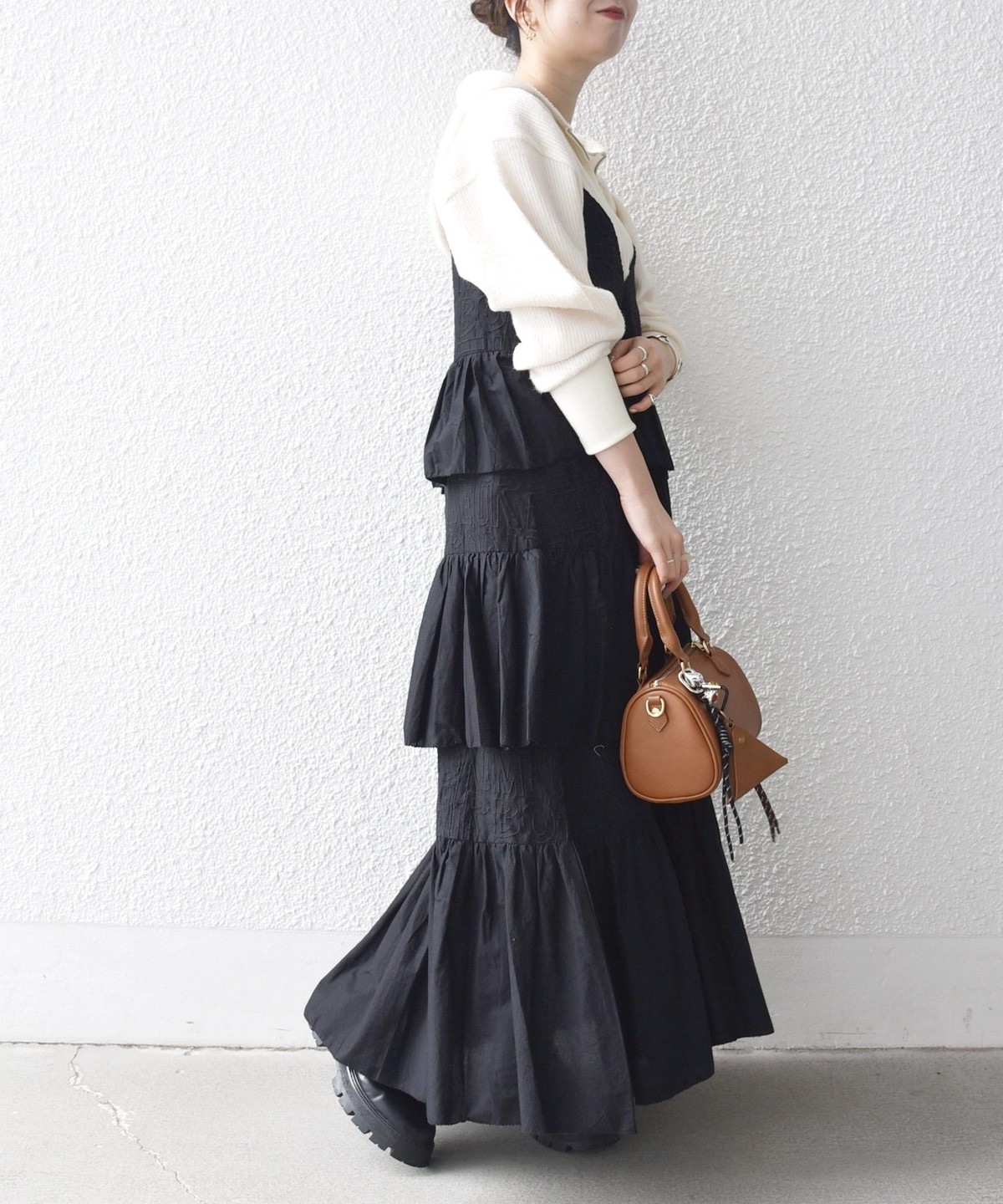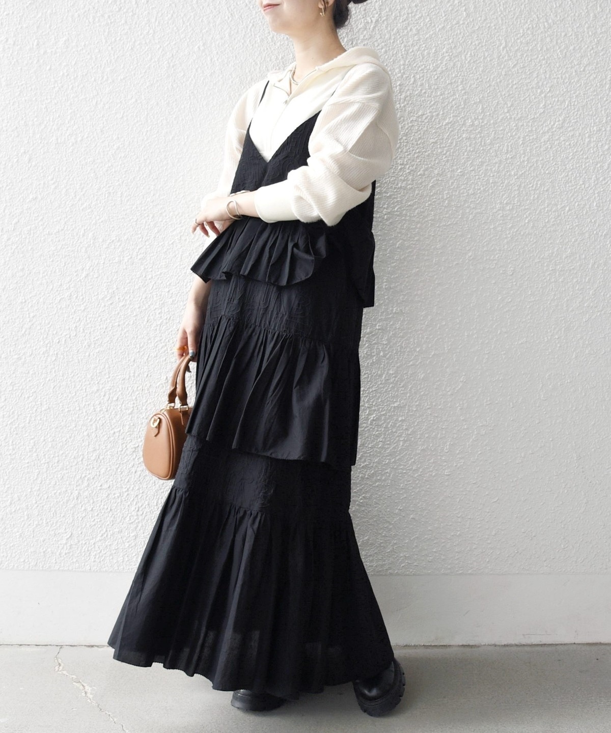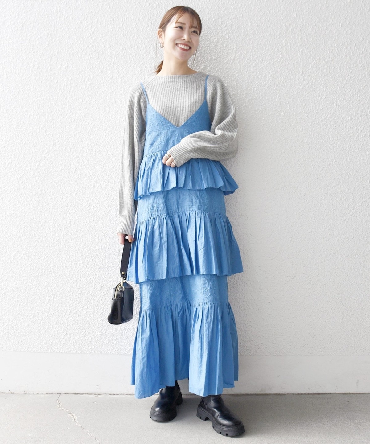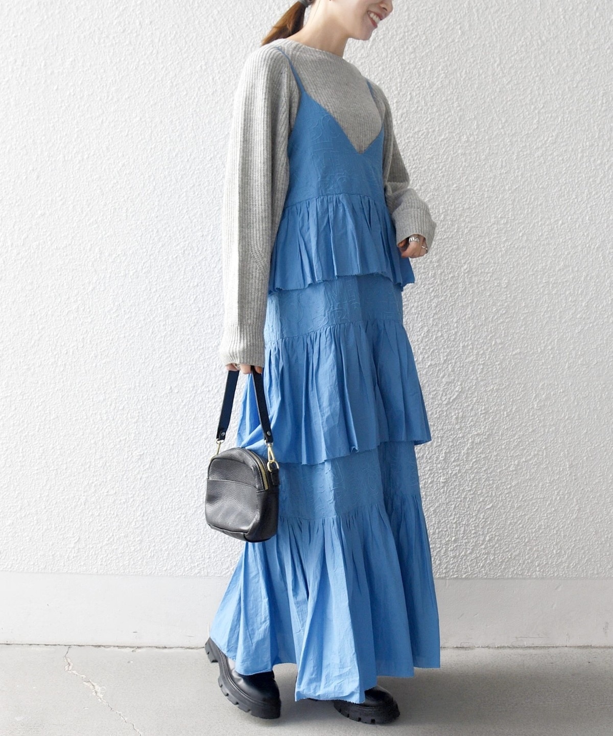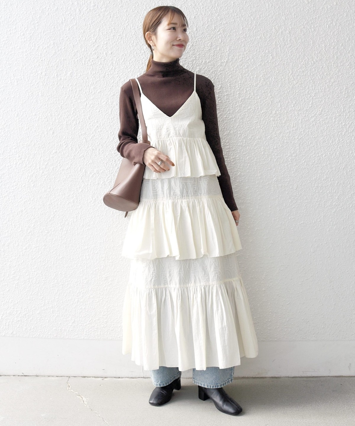 肩紐を長くすることで、ニットや中肉のトップスとのレイヤードスタイルも楽しめます。