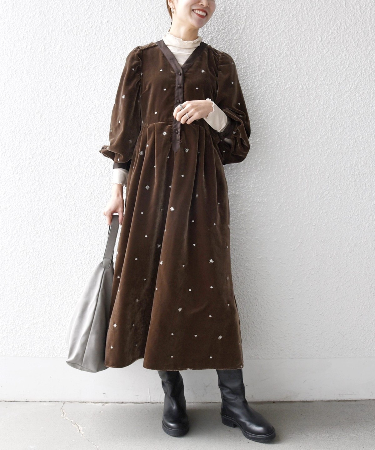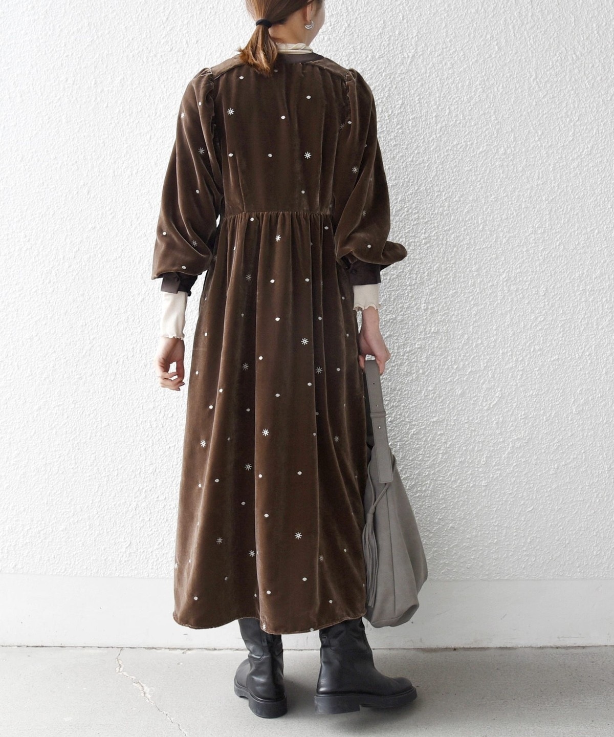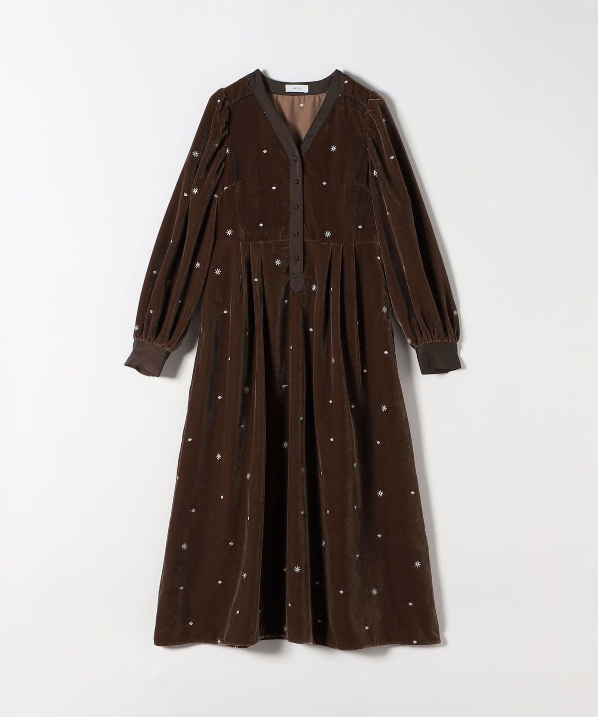 2. 《予約》SHIPS any:〈手洗い可能〉ポリエステル ベロア 刺繍 タック フレア ワンピース ブラウン