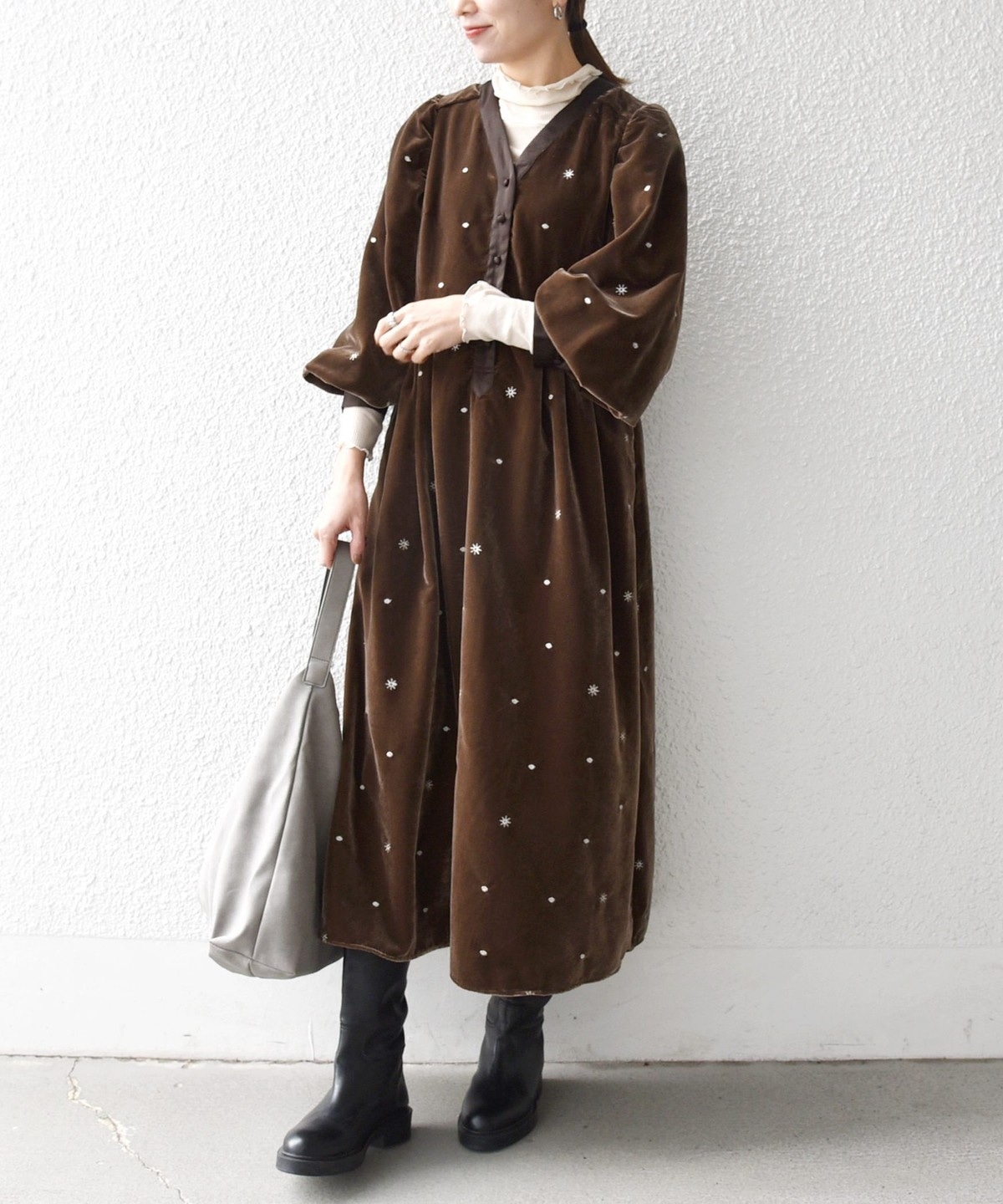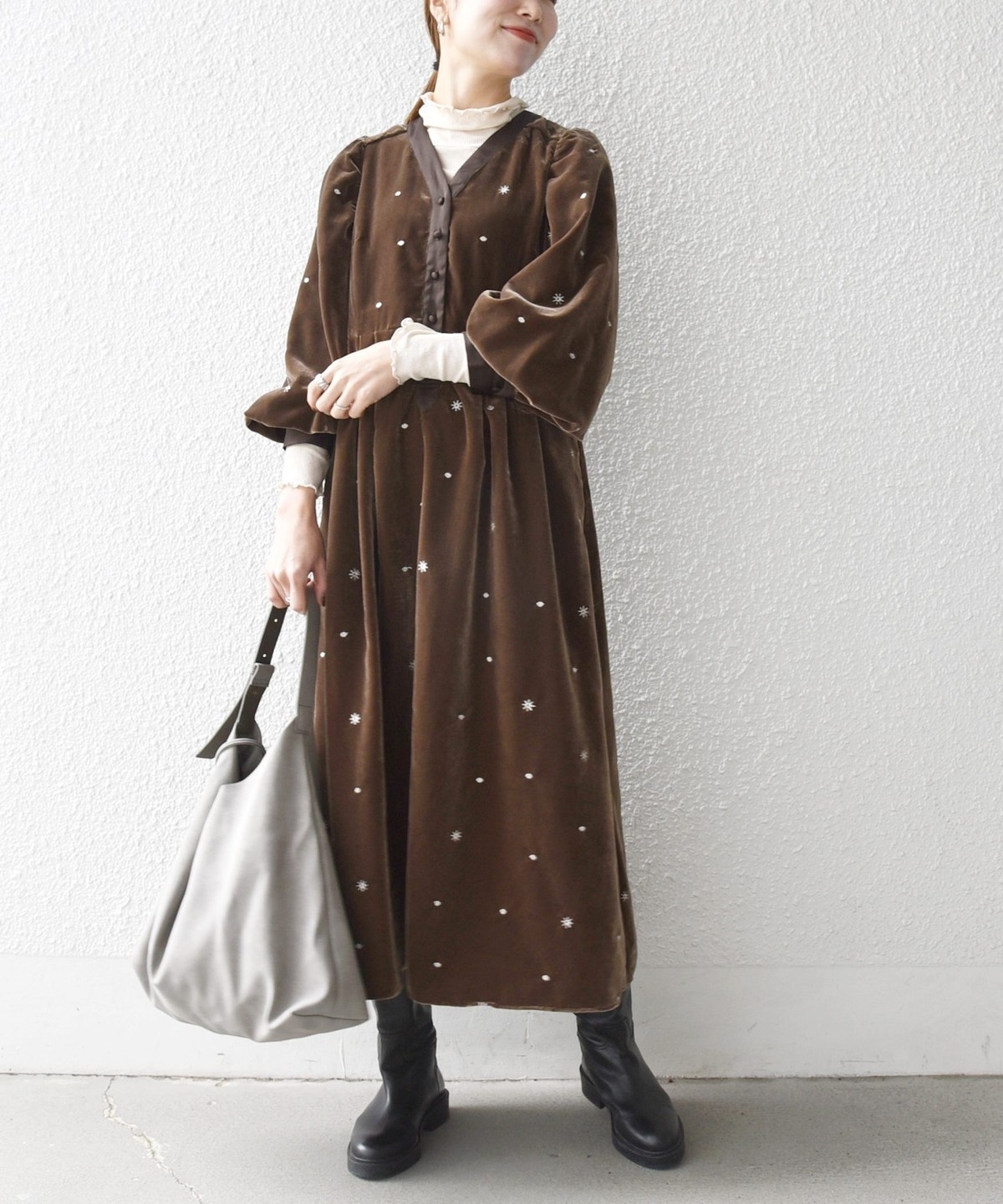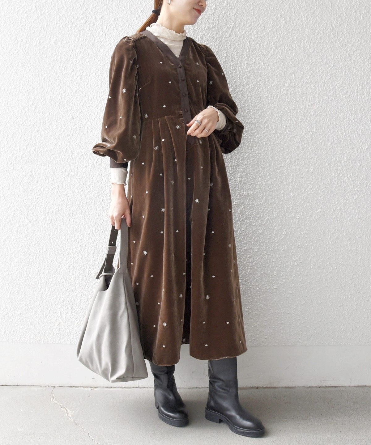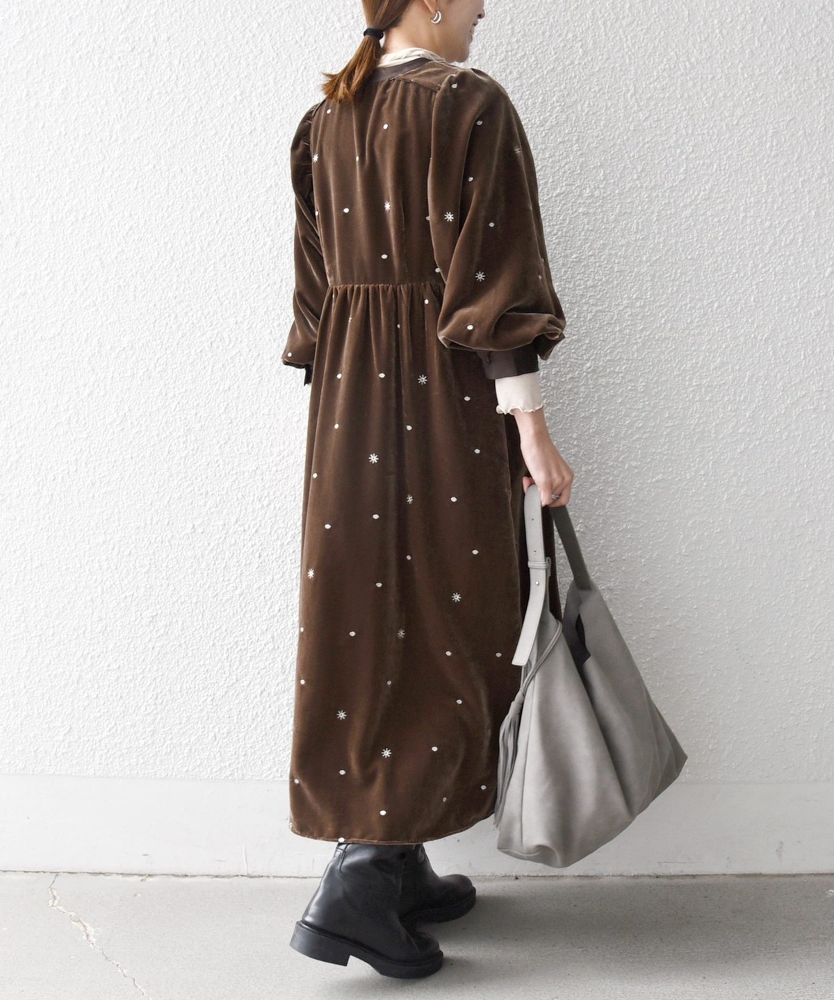 2. 《予約》SHIPS any:〈手洗い可能〉ポリエステル ベロア 刺繍 タック フレア ワンピース ブラウン