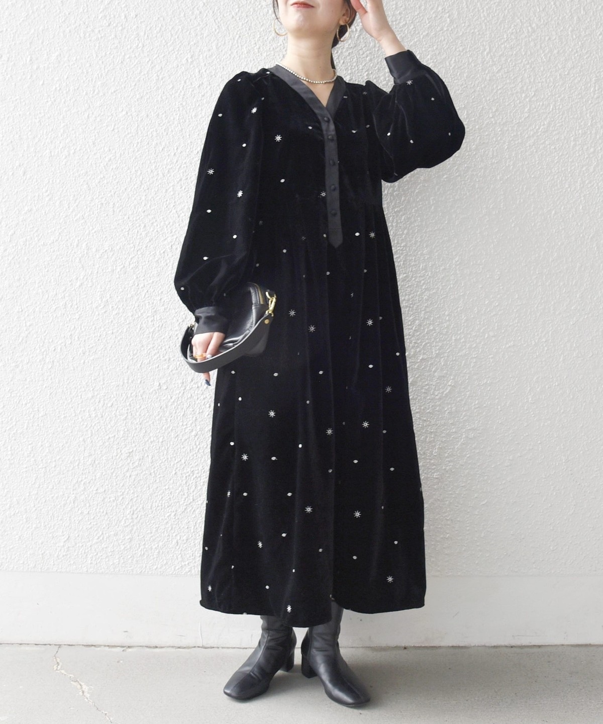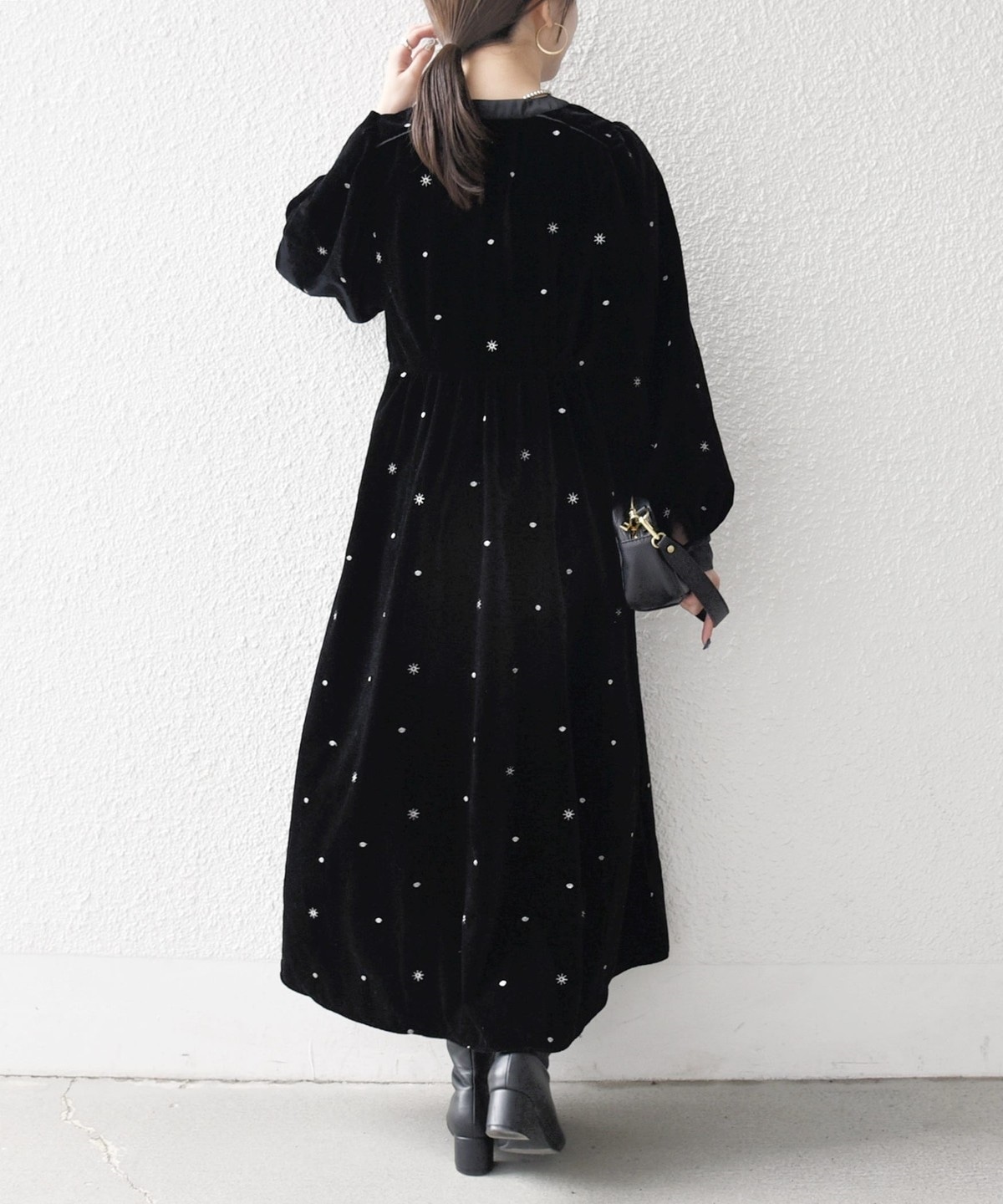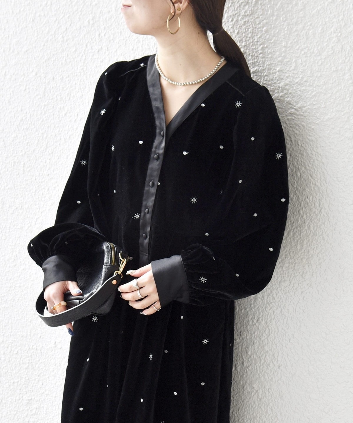 ポリエステルベロアにラメ糸で刺繍を施した、大人可愛いワンピース。
