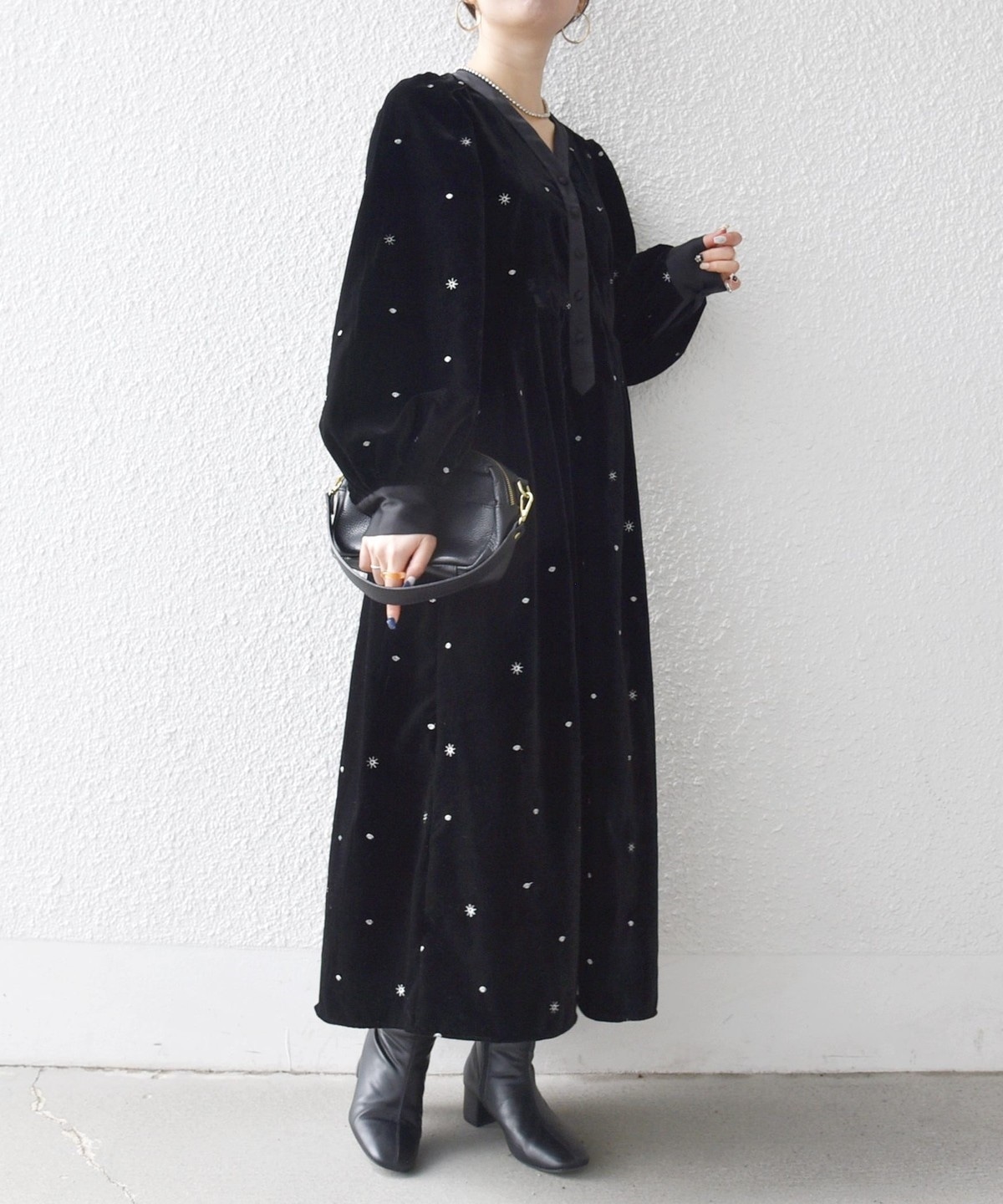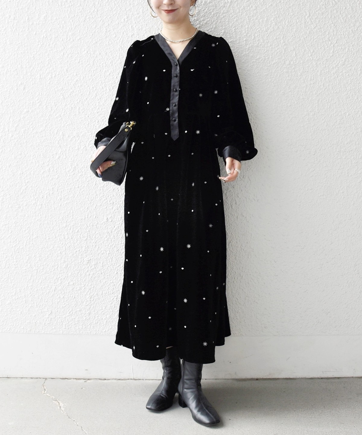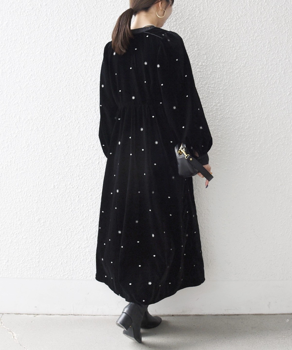 ポリエステルベロアにラメ糸で刺繍を施した、大人可愛いワンピース。