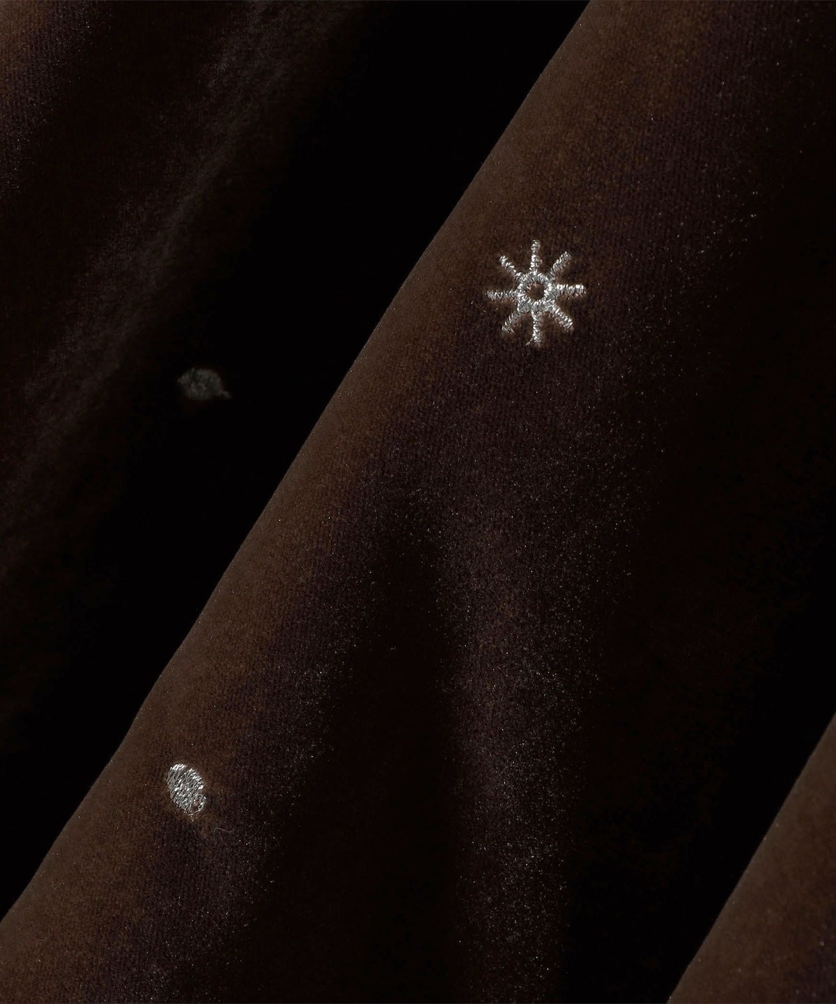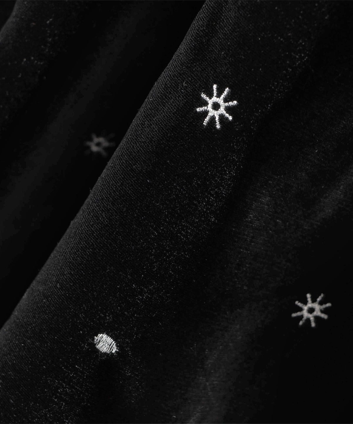 ポリエステルベロアの生地にラメ糸でドットや光のモチーフ刺繍を散りばめています。