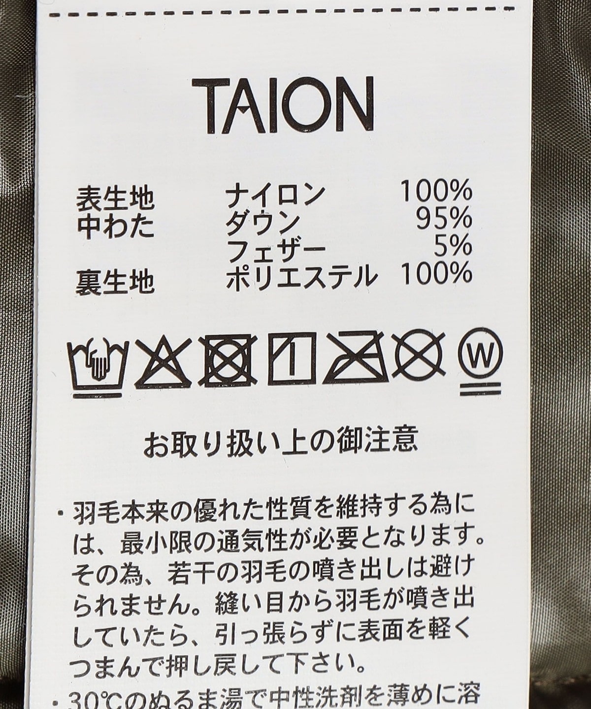 素材:表生地: ナイロン100%, 中わた: ダウン95%, フェザー5%, 裏生地: ポリエステル100%
