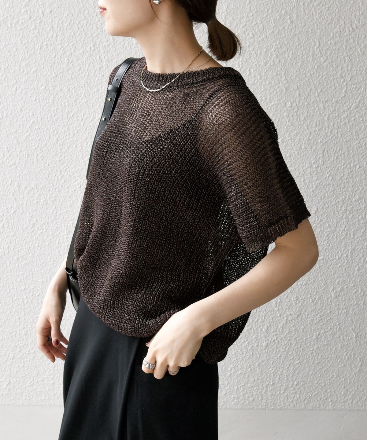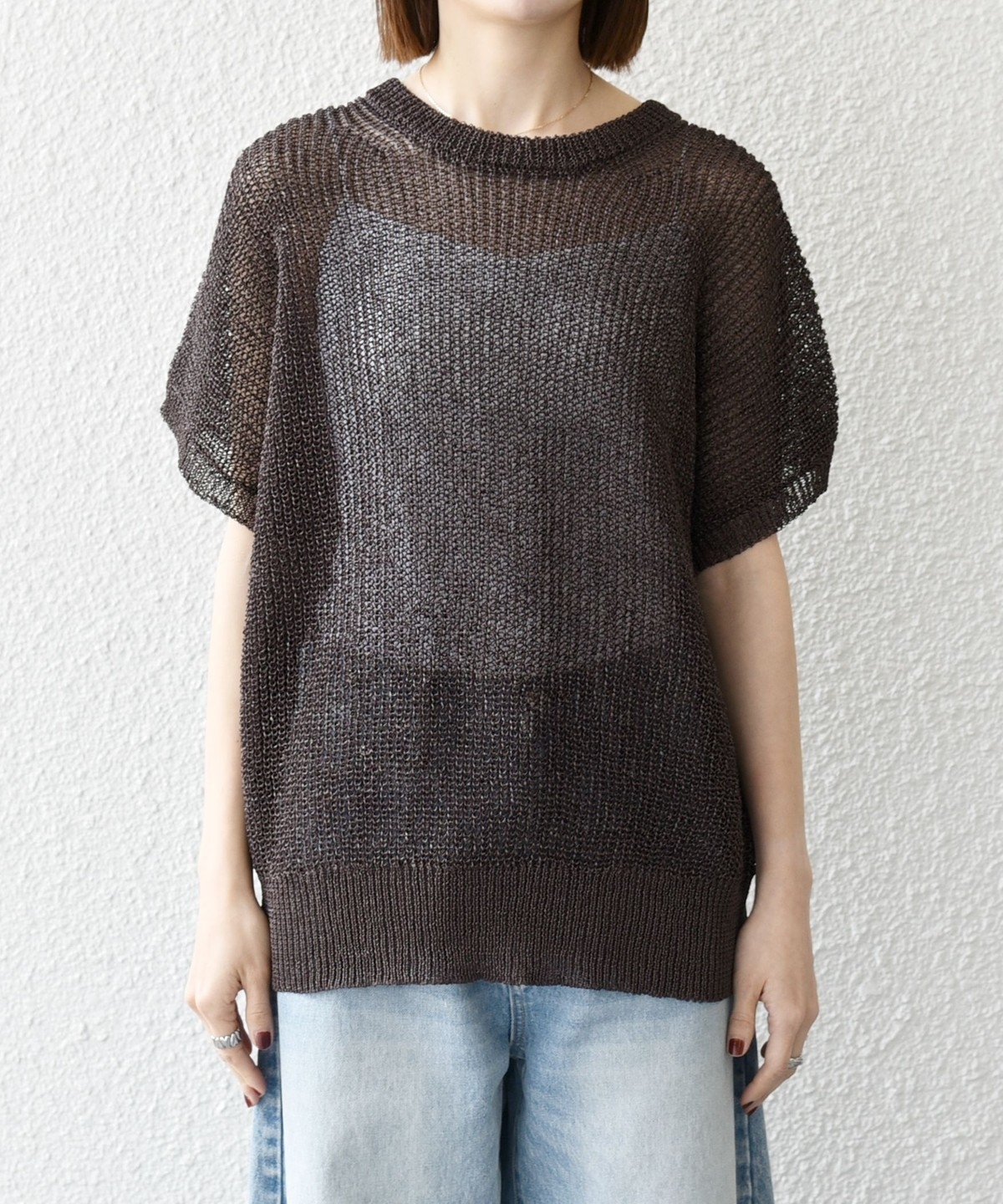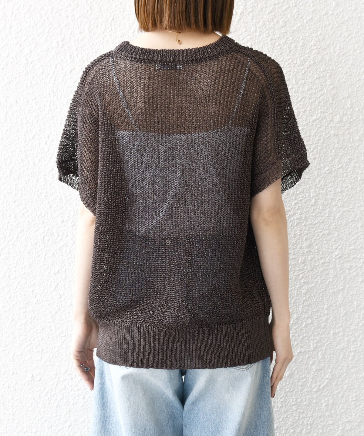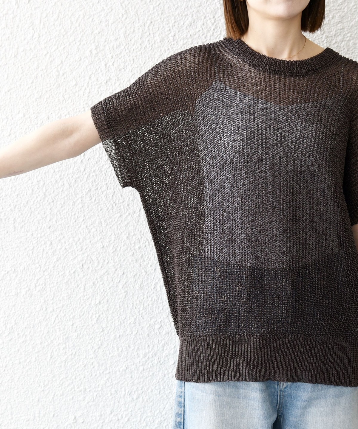 首元は開きすぎないクルーネックで、シアー素材ながらも安心感があって◎