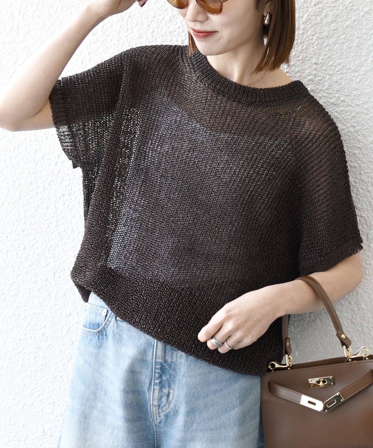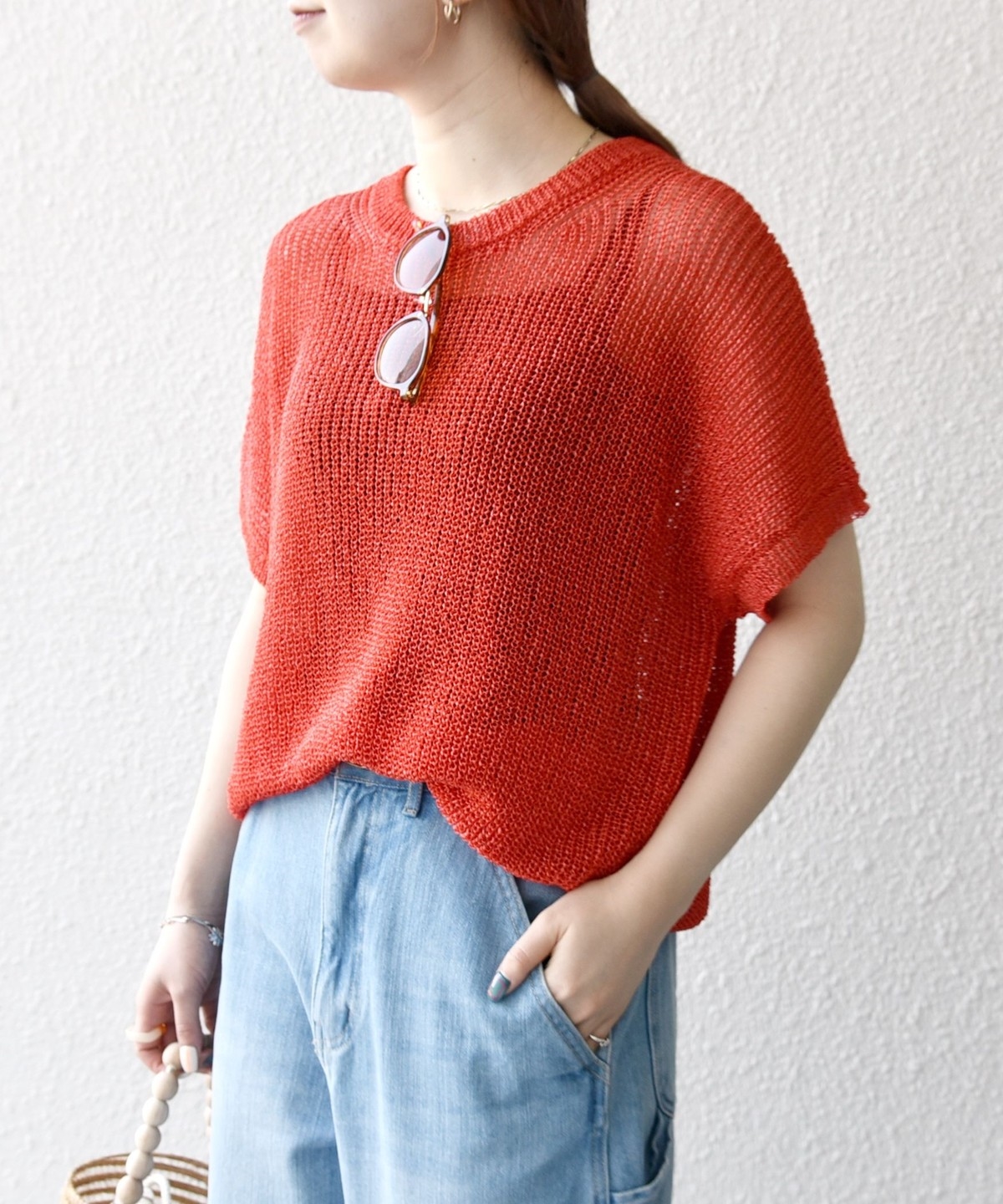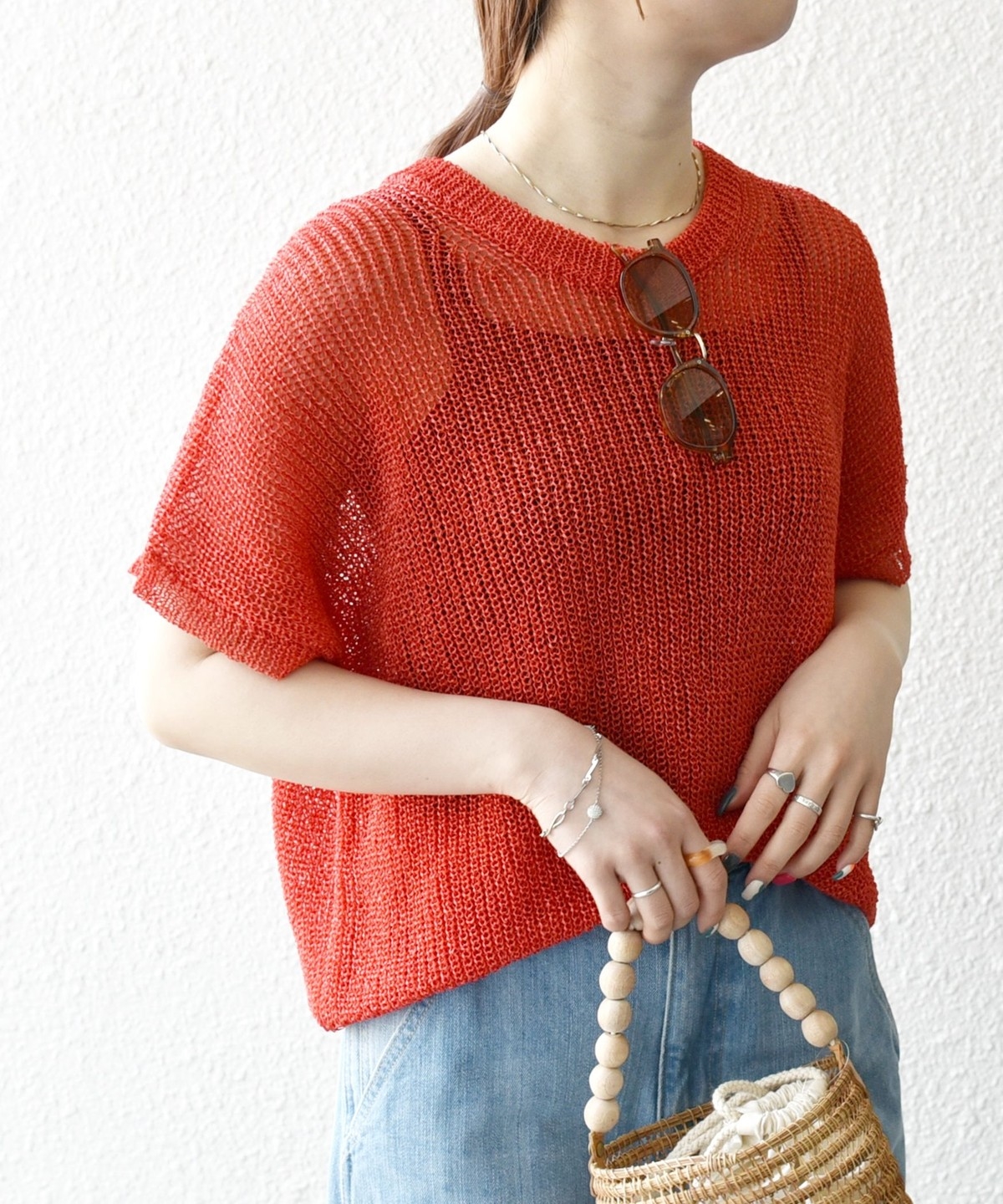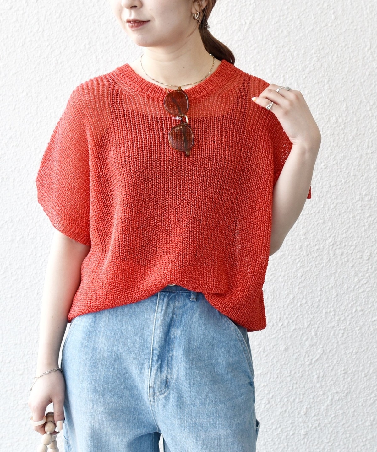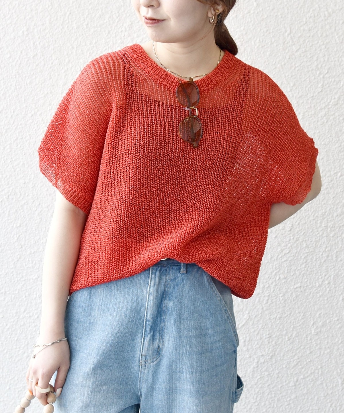 首元は開きすぎないクルーネックで、シアー素材ながらも安心感があって◎