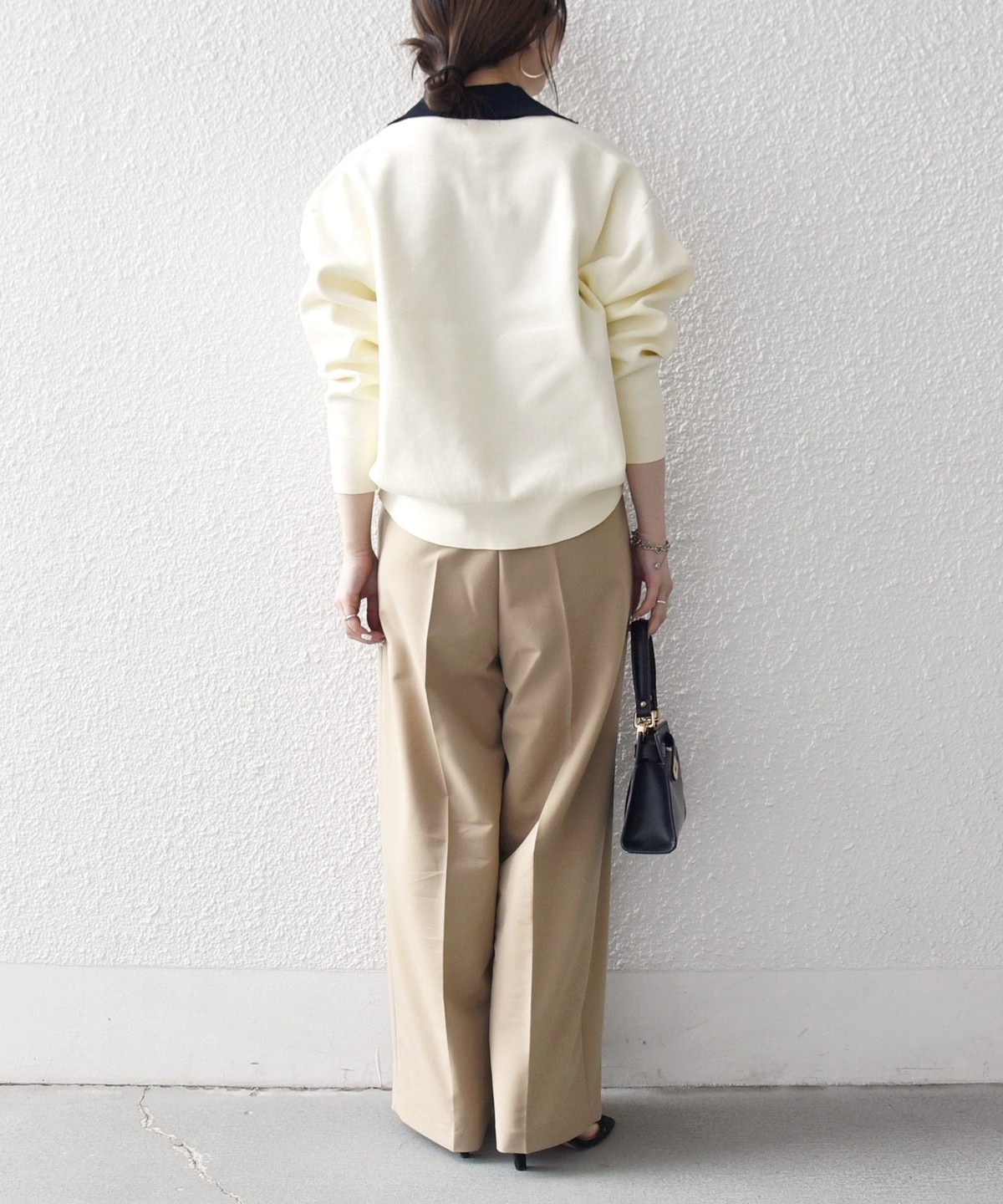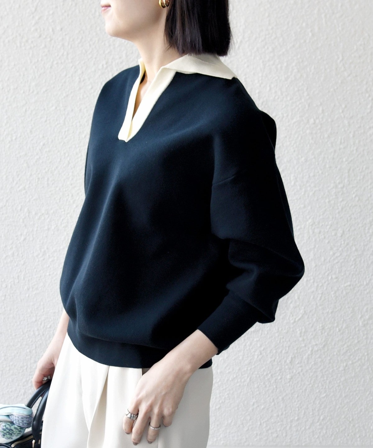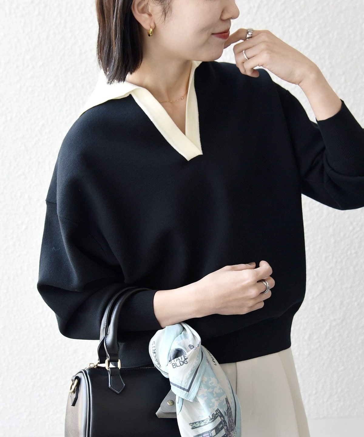 Vネックとセーラーカラー風の大きめ襟で、顔まわりをスッキリ見せてくれるのも嬉しいポイント◎