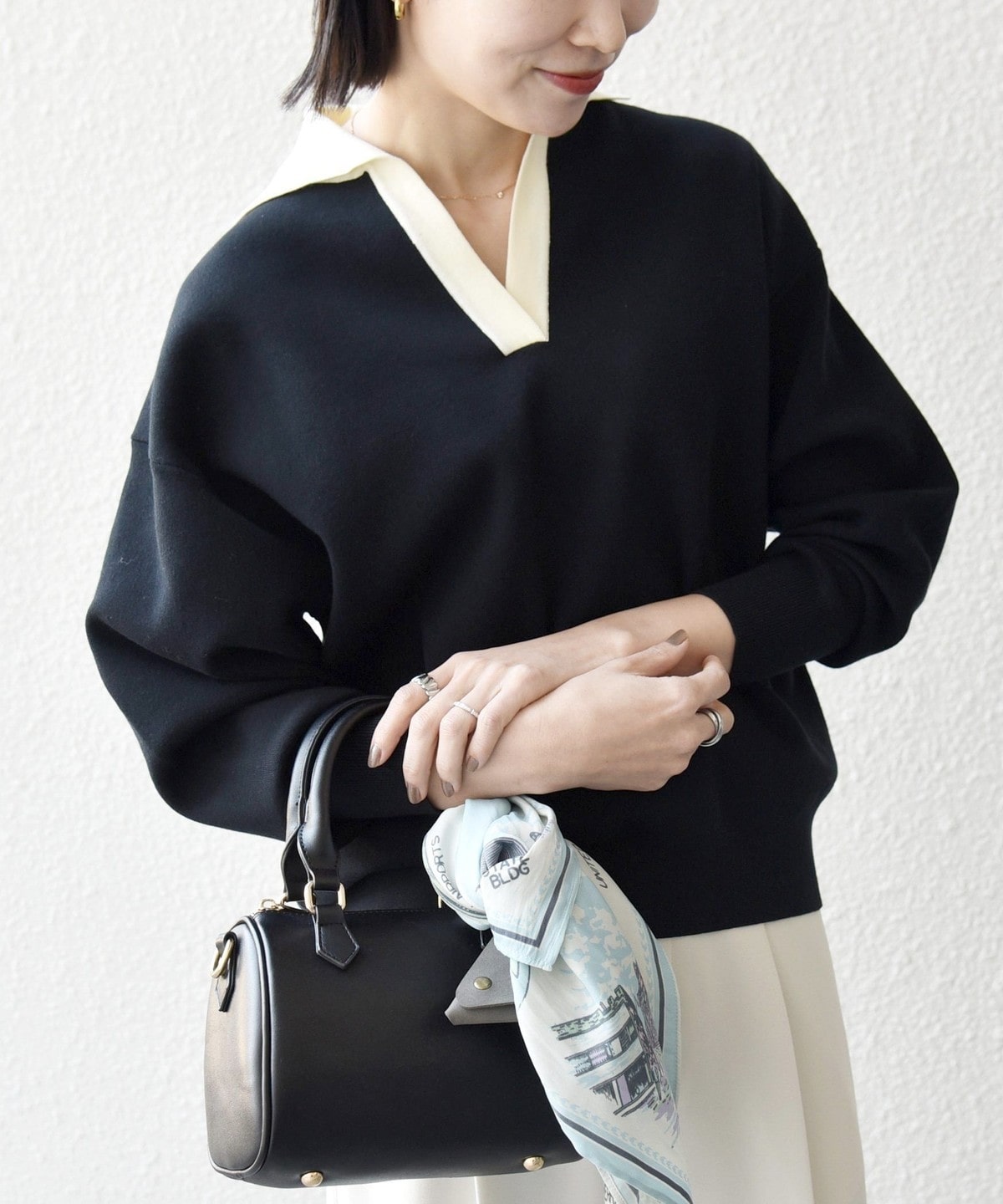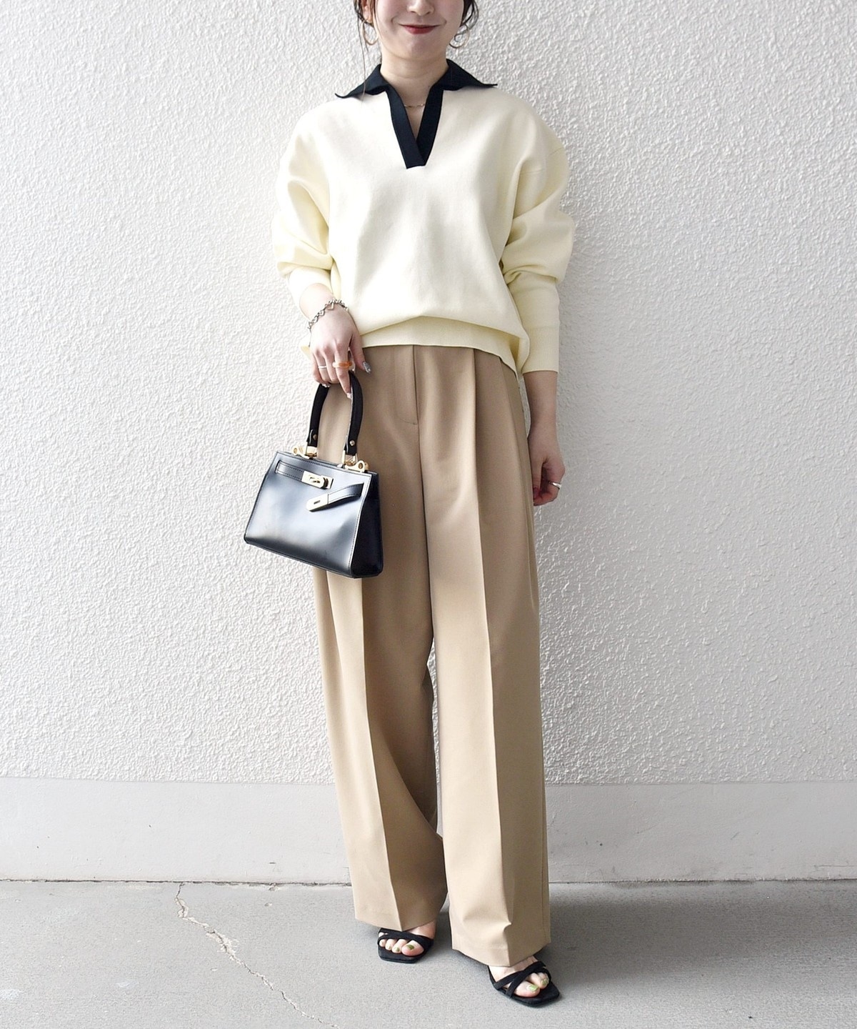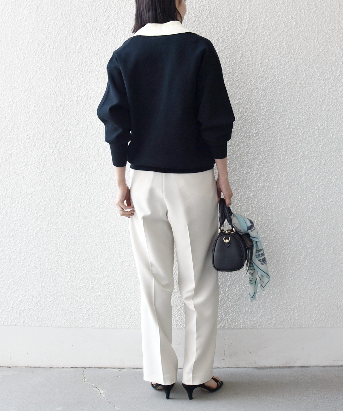 Vネックとセーラーカラー風の大きめ襟で、顔まわりをスッキリ見せてくれるのも嬉しいポイント◎