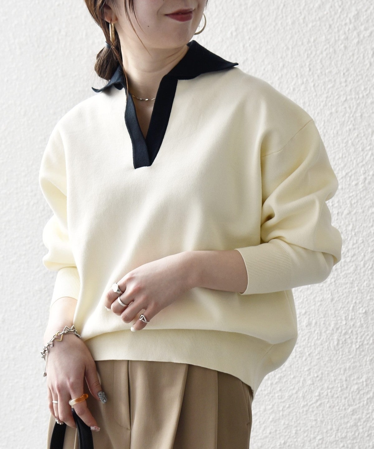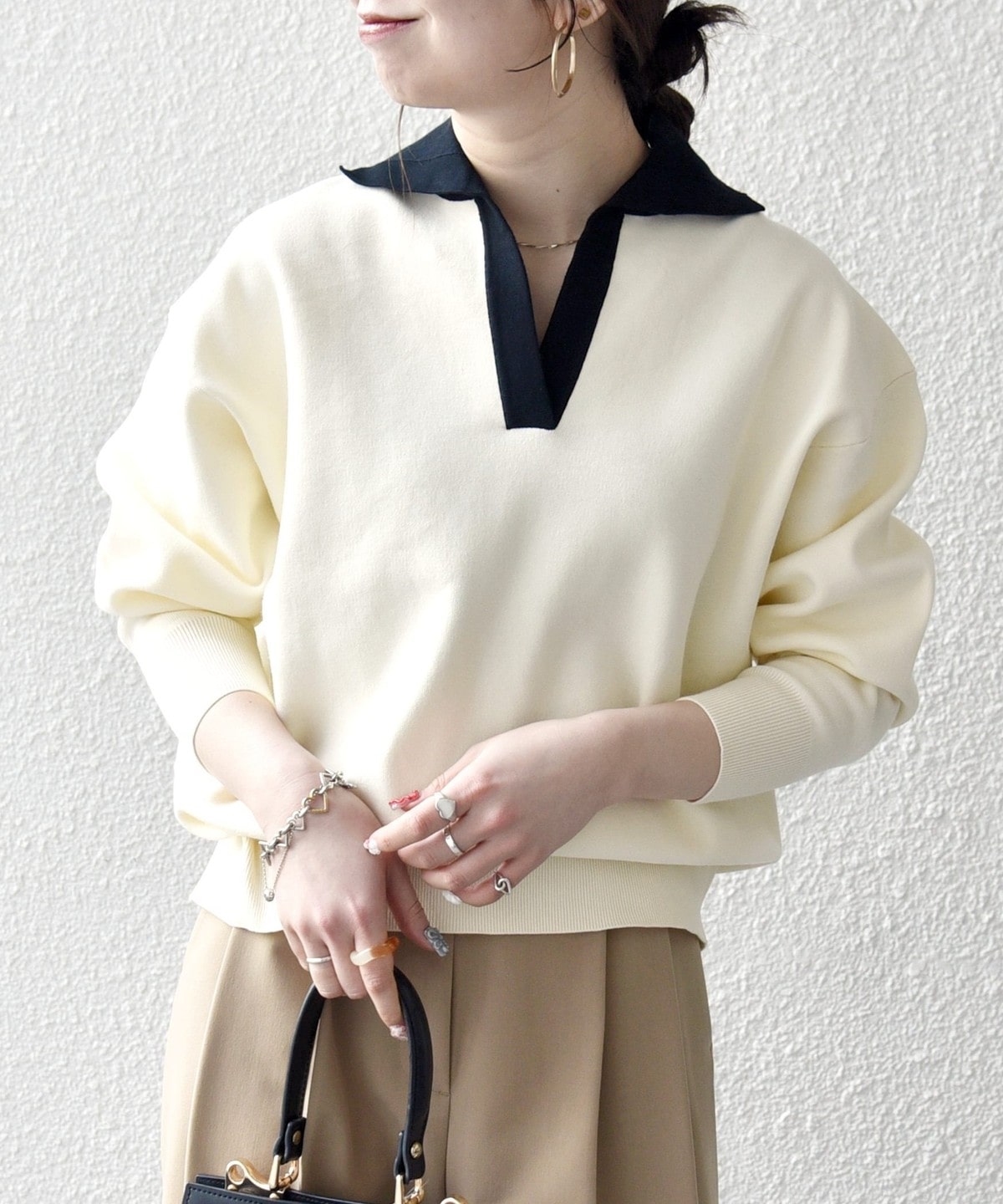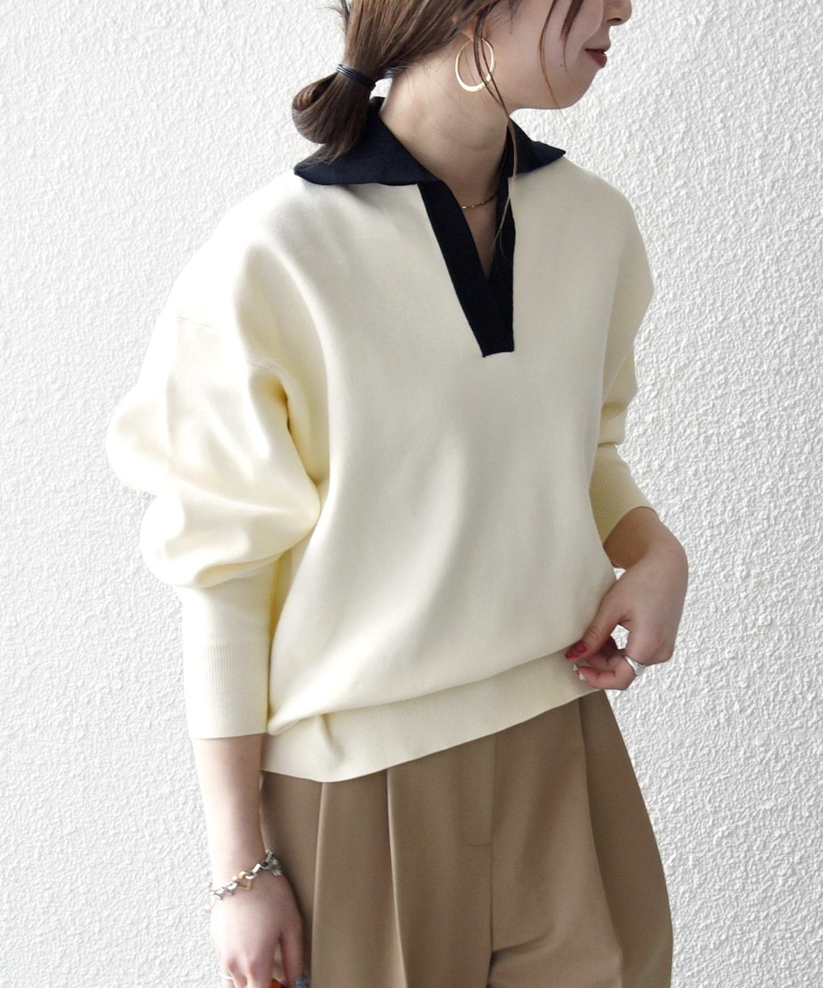 襟元のスキッパーネックがポイントになった、抜け感のある春ニット。