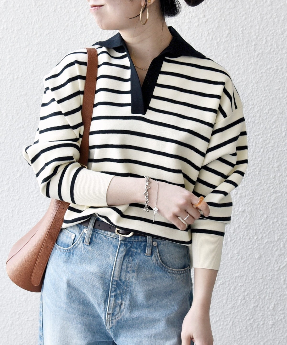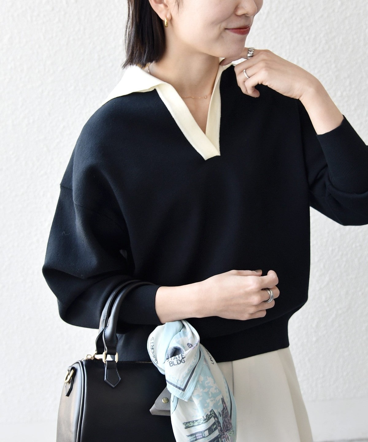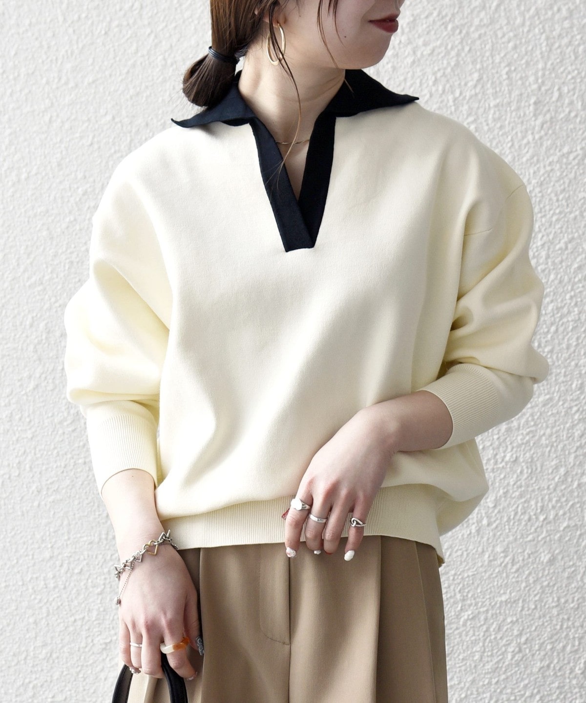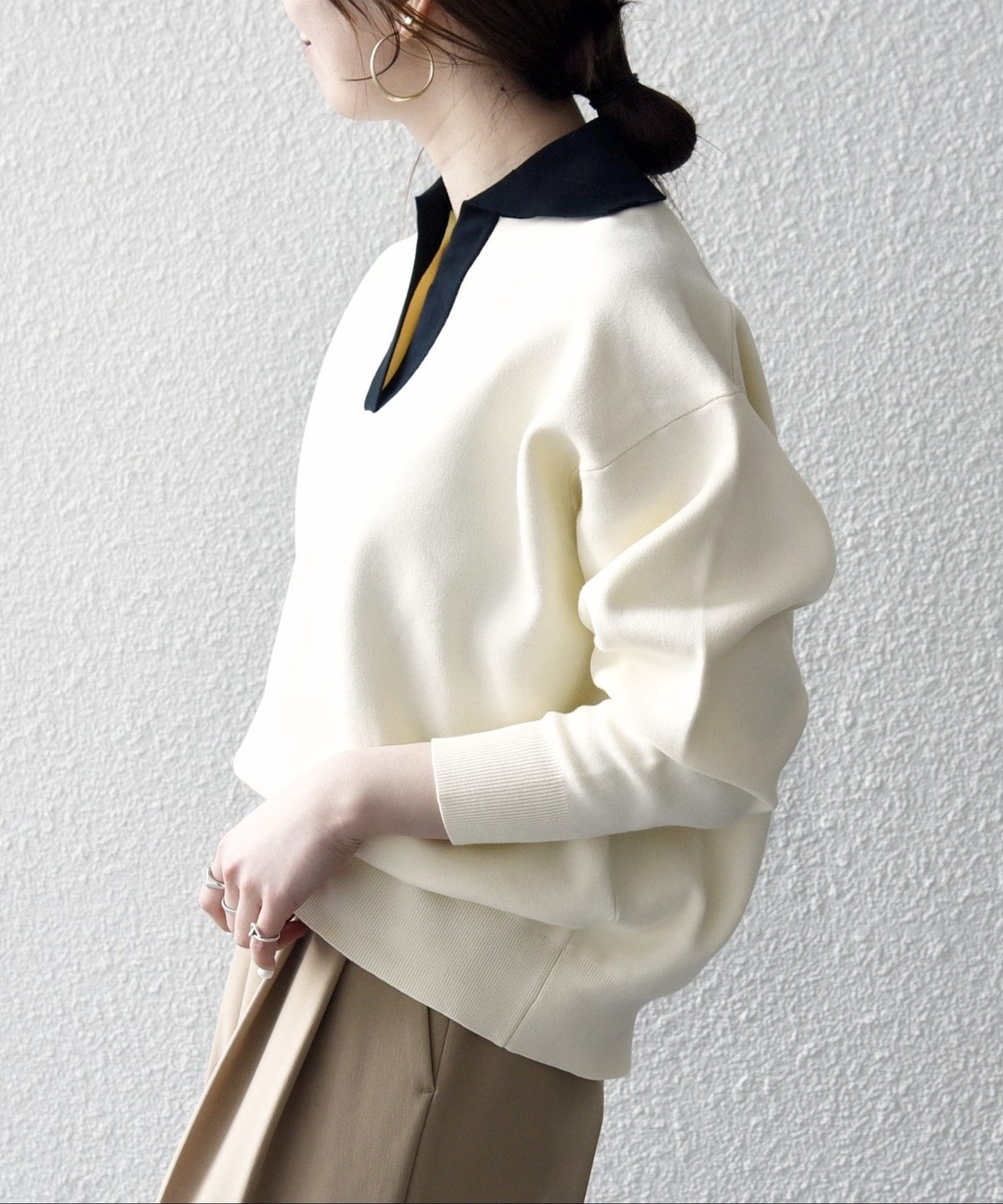 襟元のスキッパーネックがポイントになった、抜け感のある春ニット。